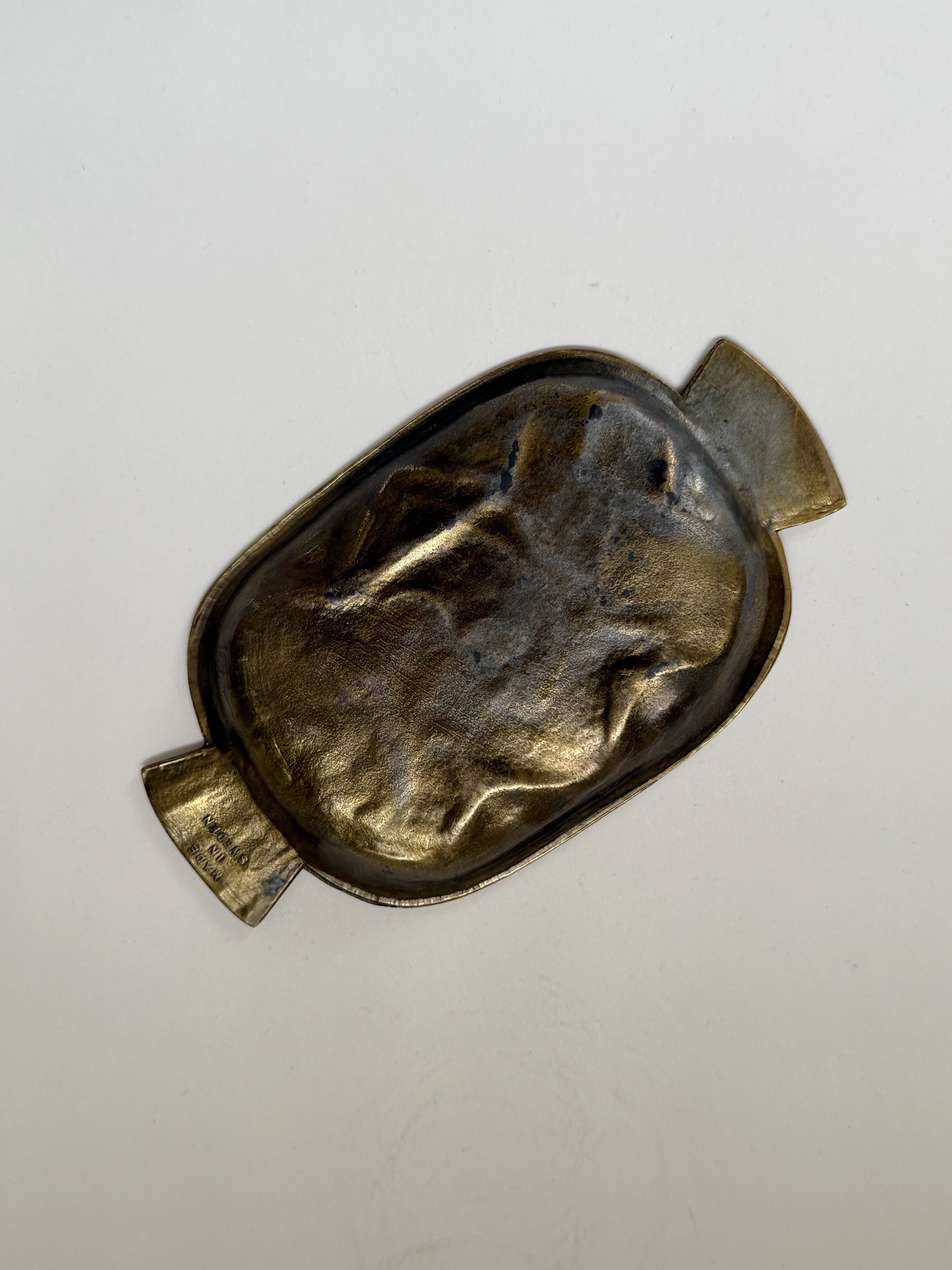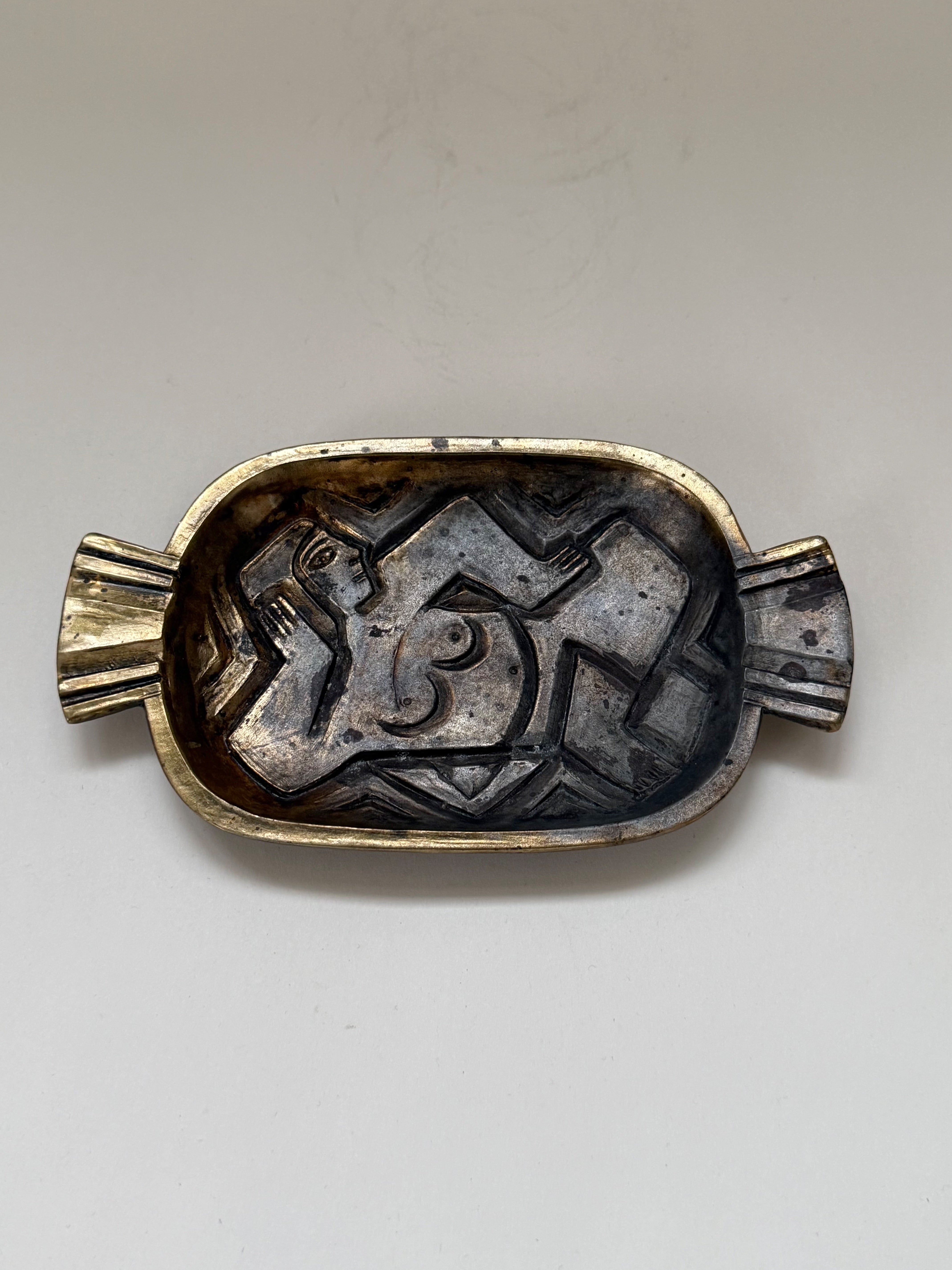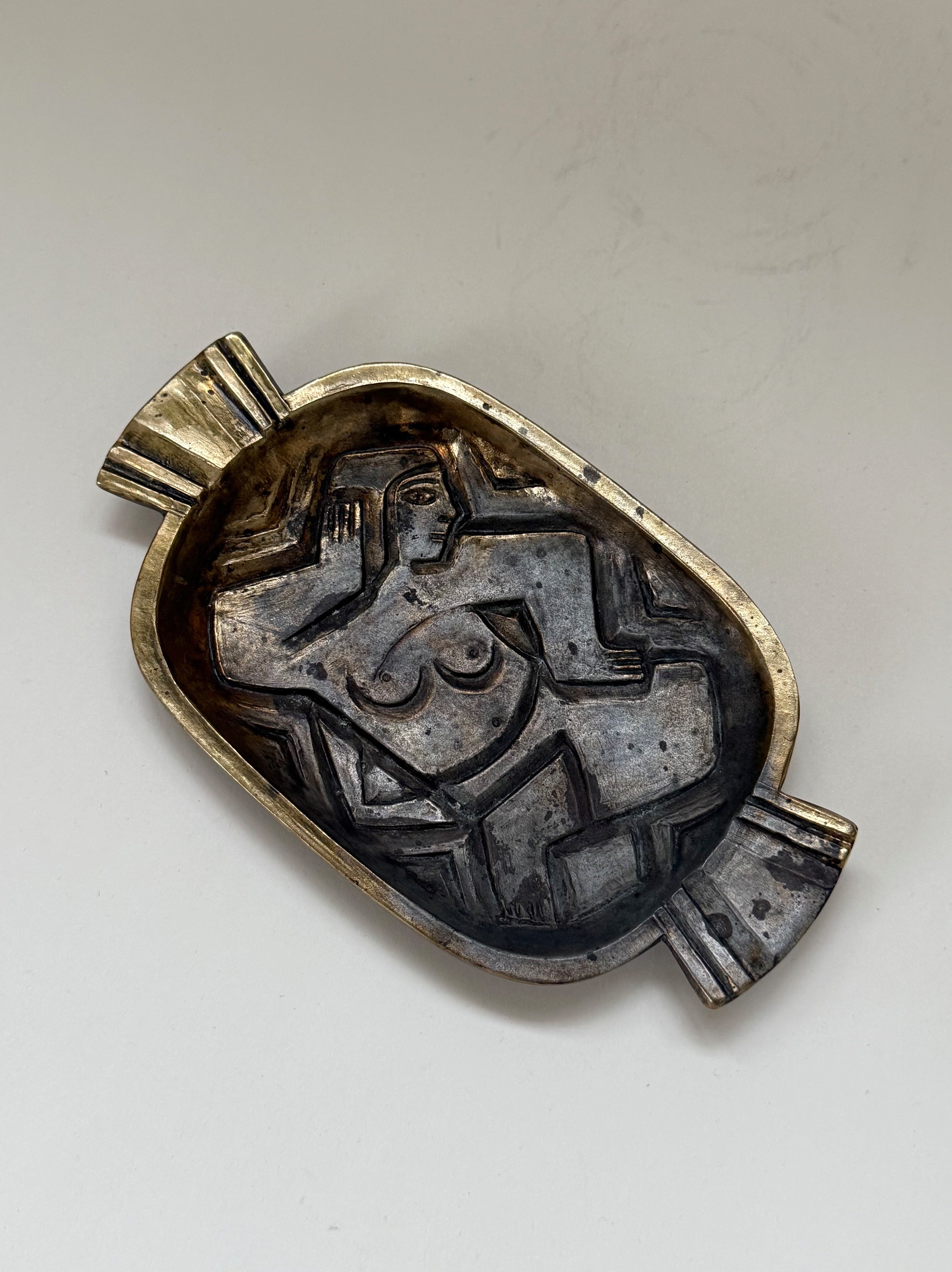 A striking Art Deco metal dish, marked “Made in Sweden.” The oval form is defined by a stylised relief of a reclining female figure, composed in angular, geometric planes that give the piece a distinctly sculptural presence.