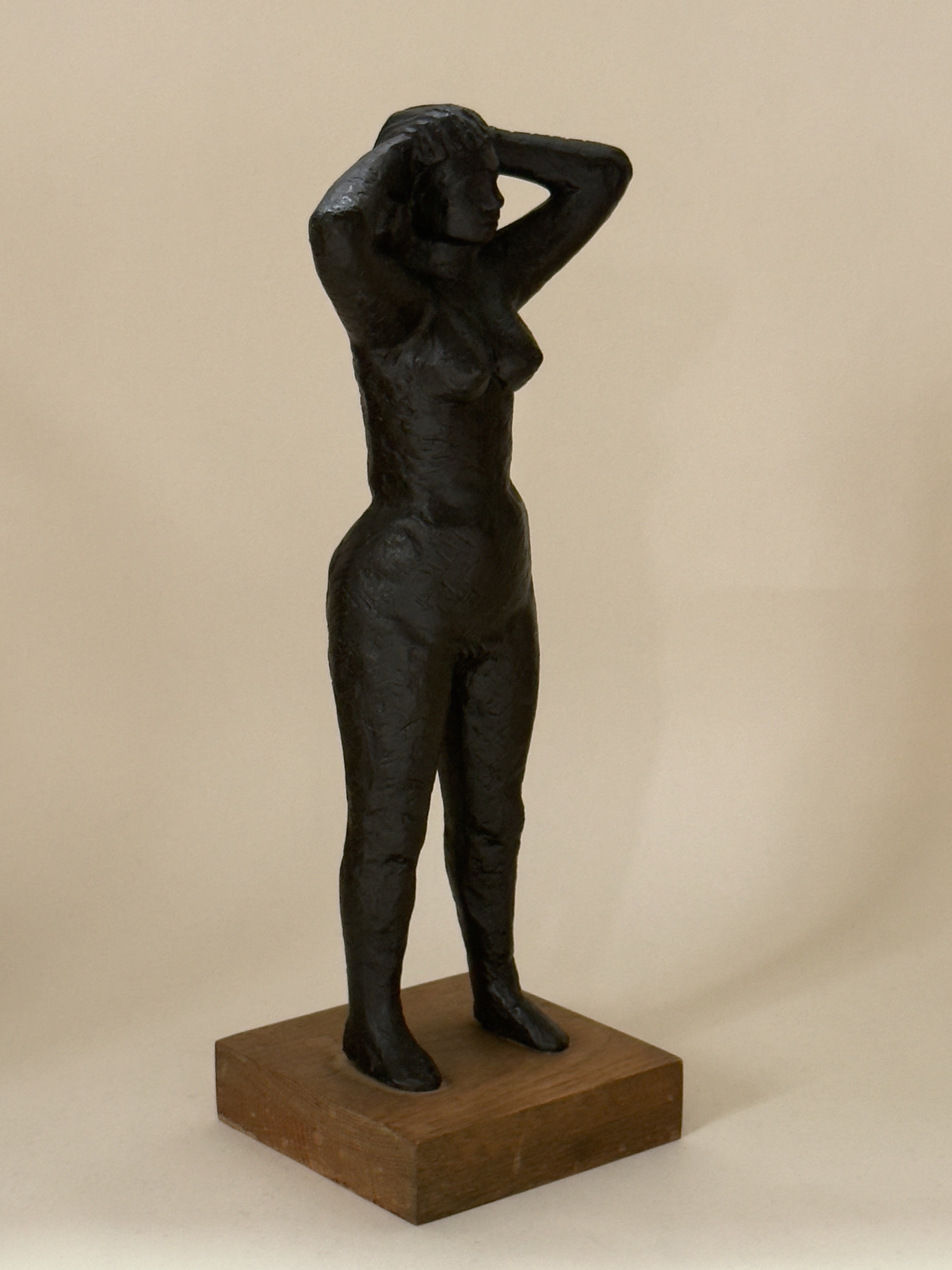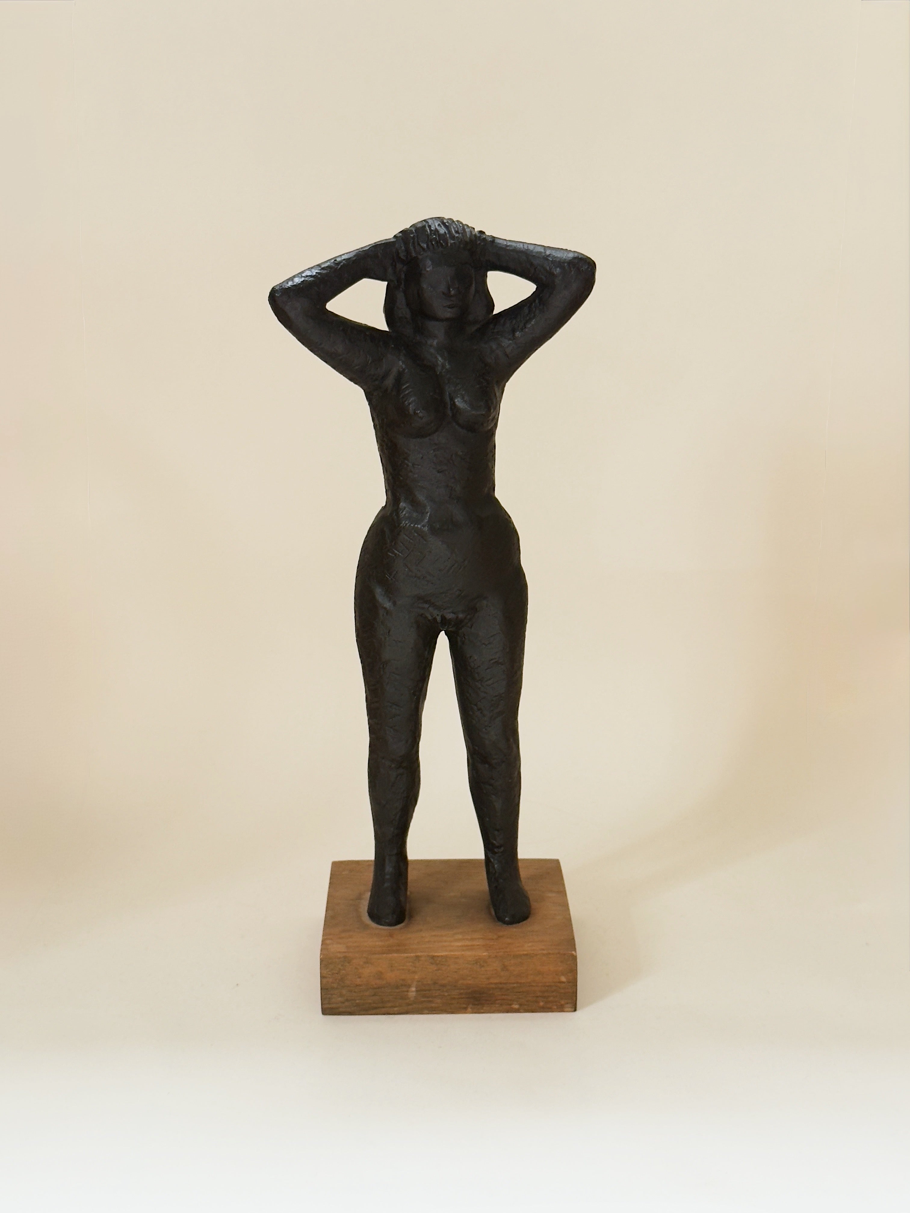 A striking sculpture in cast iron by Swedish artist Eric Elfvén (1921–2008), mounted on its original wooden plinth. Signed and dated 1957, the work captures a poised female figure, her form distilled into a timeless, modernist silhouette. The weight and texture of the iron lend the piece a sense of quiet gravity, while the vertical stance conveys elegance and strength.