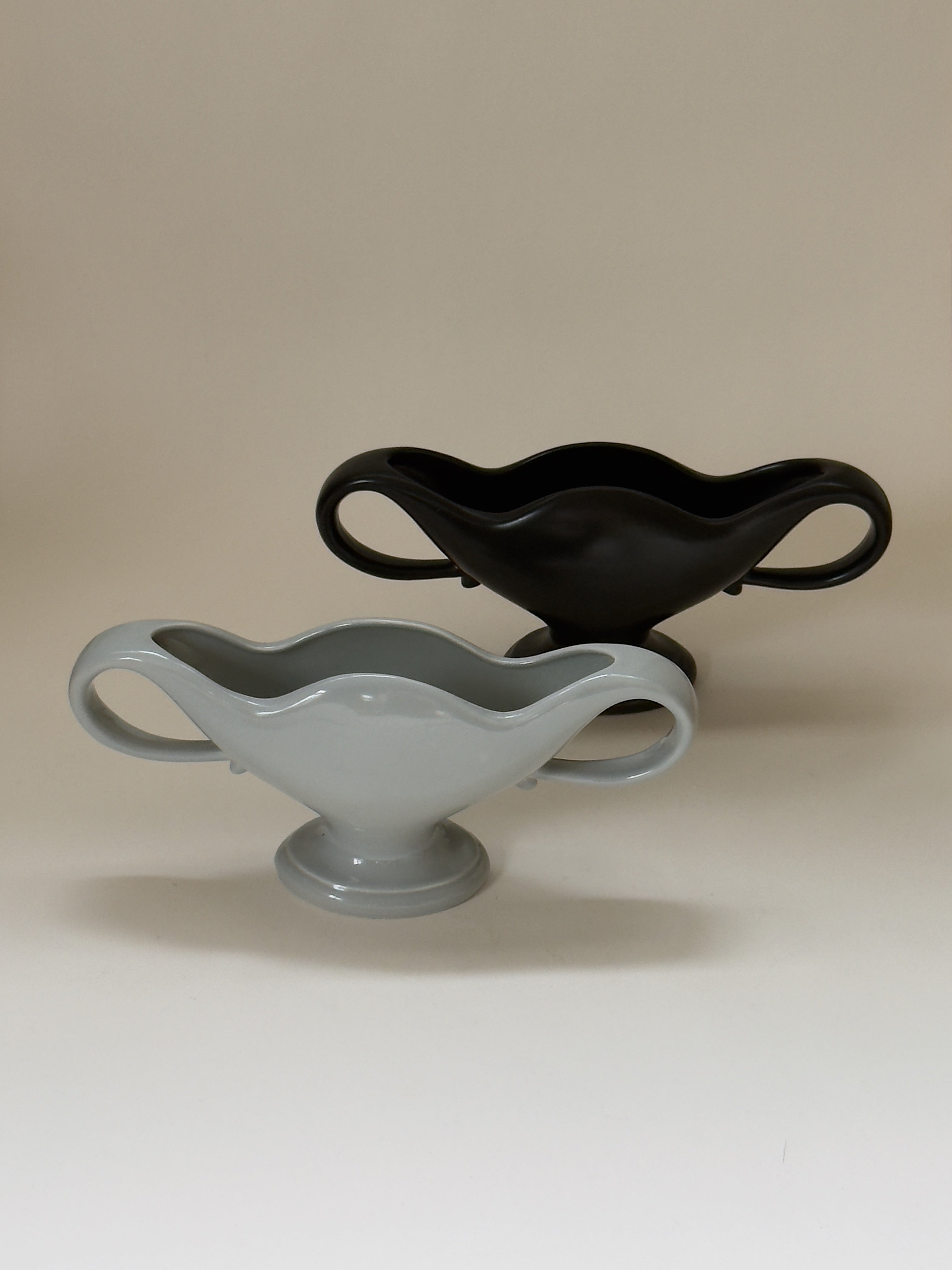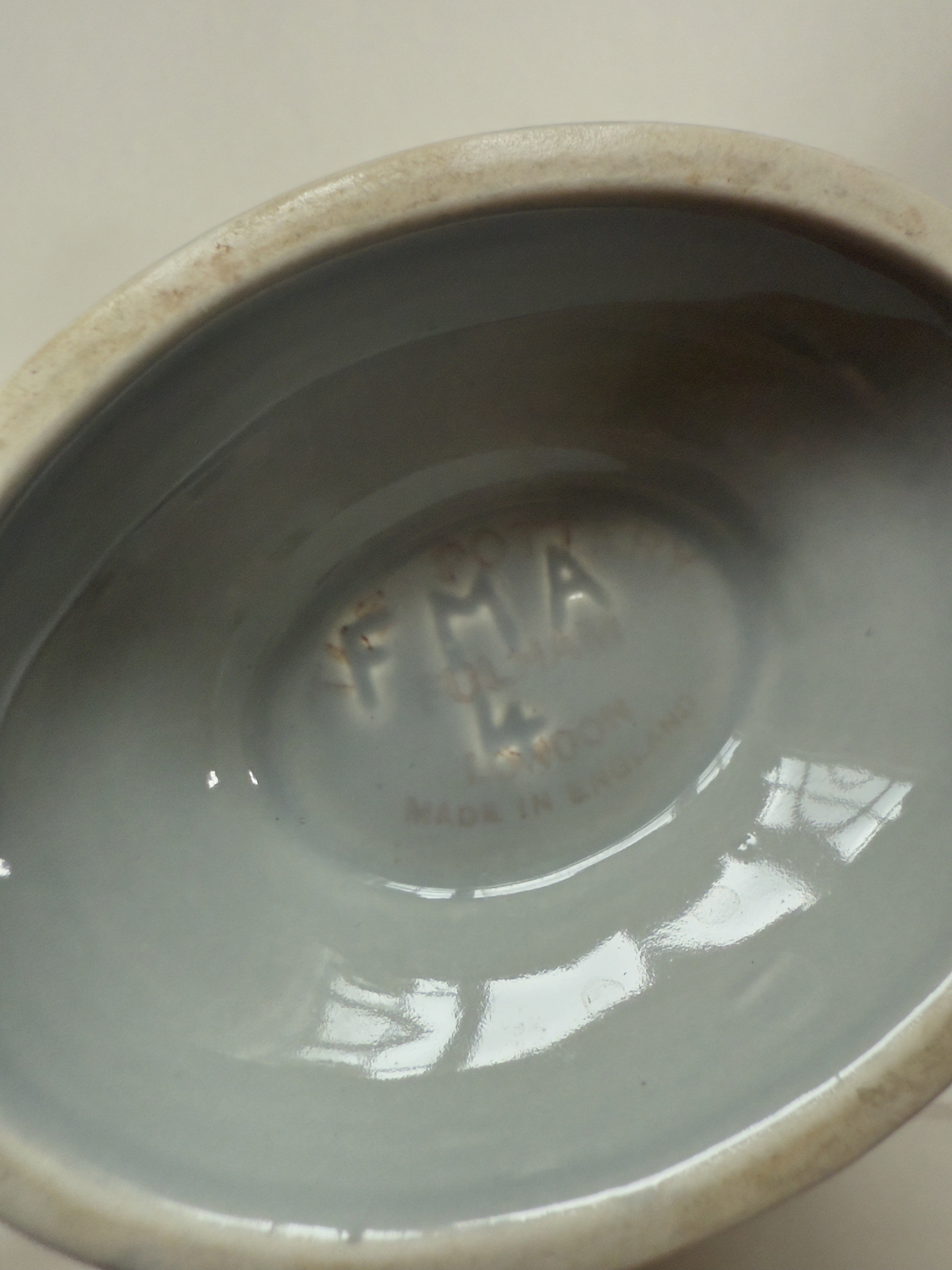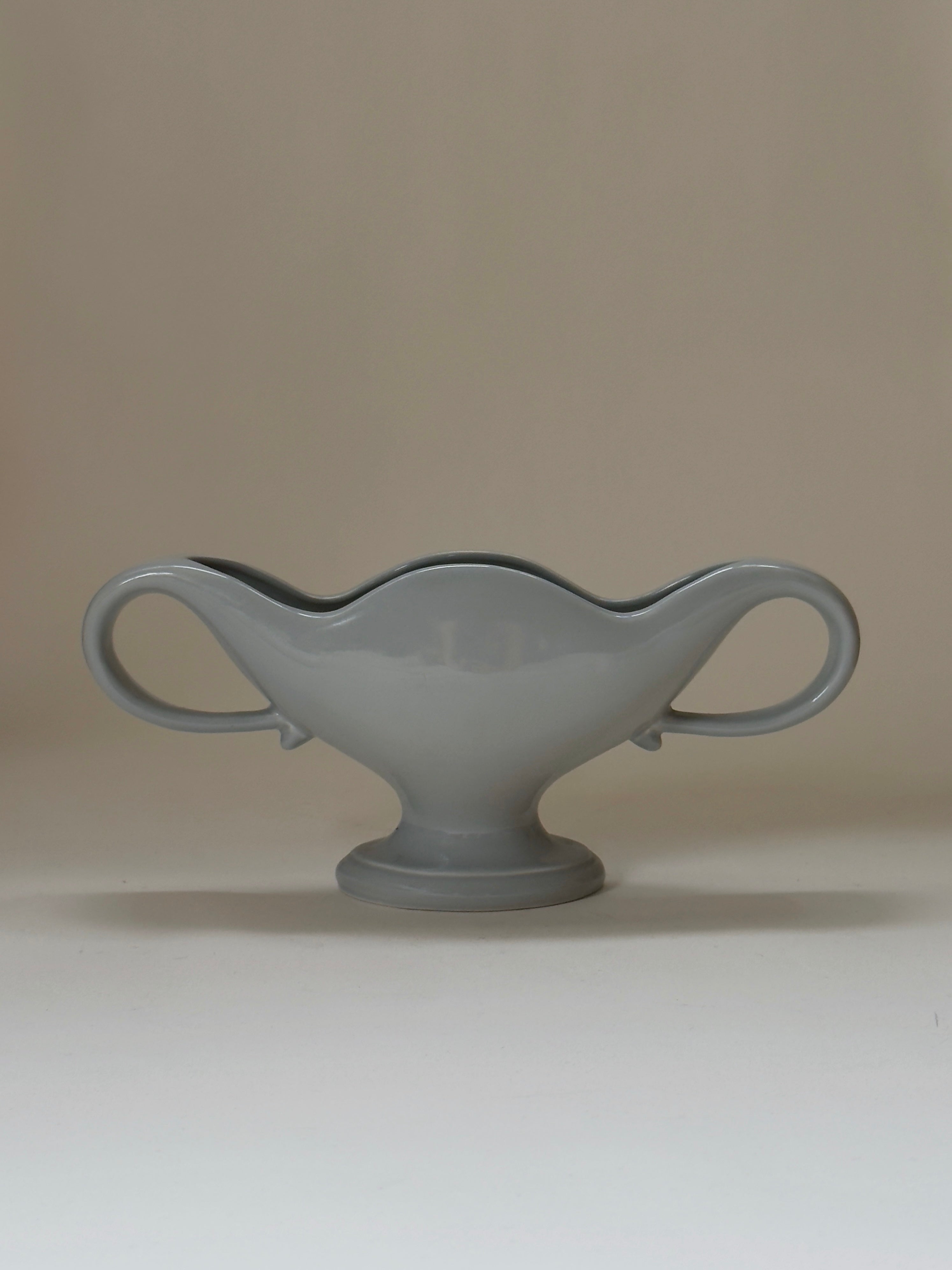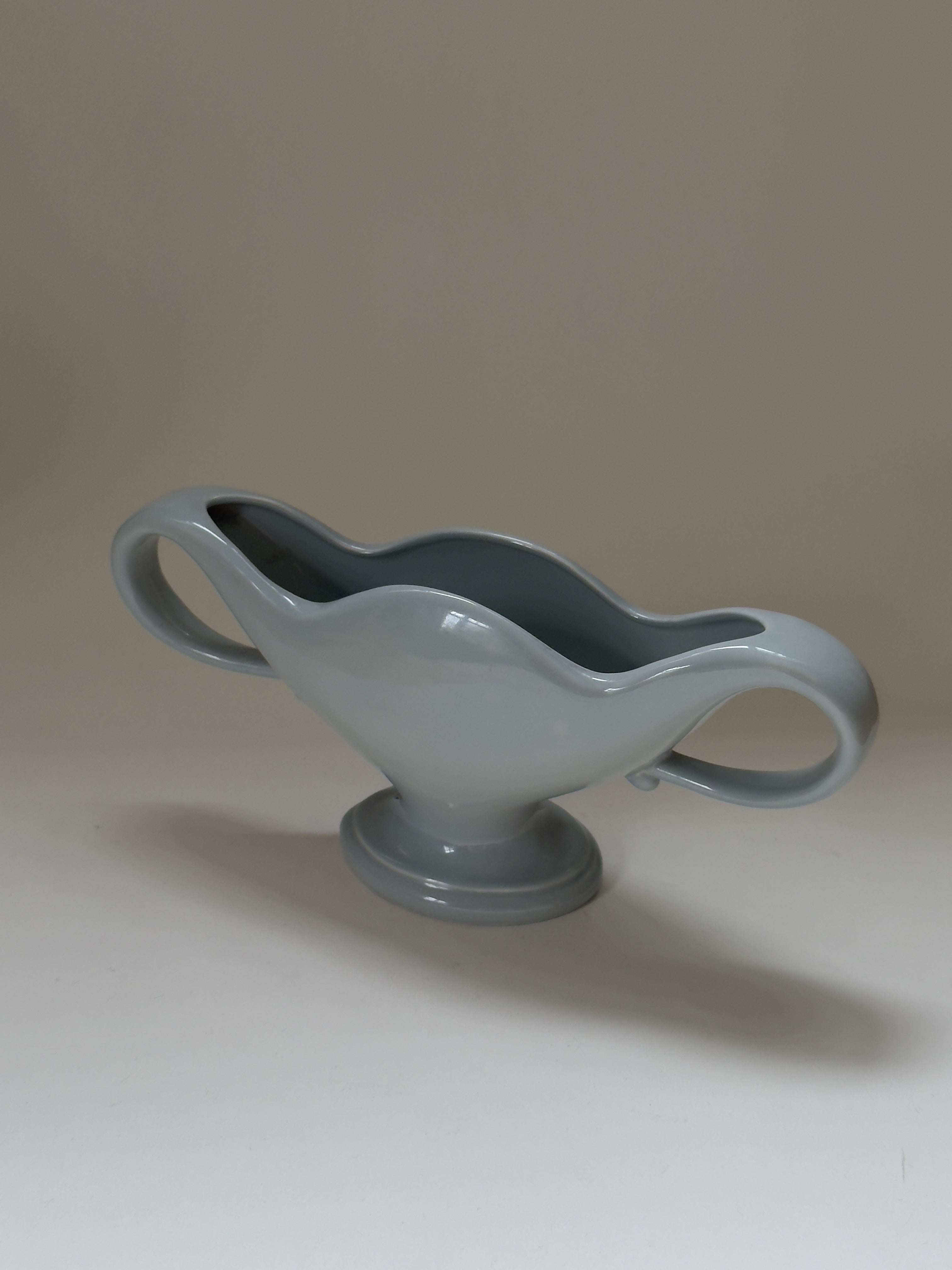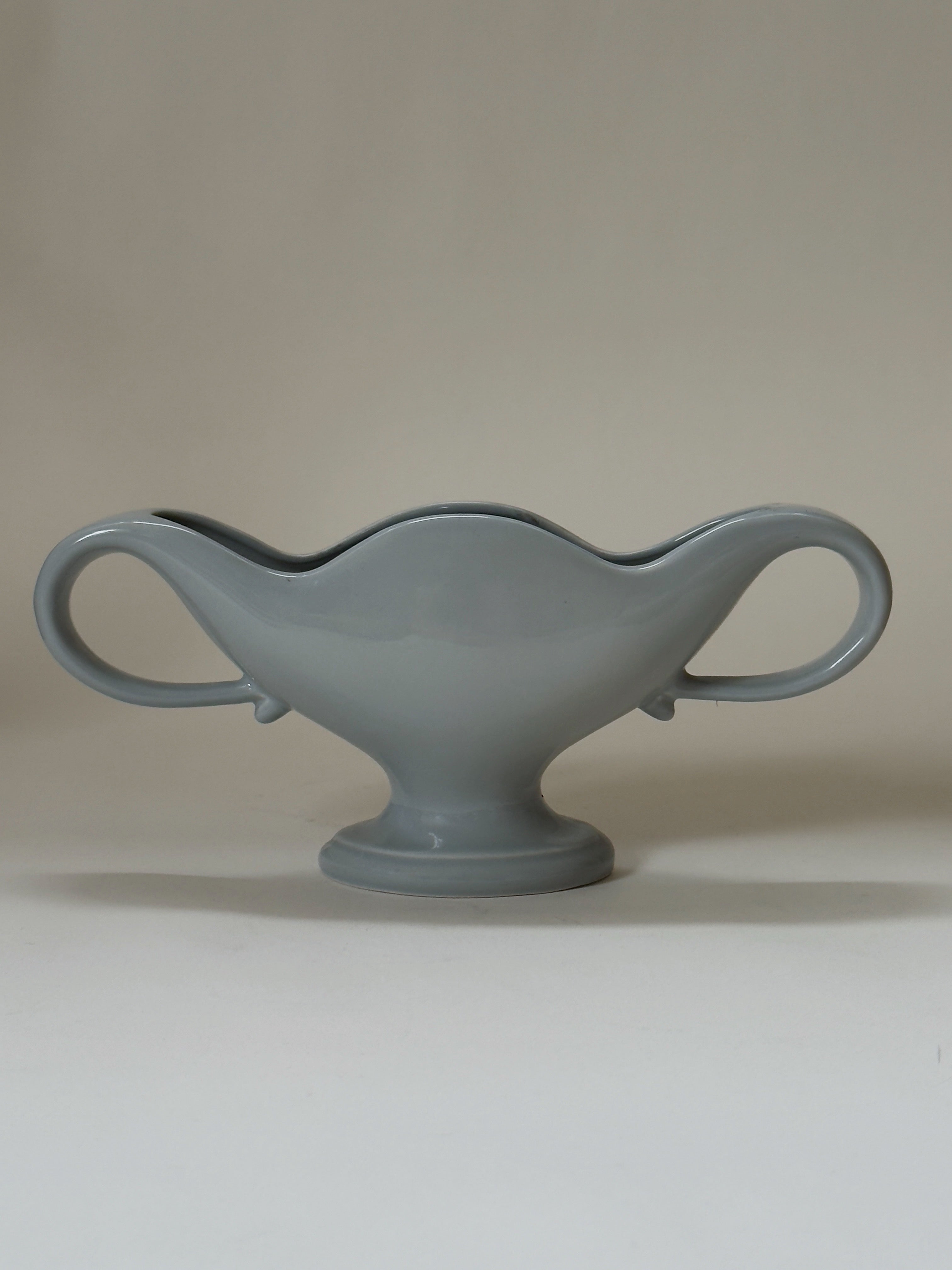 A small vintage mantle vase by Fulham Pottery, England, circa 1930s. Presented in a delicate shade of powder blue, the vase rests on an oval footed base and is accented with sculptural side handles. Its glossy glaze enhances the soft hue, lending a refined charm to the piece. Stamped “Fulham Pottery, Made in England” on the underside, it embodies the craftsmanship and quiet elegance of early 20th-century British ceramics.