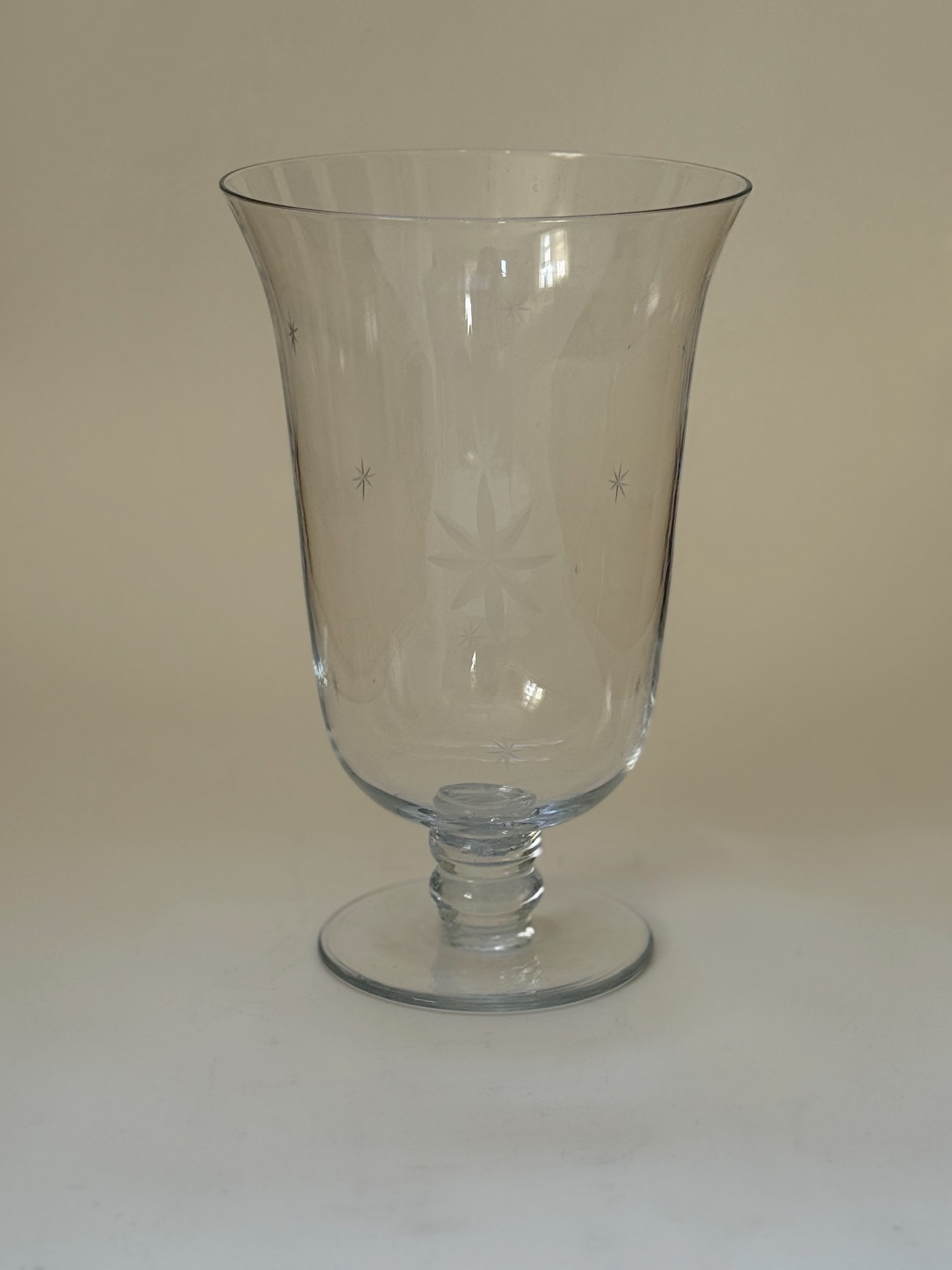 A beautifully proportioned hand-blown glass vase, gracefully flared and elevated on a rounded foot. The clear surface is adorned with delicately etched starbursts, adding a celestial touch to its airy silhouette. A subtle pontil mark beneath speaks to its artisanal origin. Timeless in form and quietly striking, this piece lends itself equally well to floral arrangements or as a sculptural object on its own.