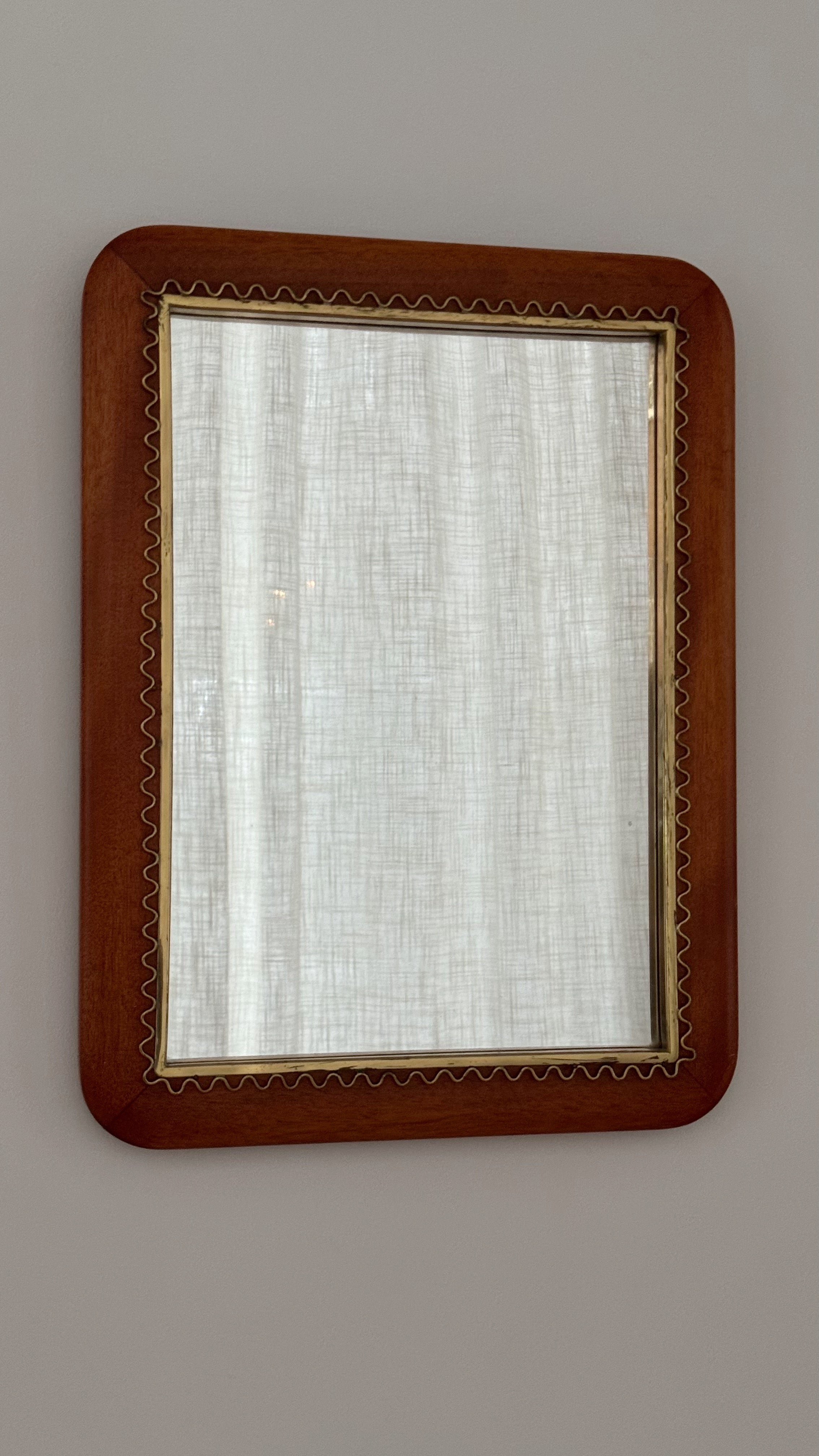 A beautifully crafted Swedish Modern mirror from the 1940s/50s, featuring a rounded mahogany frame accented by a delicate wavy brass inlay. Possibly Firma Svenskt Tenn.