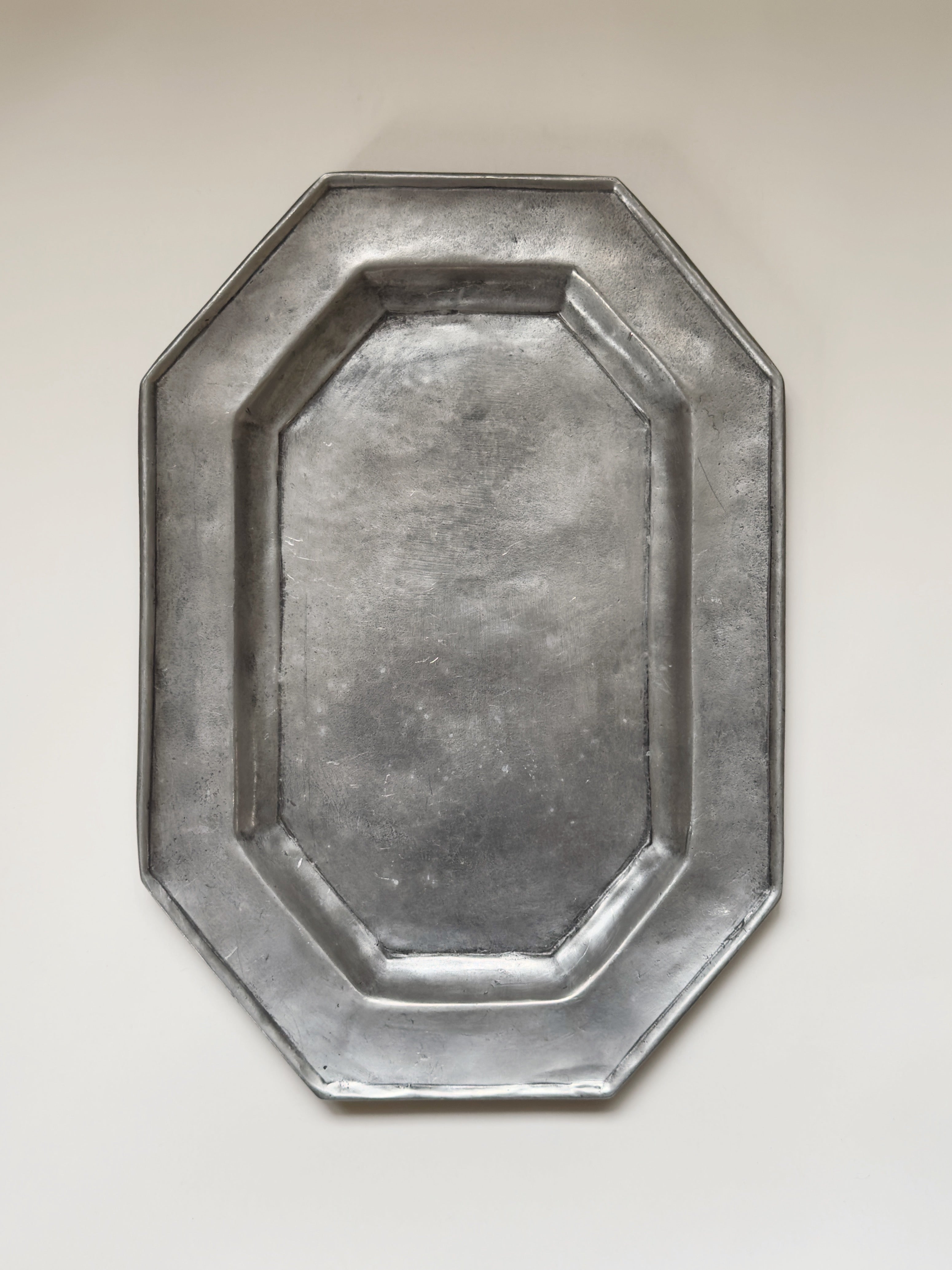 A large pewter plate with an elegant octagonal outline. Likely late 19th – early 20th century (c. 1880–1930). Measuring 34.5 × 24.5 cm, the plate reflects the restrained elegance of traditional craftsmanship.