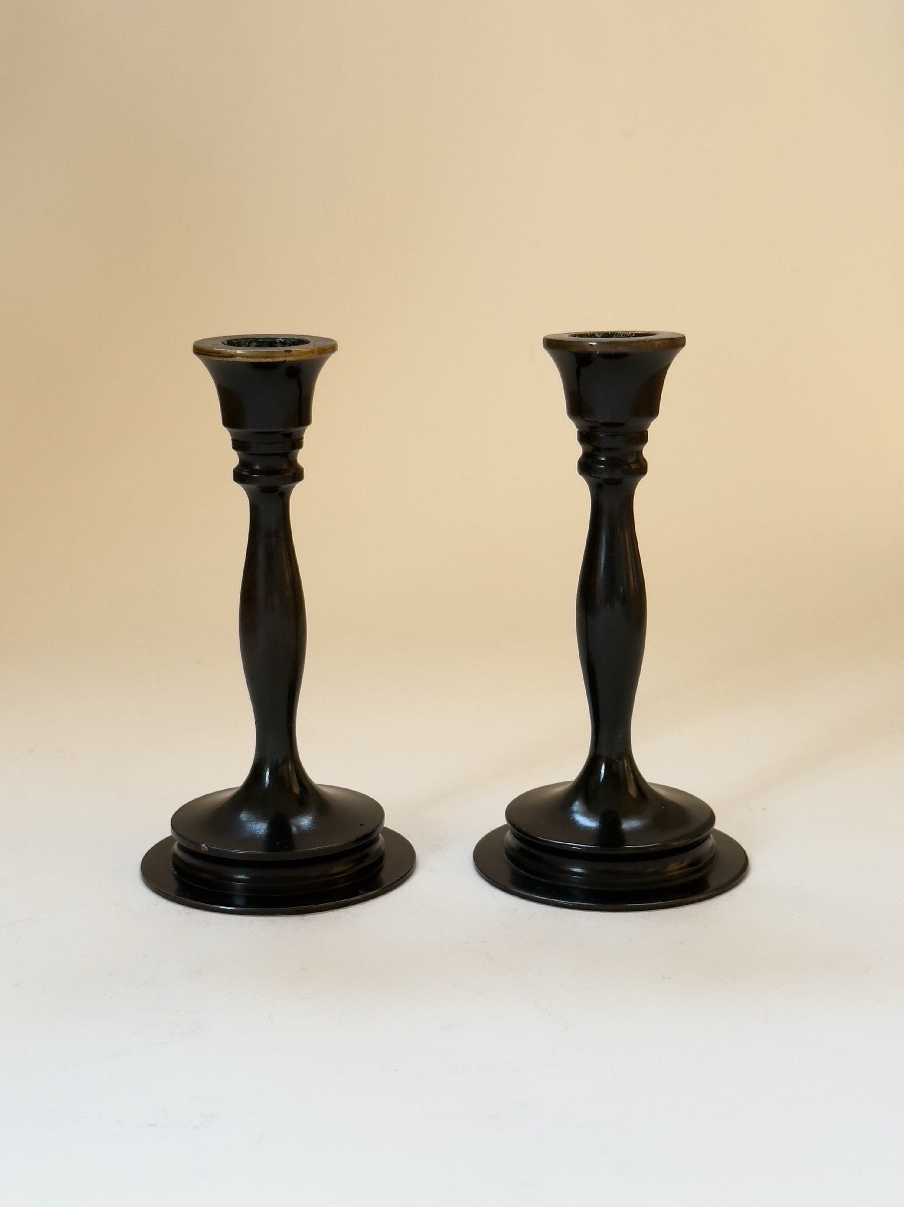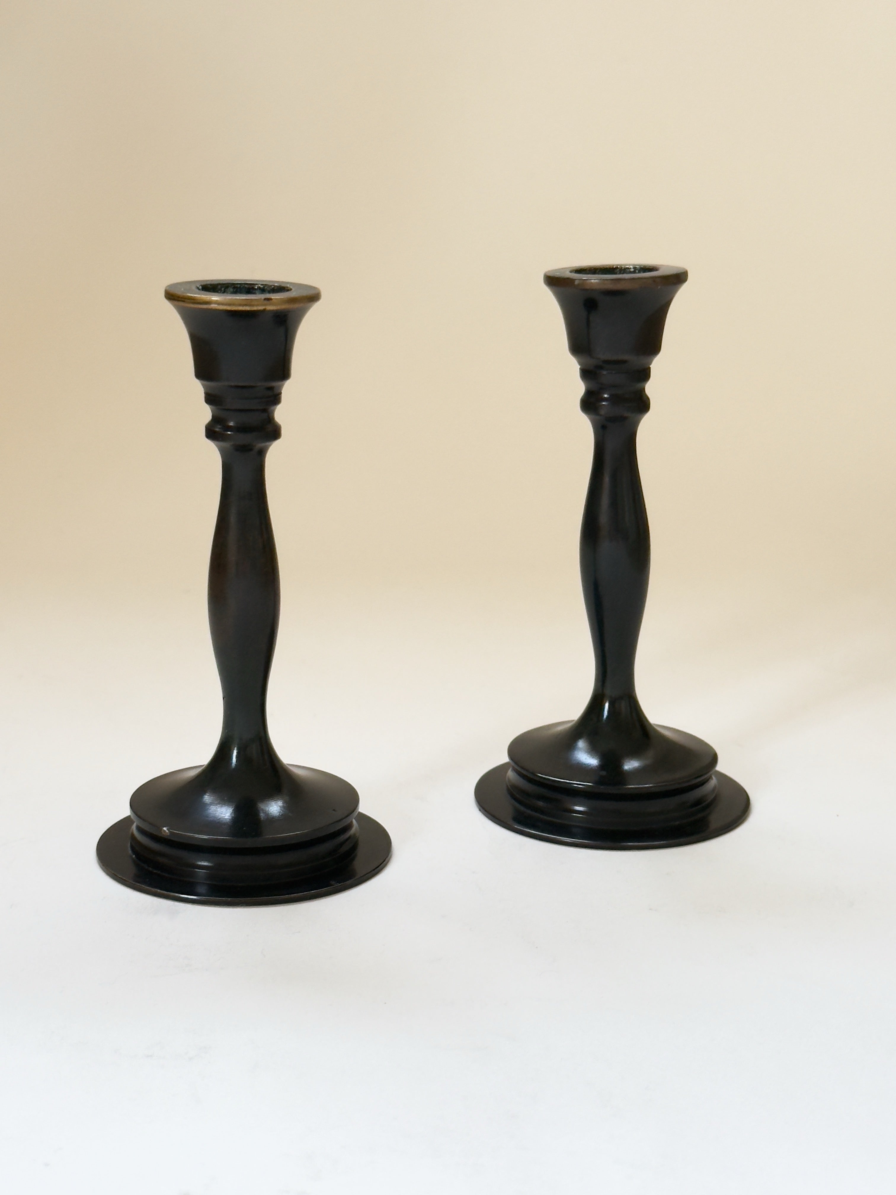 A beautifully balanced pair of Danish bronze candlesticks with a deep, rich patina and elegant turned silhouettes. Compact yet sculptural, their flared tops and gently tapered stems evoke a sense of quiet refinement.