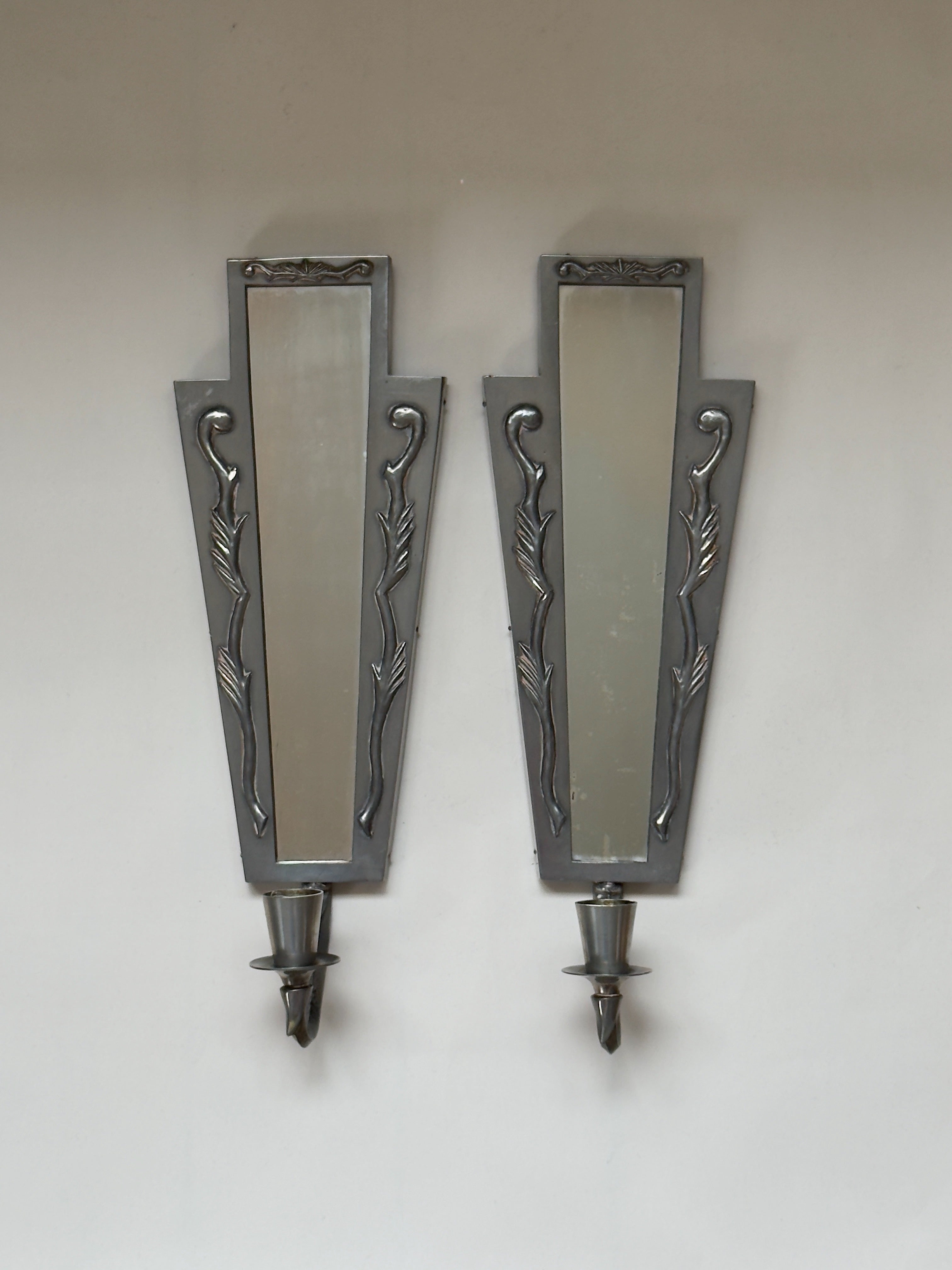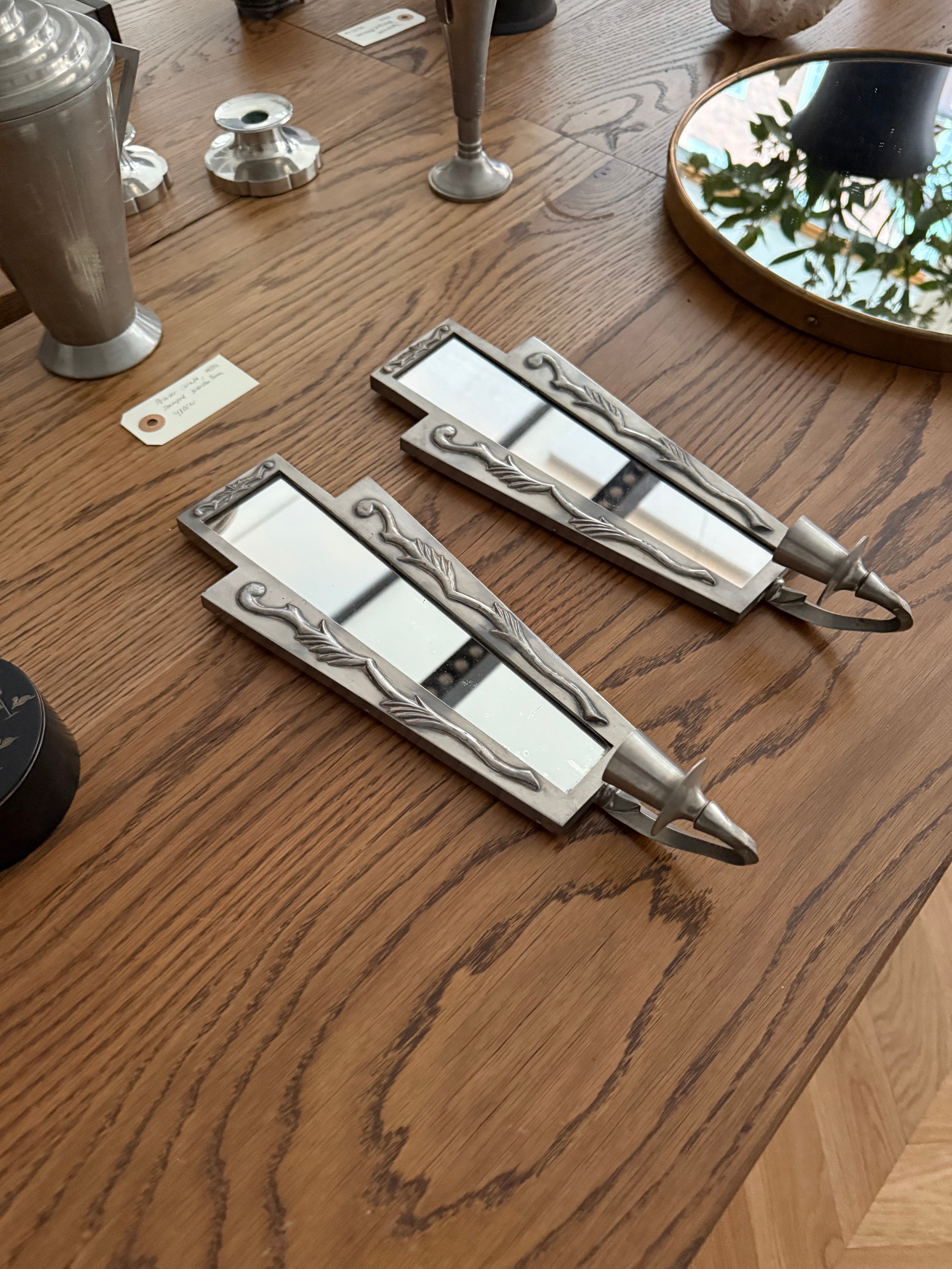 A pair of Swedish Grace pewter candle sconces with mirrored backs, designed to reflect and amplify the candlelight with elegant simplicity. Signed O.H.L Svenskt Tenn, they embody the refined craftsmanship and timeless aesthetic of early 20th-century Swedish design. The geometric form is softened by stylized foliate details, creating a harmonious balance between symmetry and ornament. A rare and atmospheric pair, equally striking as functional lighting or as decorative objects.