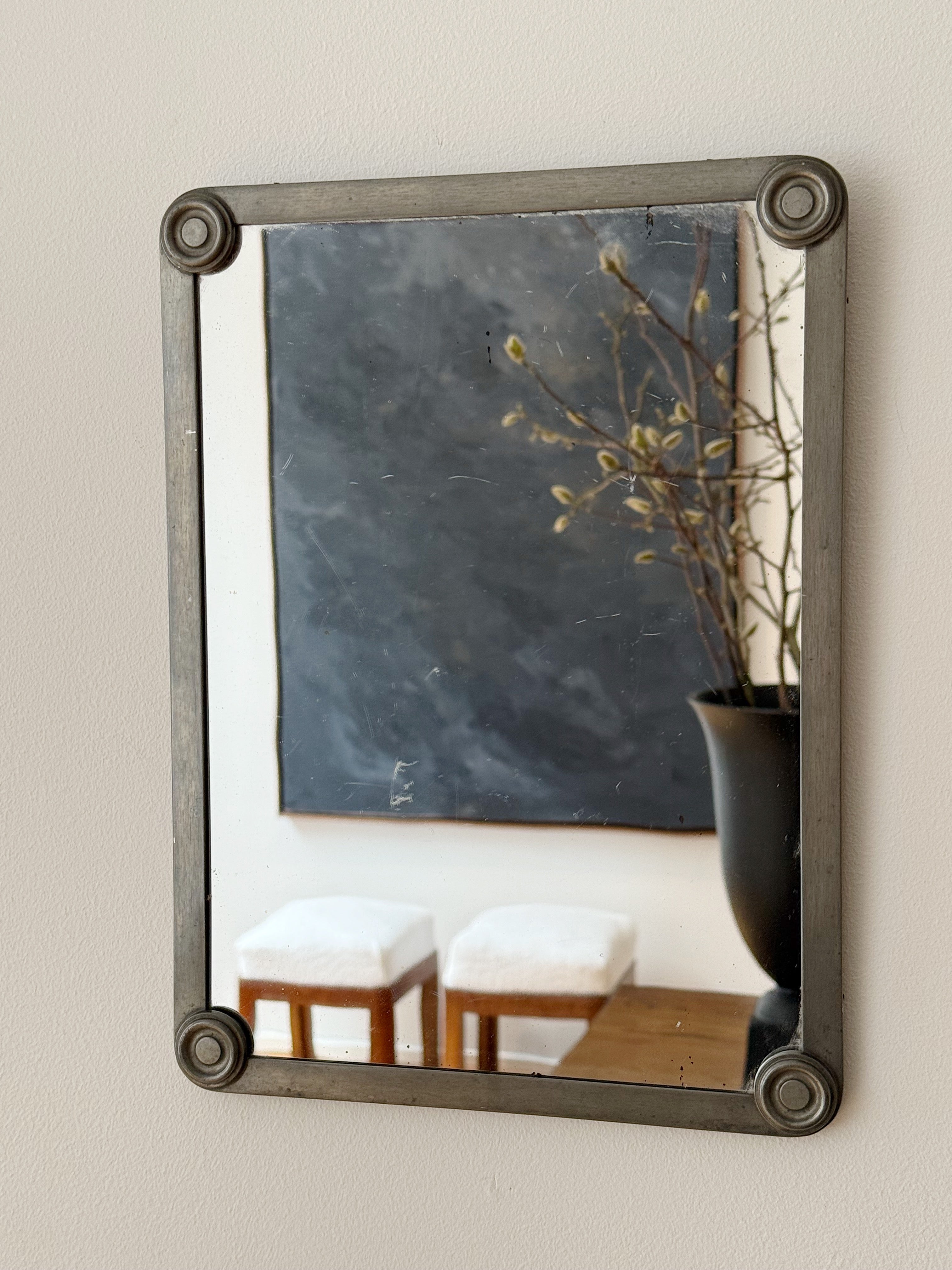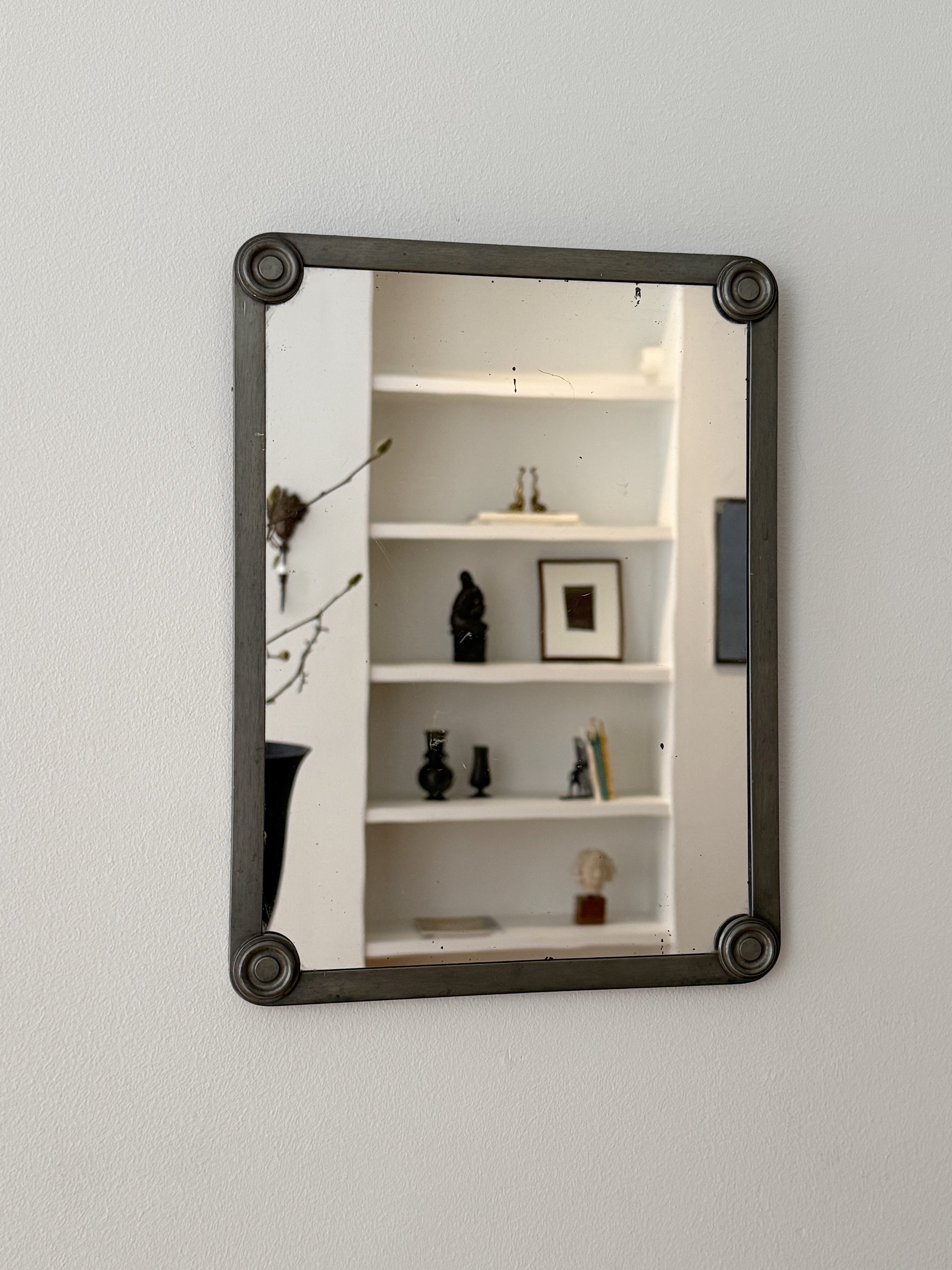 A refined pewter mirror by Fabriksaktiebolaget Kronsilver, marked FAK Svenskt Tenn. The design is both restrained and architectural, with softly rounded corner details lending a subtle decorative note to an otherwise pared-back form. The pewter frame has developed a beautiful, lived-in patina over time, adding depth and character without overpowering the mirror’s clean lines. A quietly elegant piece that works equally well in a hallway, bathroom, or bedroom.