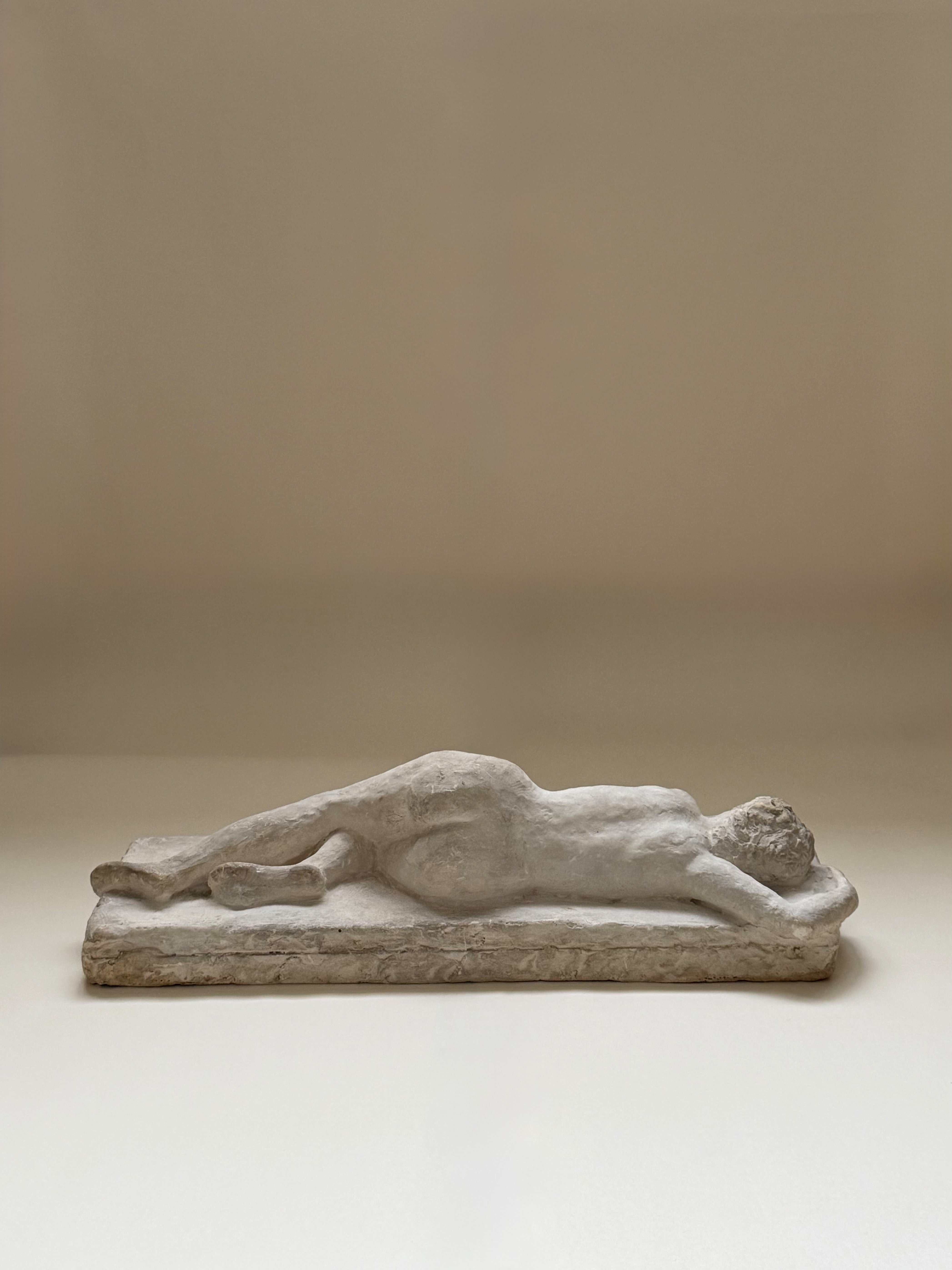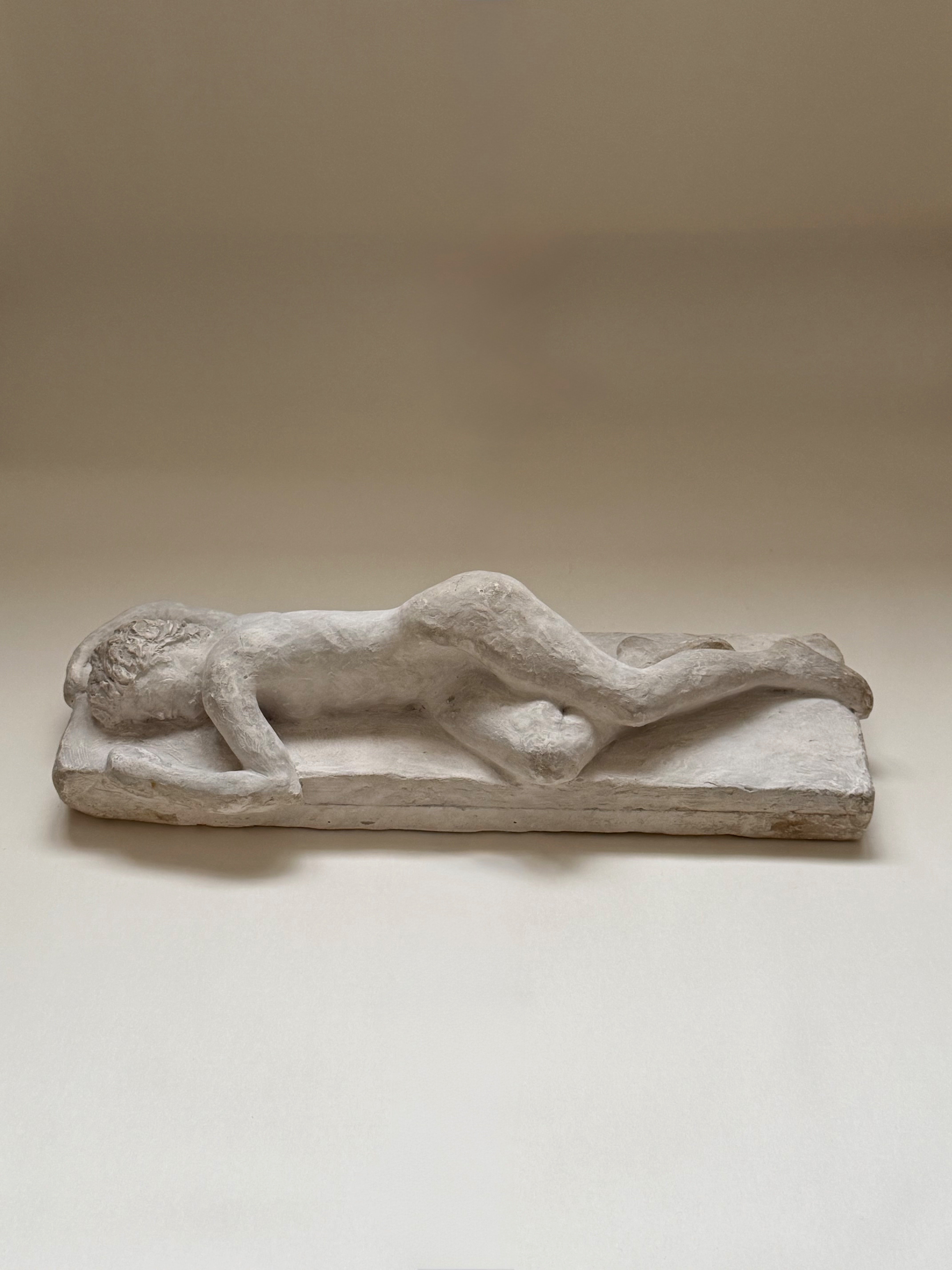 A beautifully restrained plaster sculpture depicting a reclining nude figure, rendered with a quiet sensitivity to form and movement. The figure rests along a rectangular plinth, the composition balancing weight and softness with a distinctly modern sensibility.