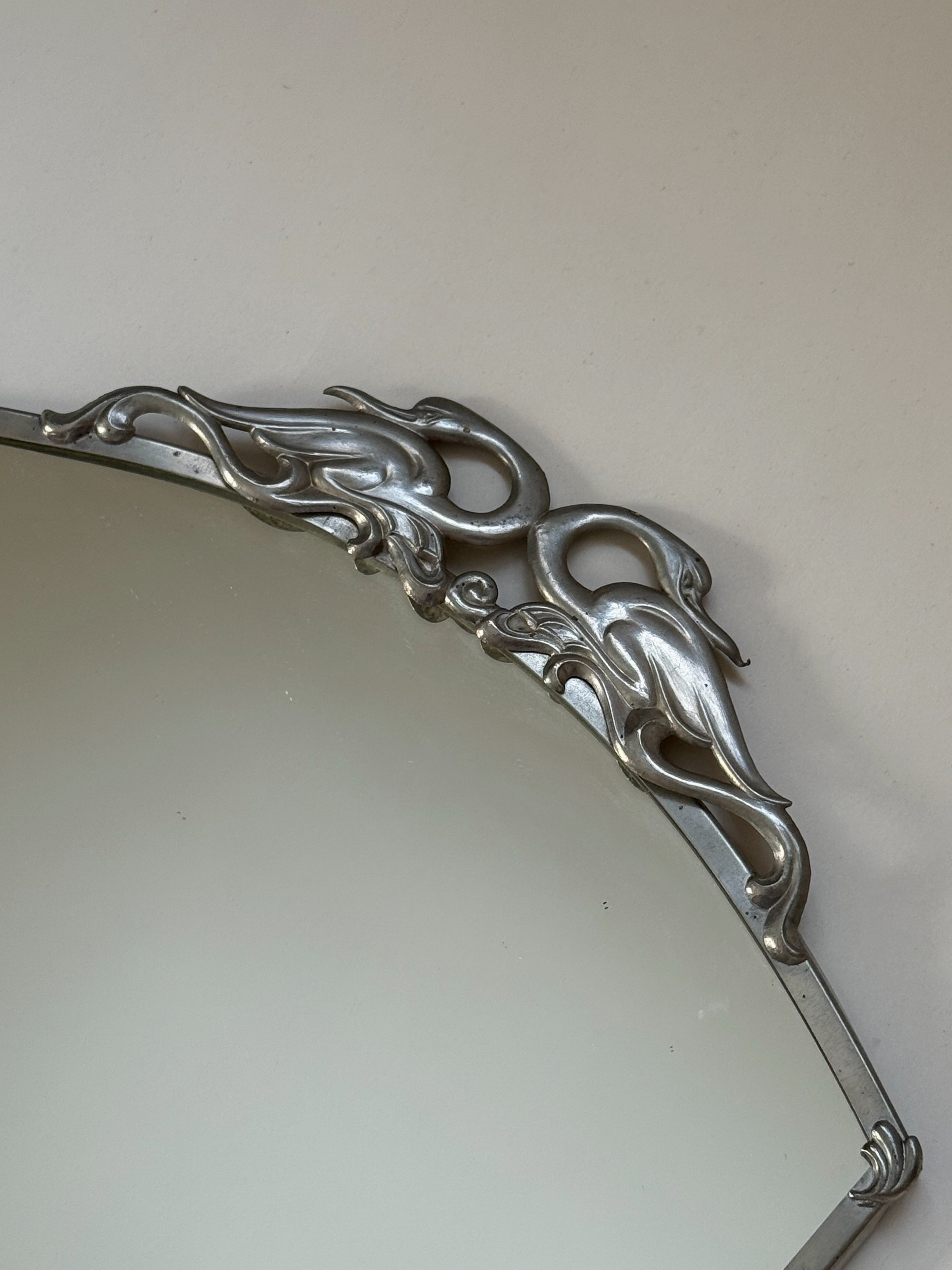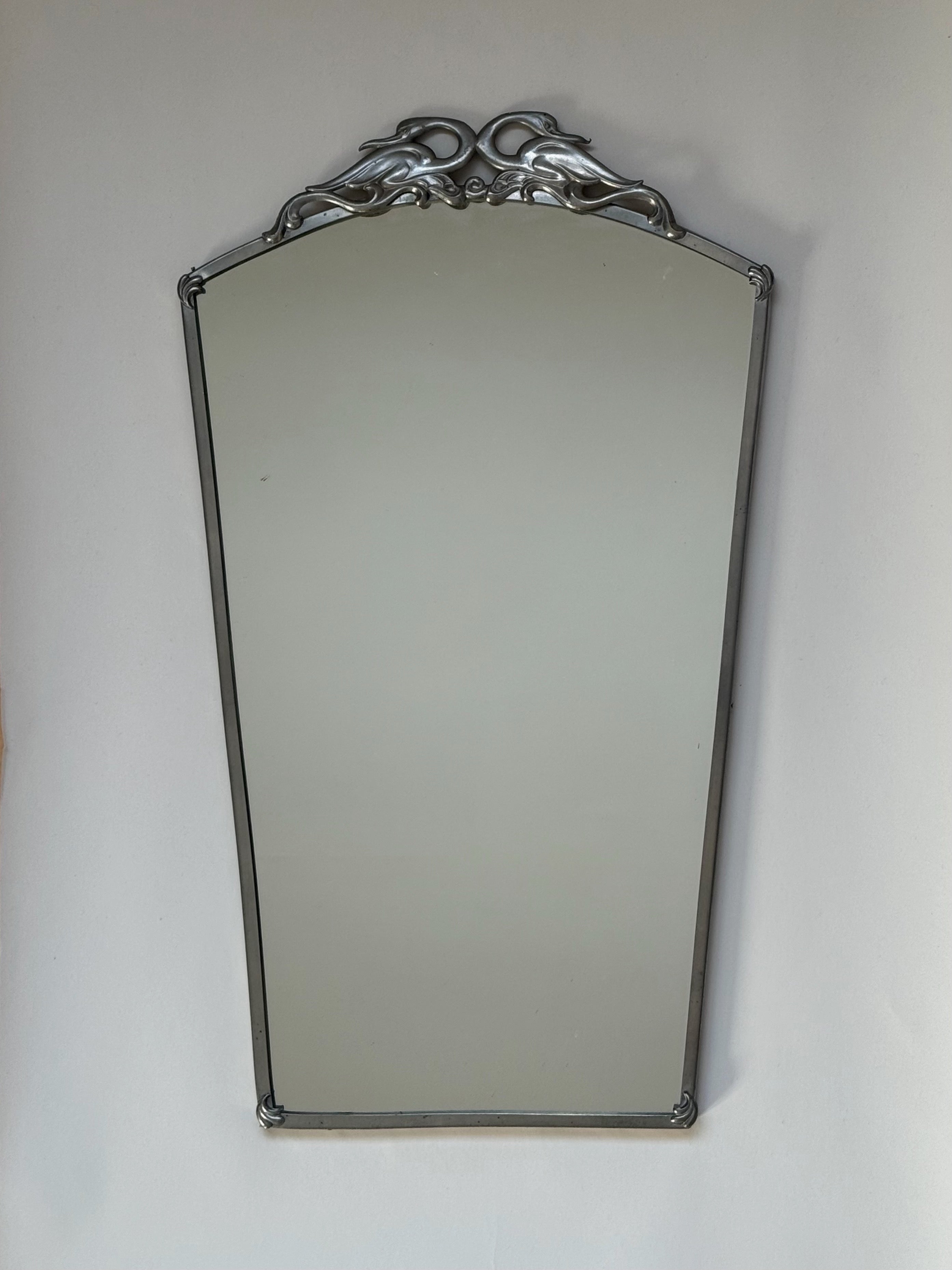 A quietly striking mirror from the Swedish Grace period, where classical restraint meets the softened geometry of early Art Deco. The slender pewter frame is crowned with a beautifully sculpted pair of stylised swans, their elongated forms curving toward one another in a poised, almost lyrical composition.