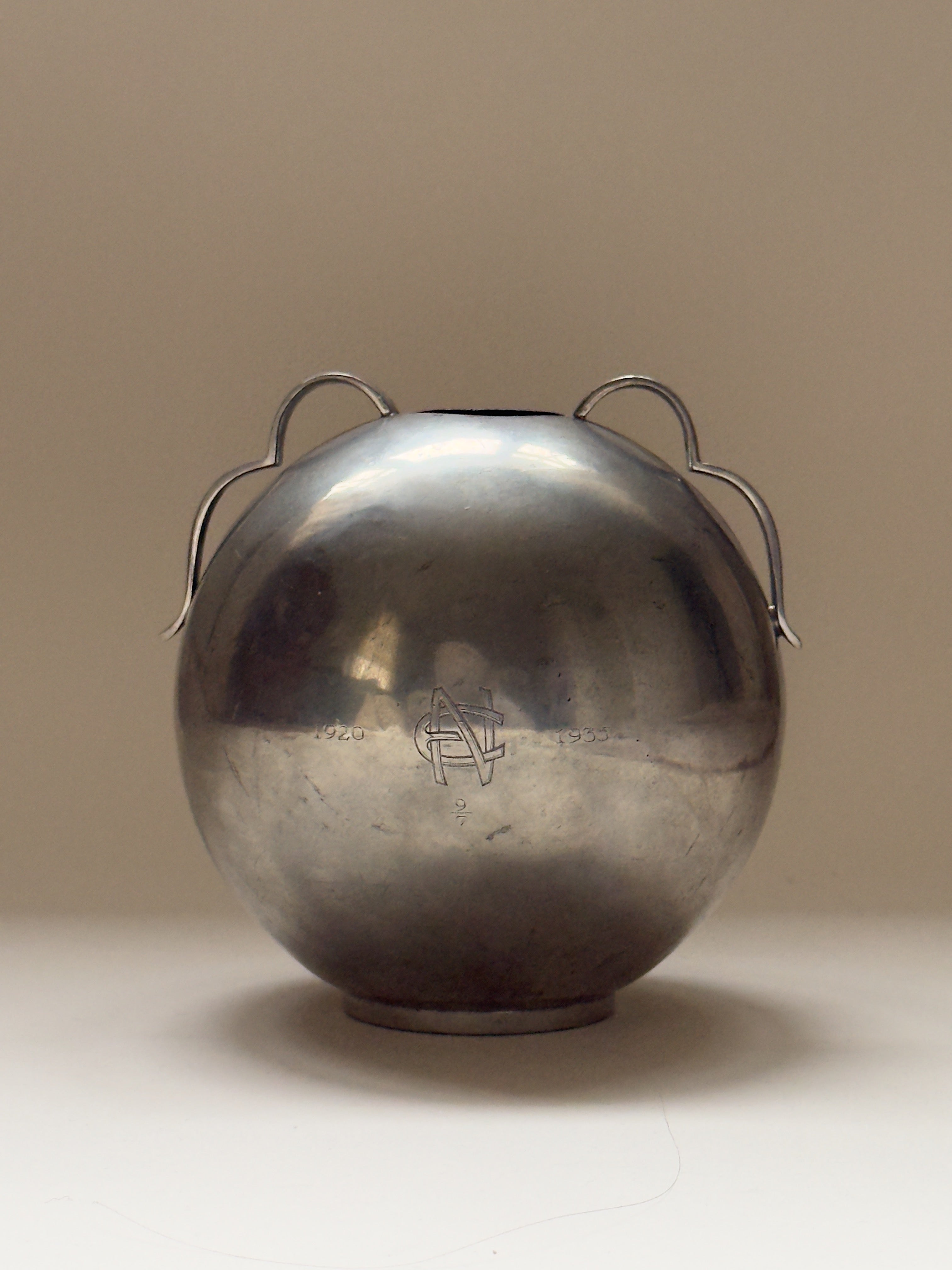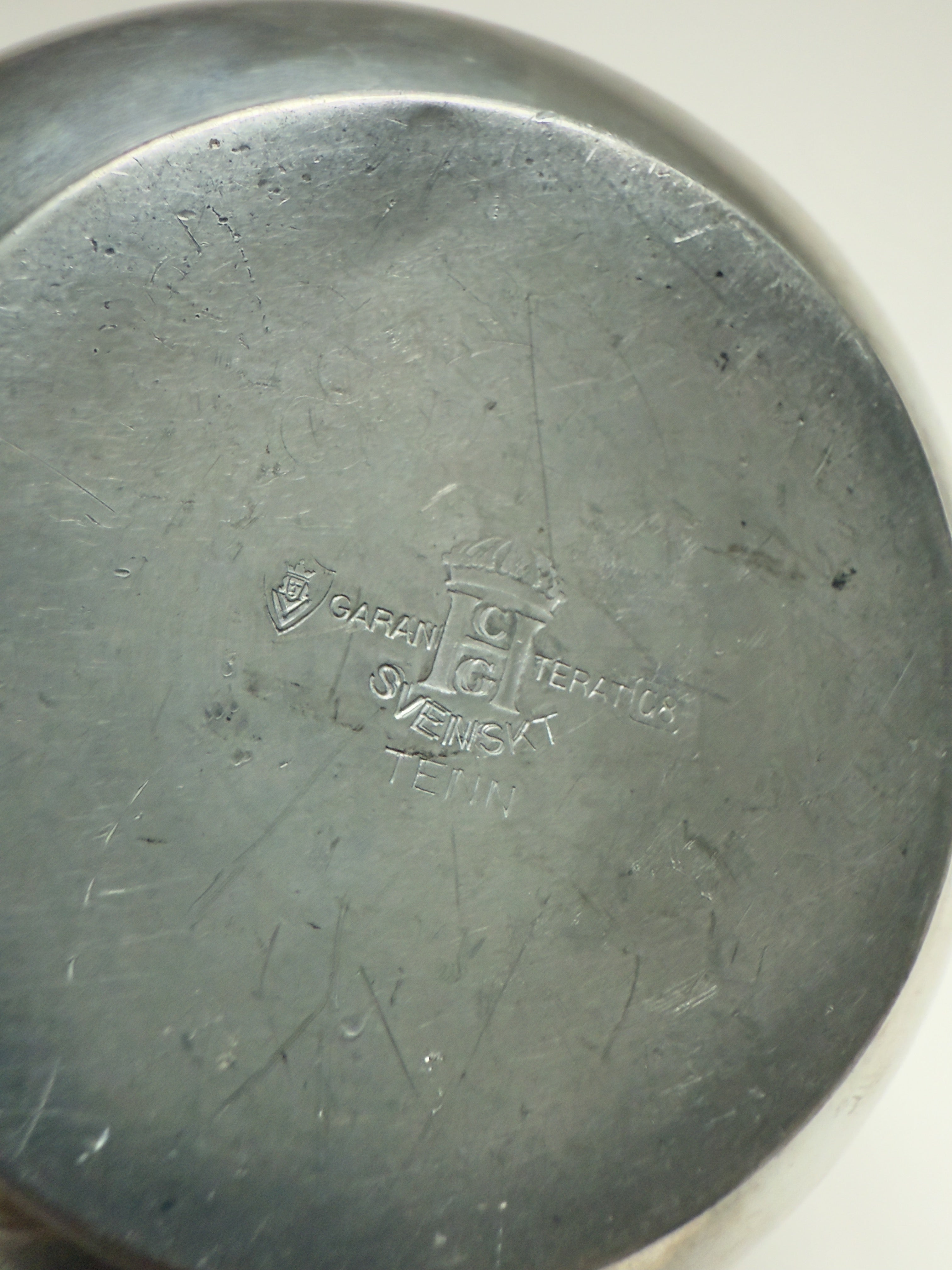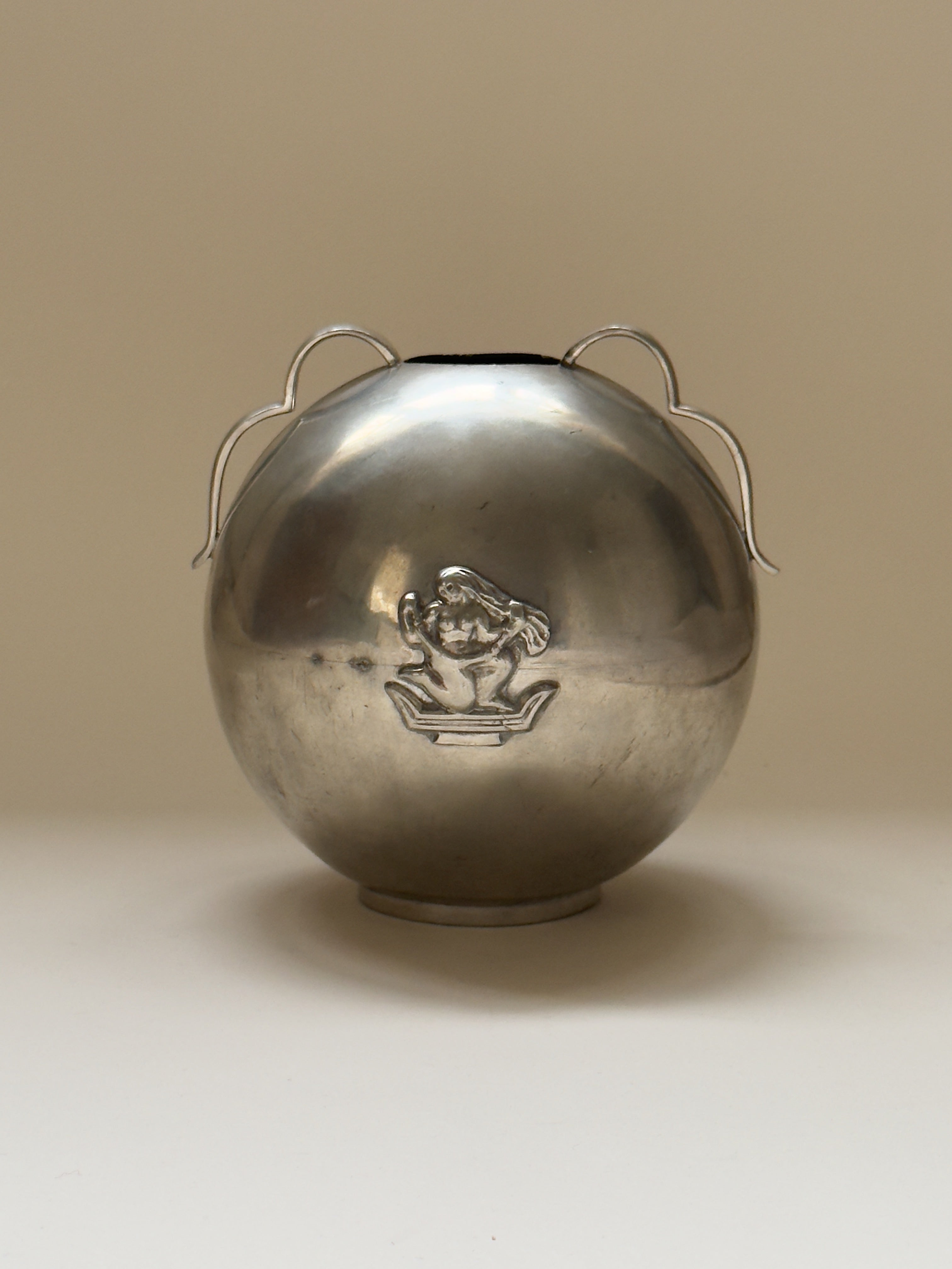 A sculptural pewter vase by C.G. Hallberg, reflecting the refined geometry and quiet strength characteristic of the Swedish Grace period. The rounded form is adorned with a stylized relief medallion and crowned by delicately curved handles that lend the piece a lyrical sense of movement. A beautiful example of early 20th-century Swedish craftsmanship, merging functionality with decorative artistry.
