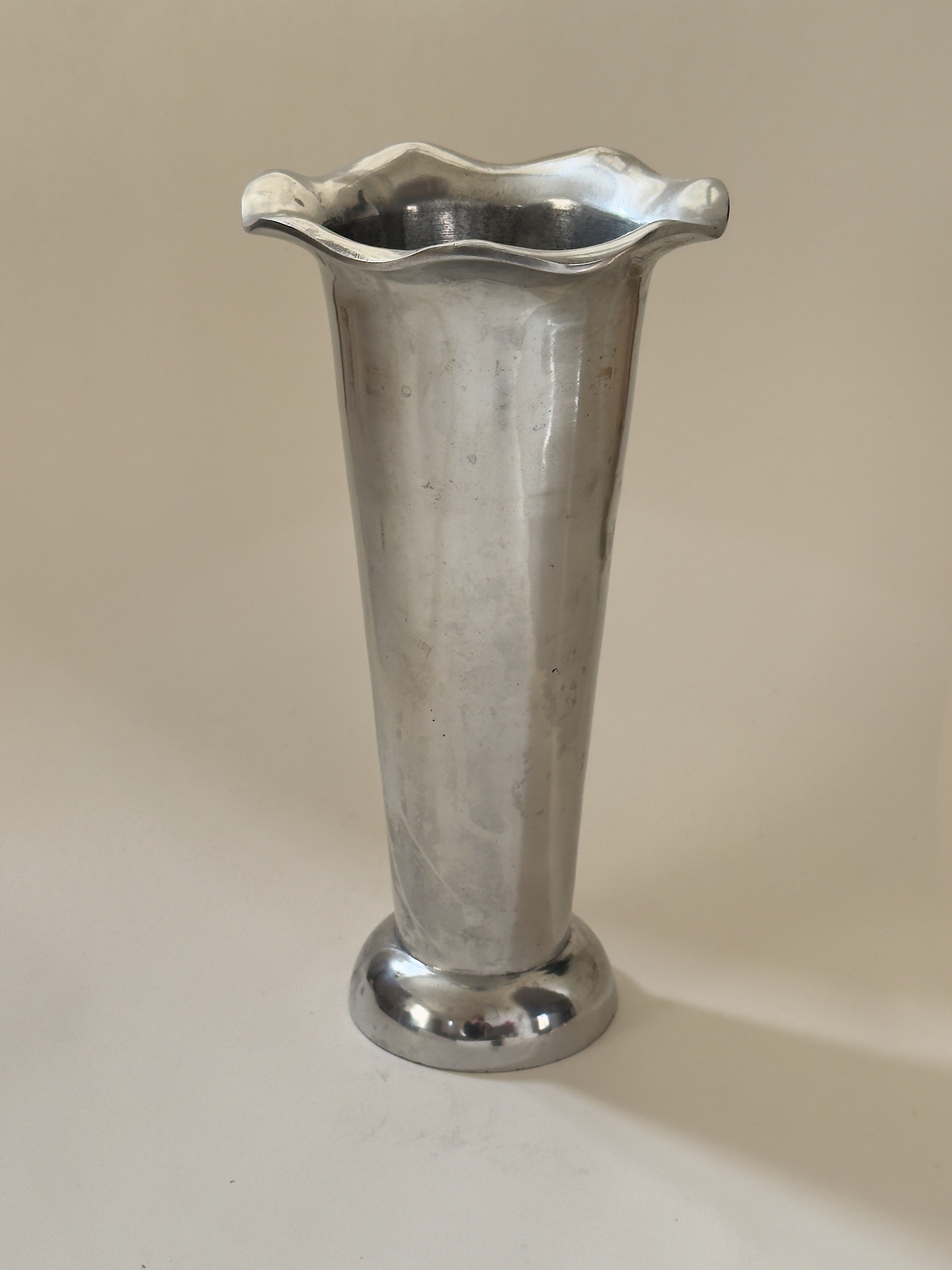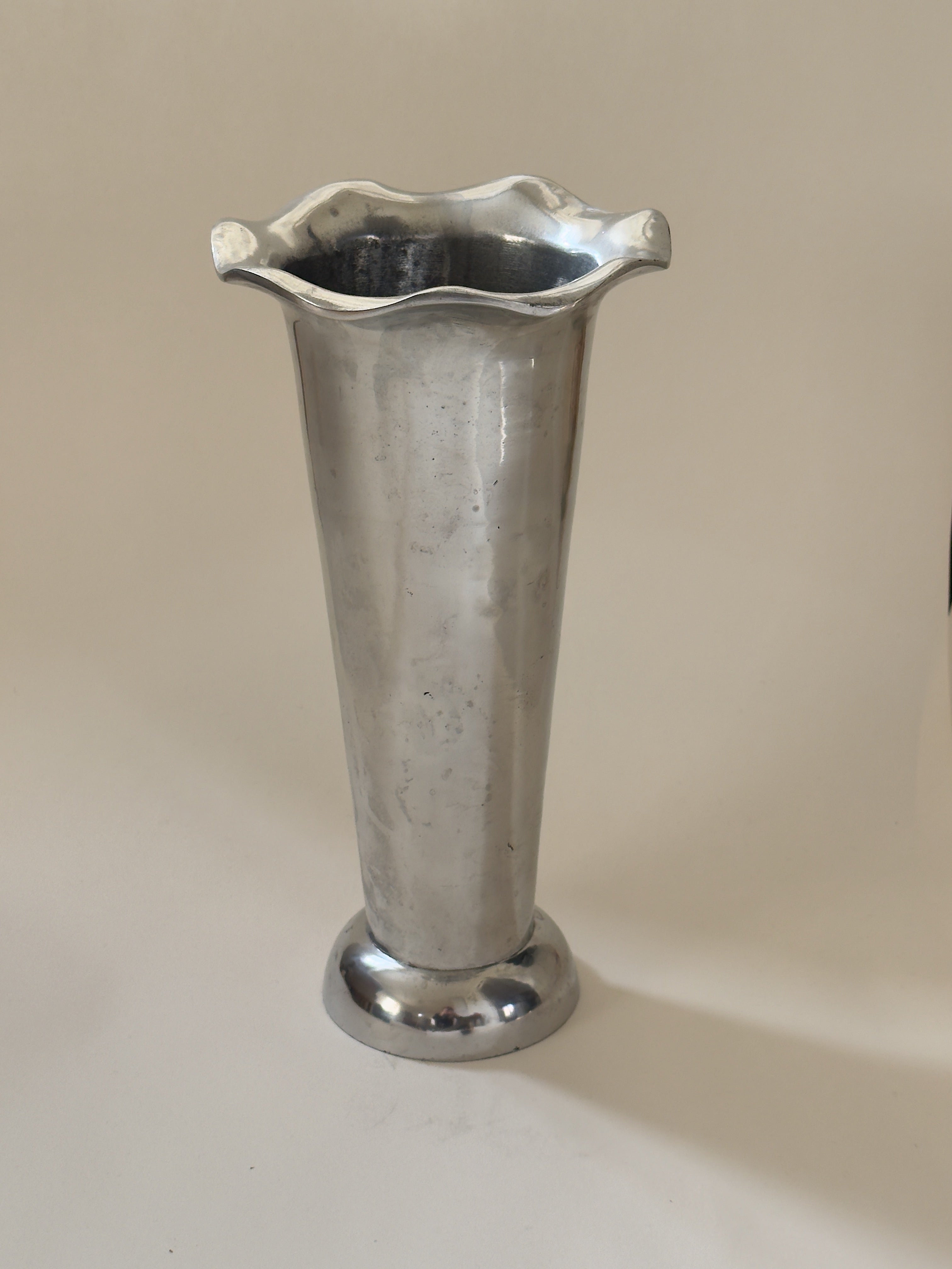 The body rises from a weighted base into a slender, tapering neck before opening into a petal-like flare. Cast in a silver-toned metal, likely pewter or aluminium, the surface carries a subtle patina that adds depth and quiet character.