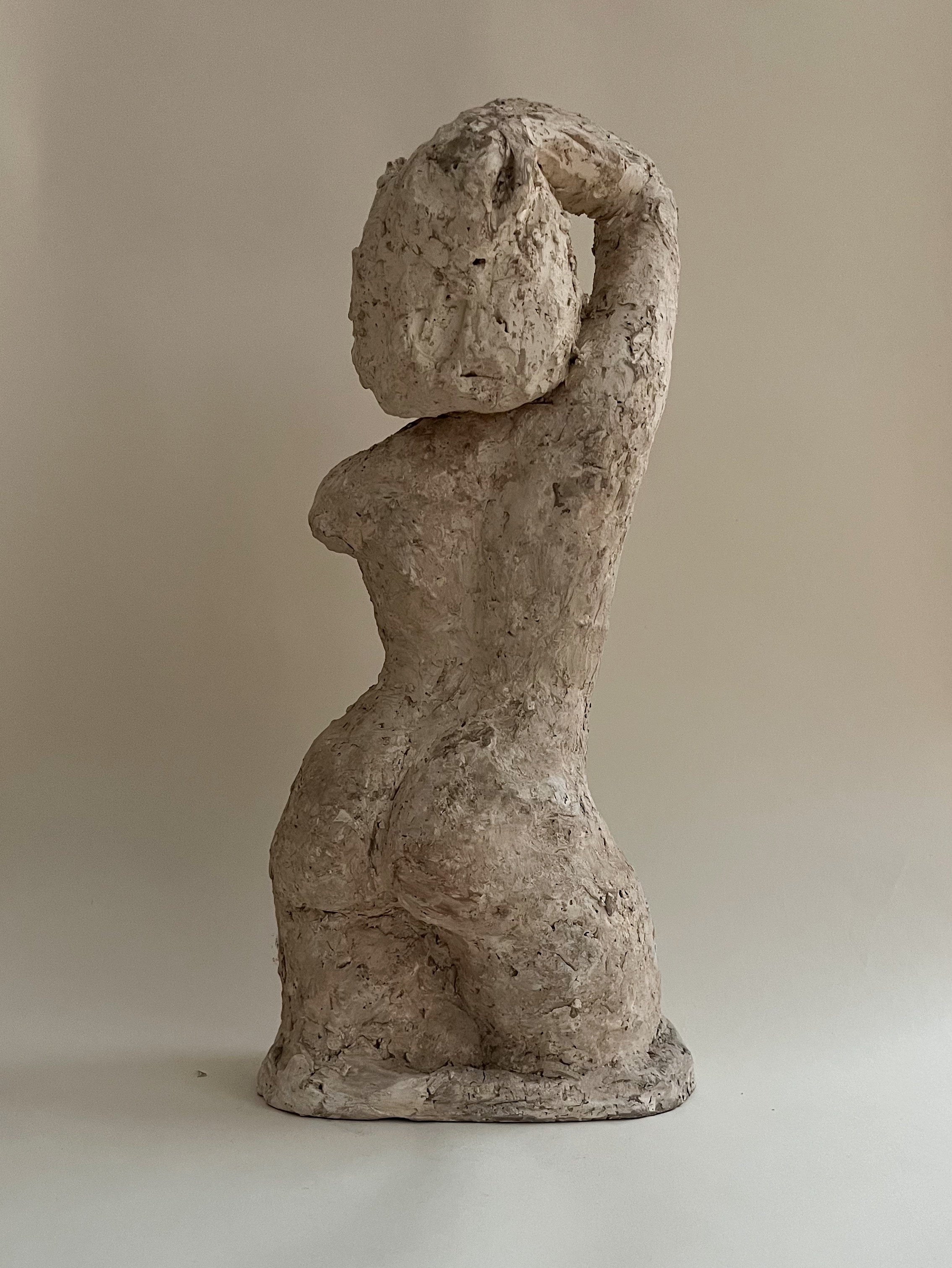 With its raw, tactile surface and commanding presence, this terracotta figure captures the timeless essence of Venus. The female form is rendered with expressive materiality—an arm raised in a gesture both sensual and statuesque, the body shaped by instinctive, almost primal strokes.