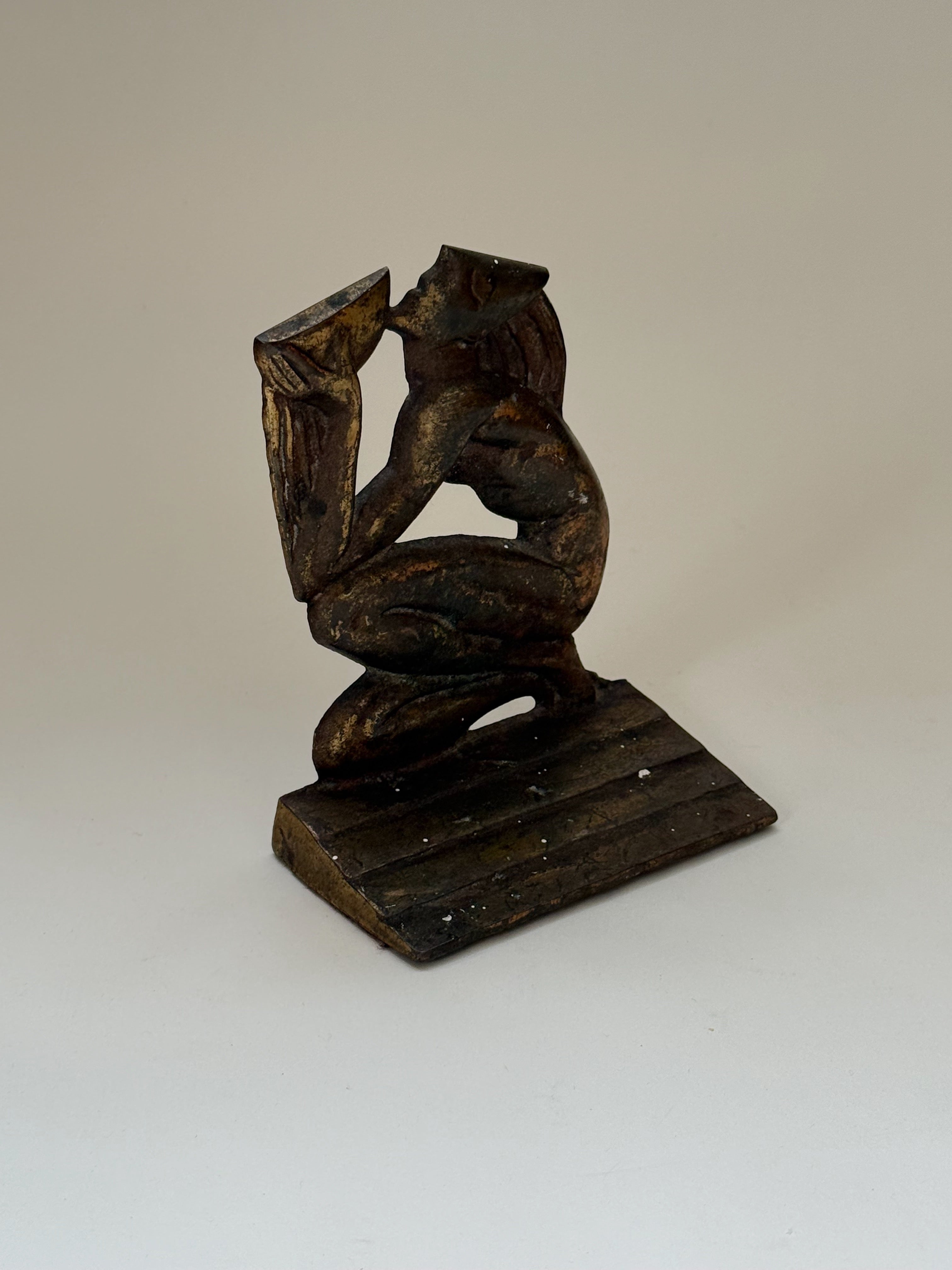 A striking metal bookend from the 1940s depicting a kneeling figure in the Aquarius motif, captured mid-gesture as it raises a vessel toward the sky. The sculptural form is defined by strong musculature and a streamlined silhouette, characteristic of late Art Deco classicism. Finished in a deep, dark bronze tone, the surface bears a richly aged patina that enhances its dramatic presence.