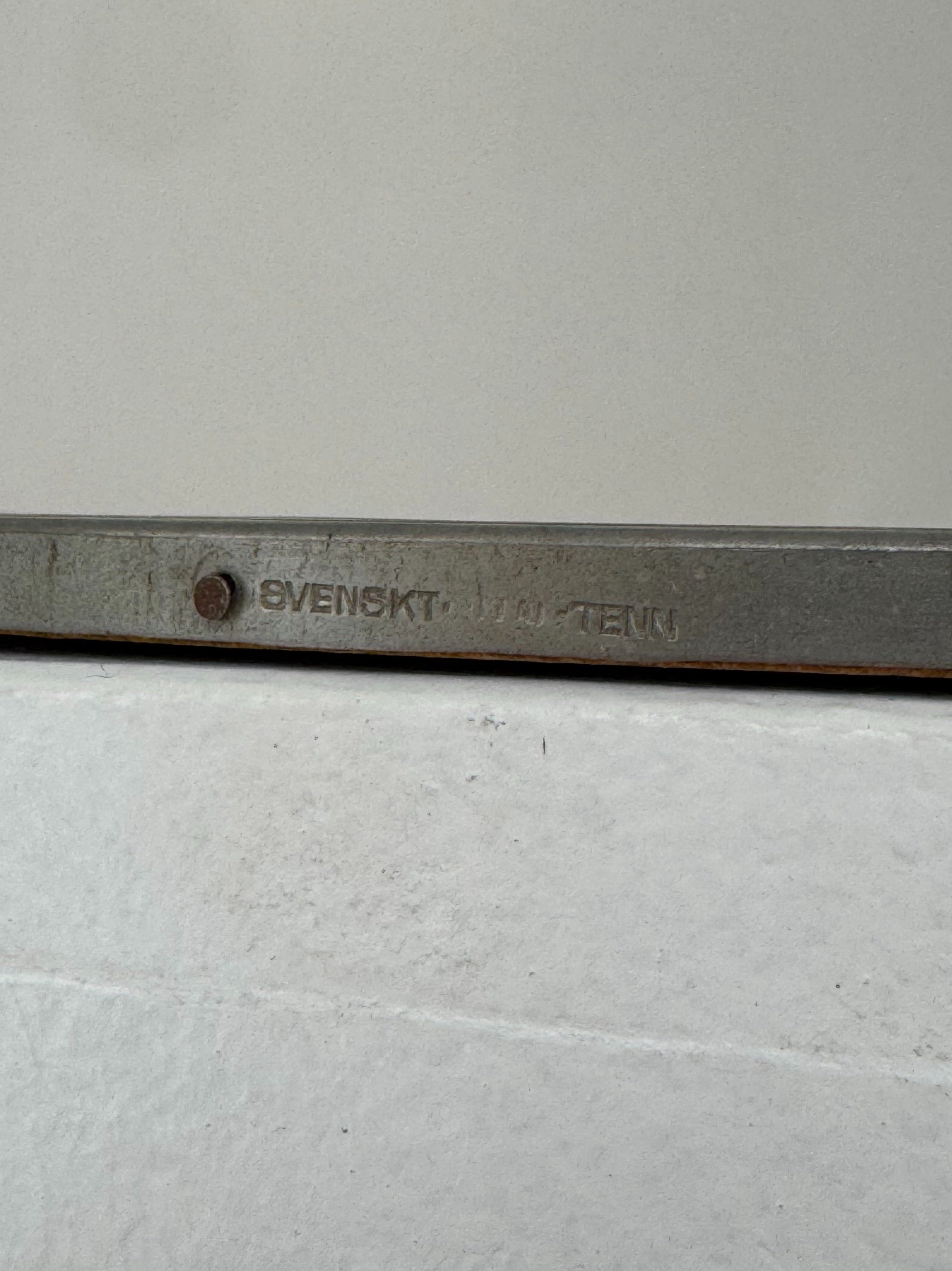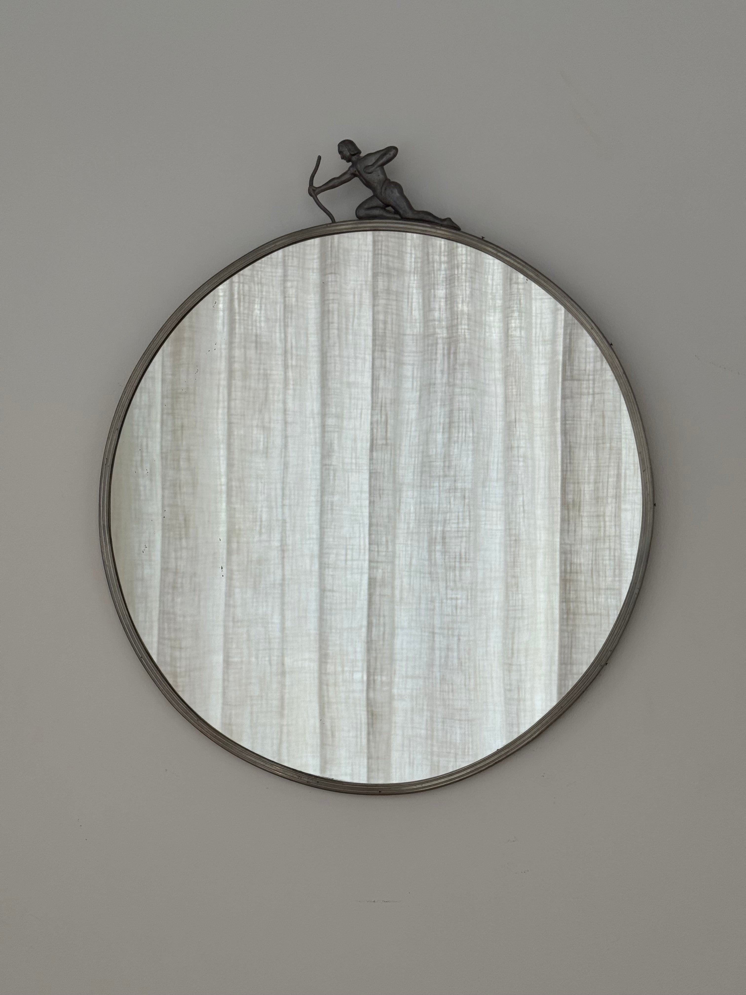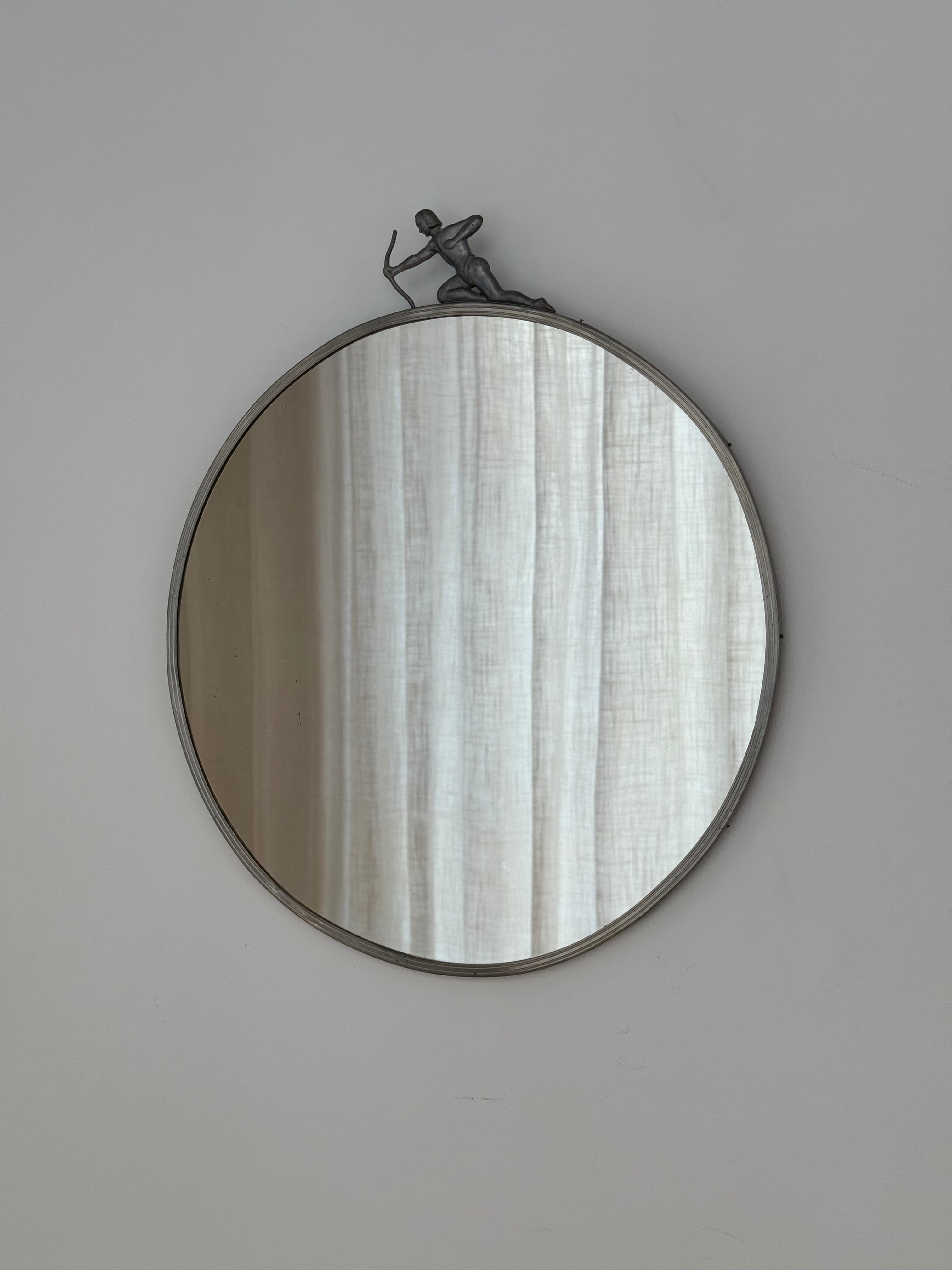 An exquisite Art Deco mirror from the 1930s/40s, crafted in pewter and crowned with a sculptural figure of an archer. Marked Svenskt Tenn. The elegant circular form is elevated by the poised silhouette above, a detail that adds both movement and symbolism to the piece.