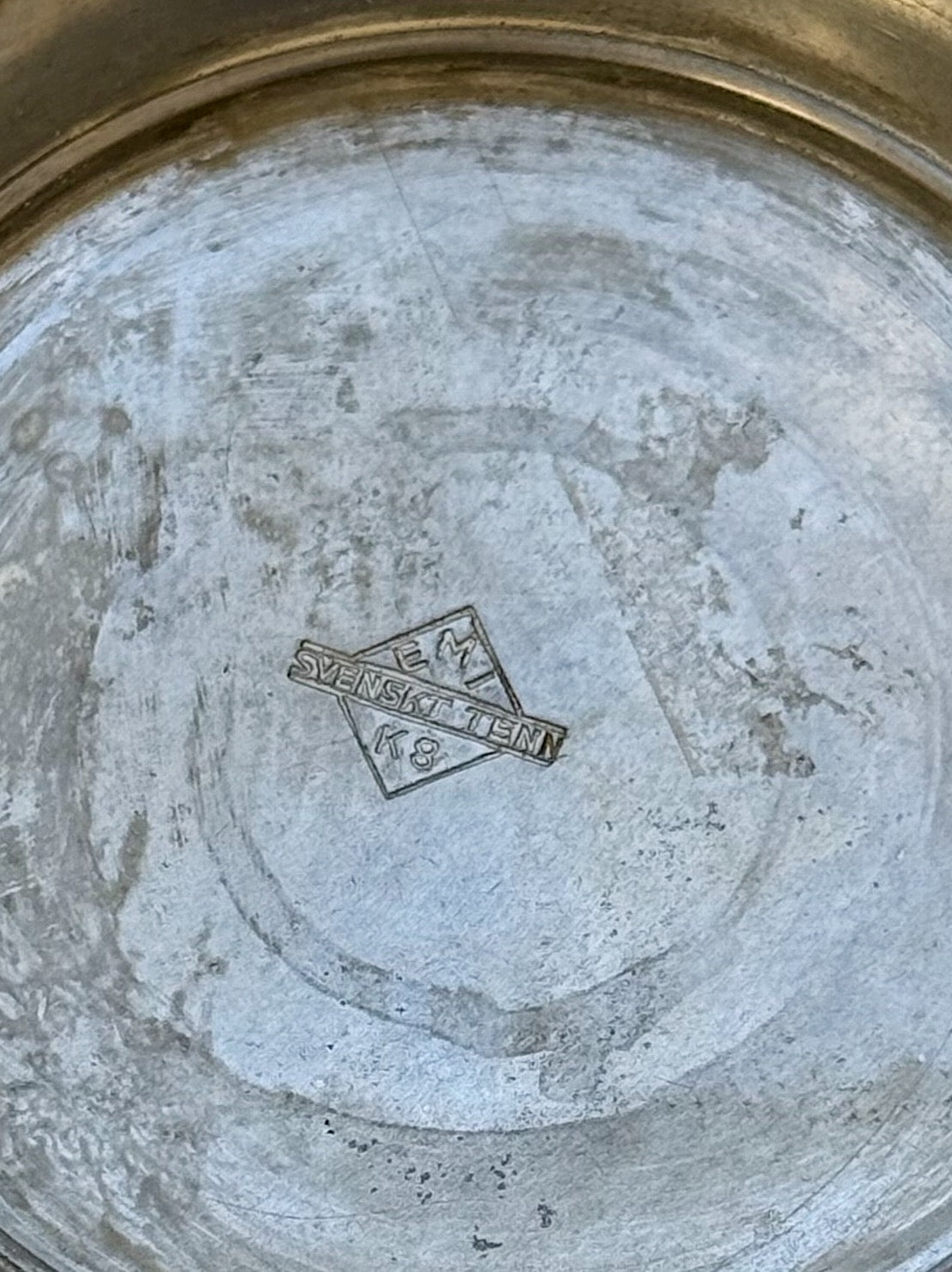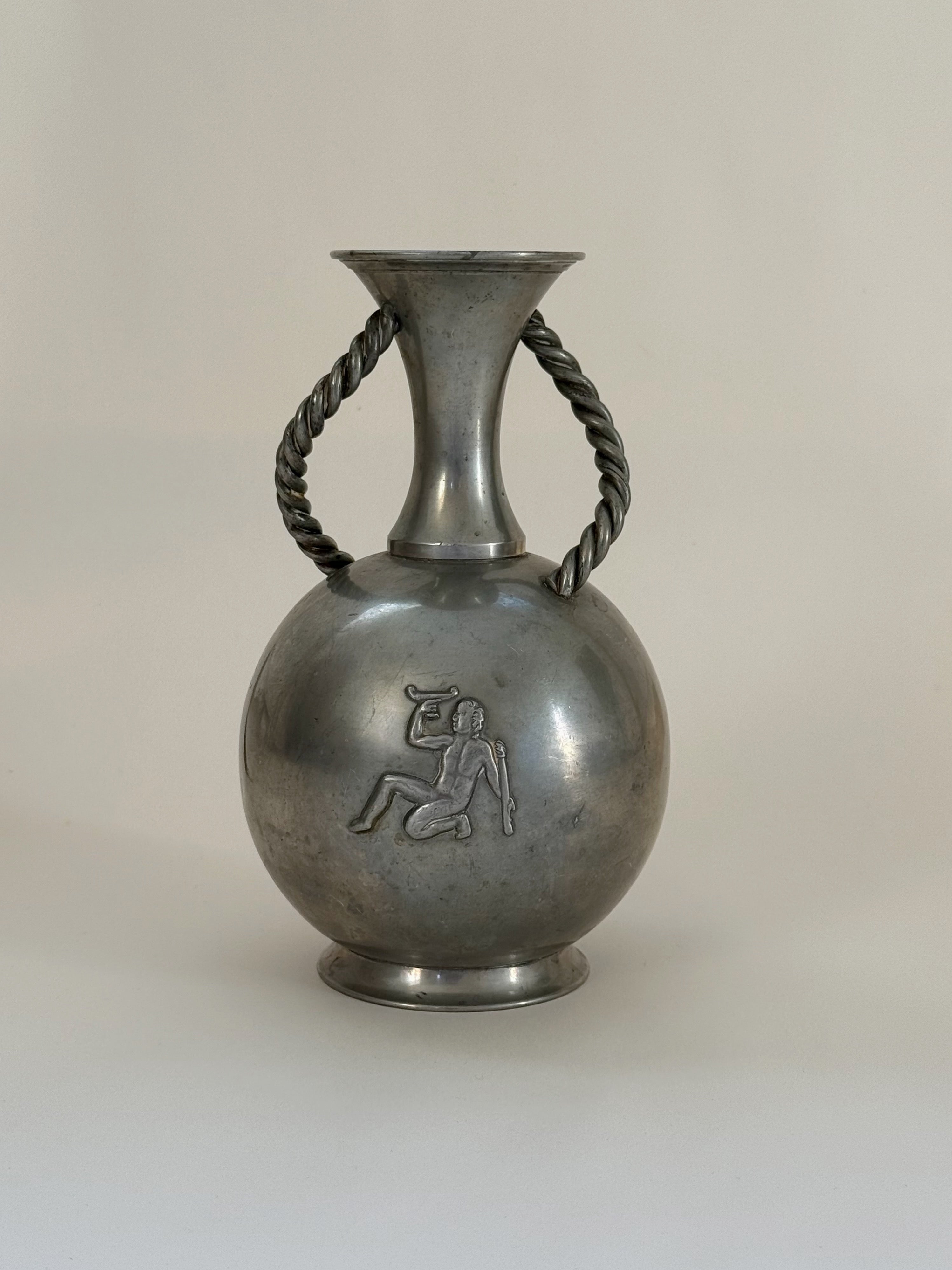 A sculptural Art Deco pewter vase by EMI, dated 1936. The rounded, globular body is balanced by a tall, flaring neck and rests on a discreet circular foot, creating a harmonious and architectural silhouette.