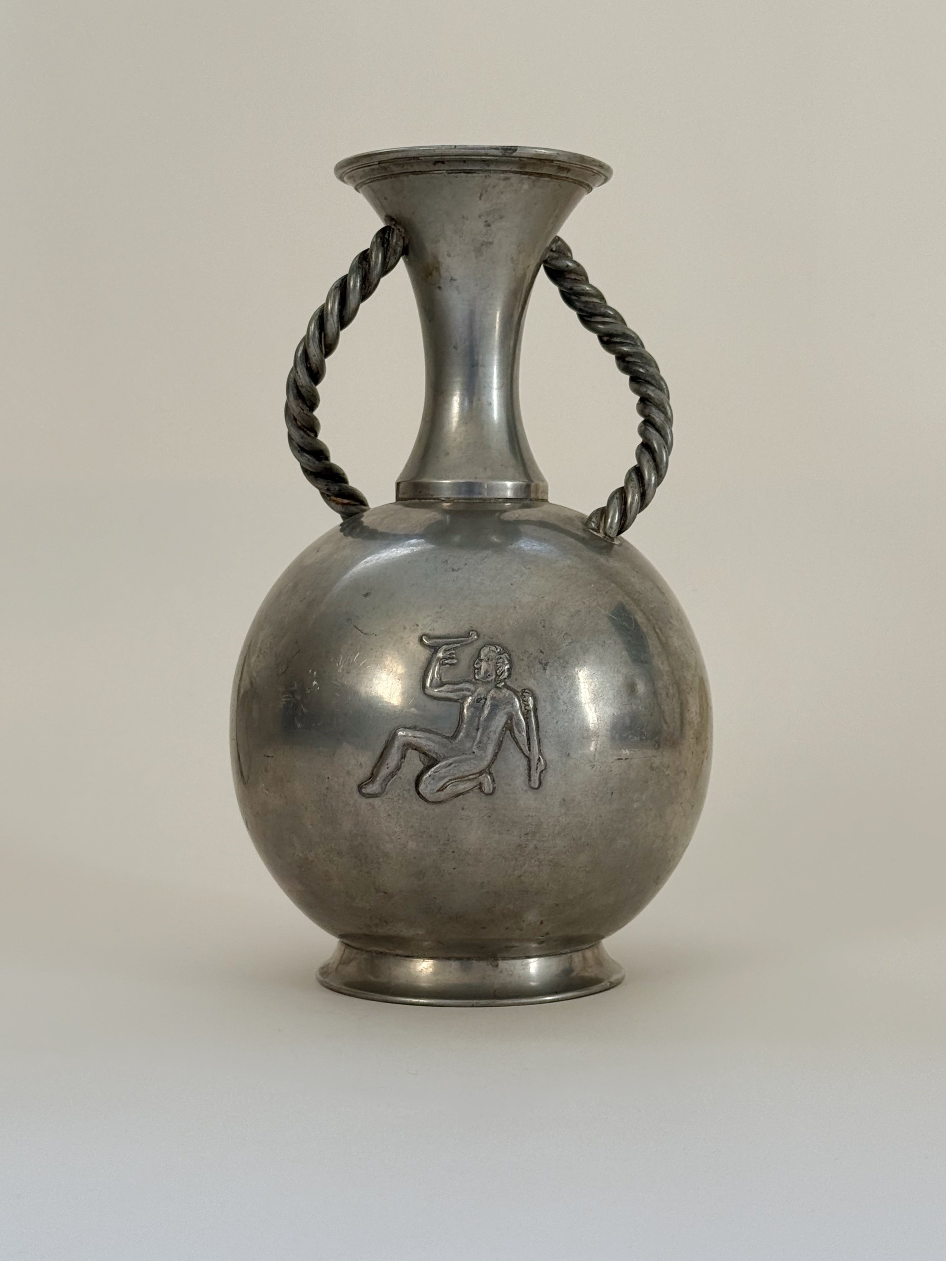 Twisted loop handles frame the form, introducing movement and tension, while the body is adorned with a stylised relief of a seated figure, lending the piece a distinctly decorative yet restrained character typical of the period.