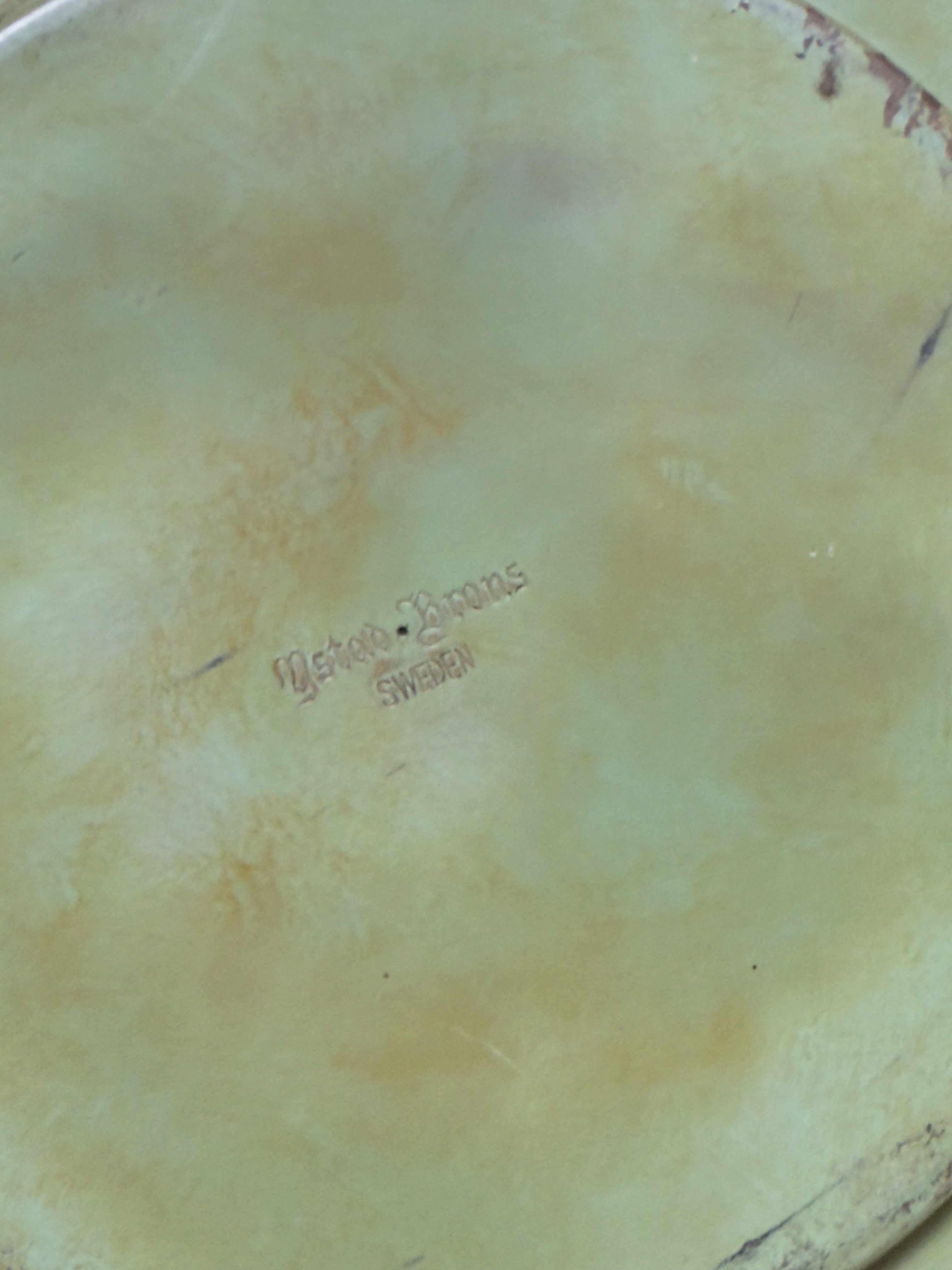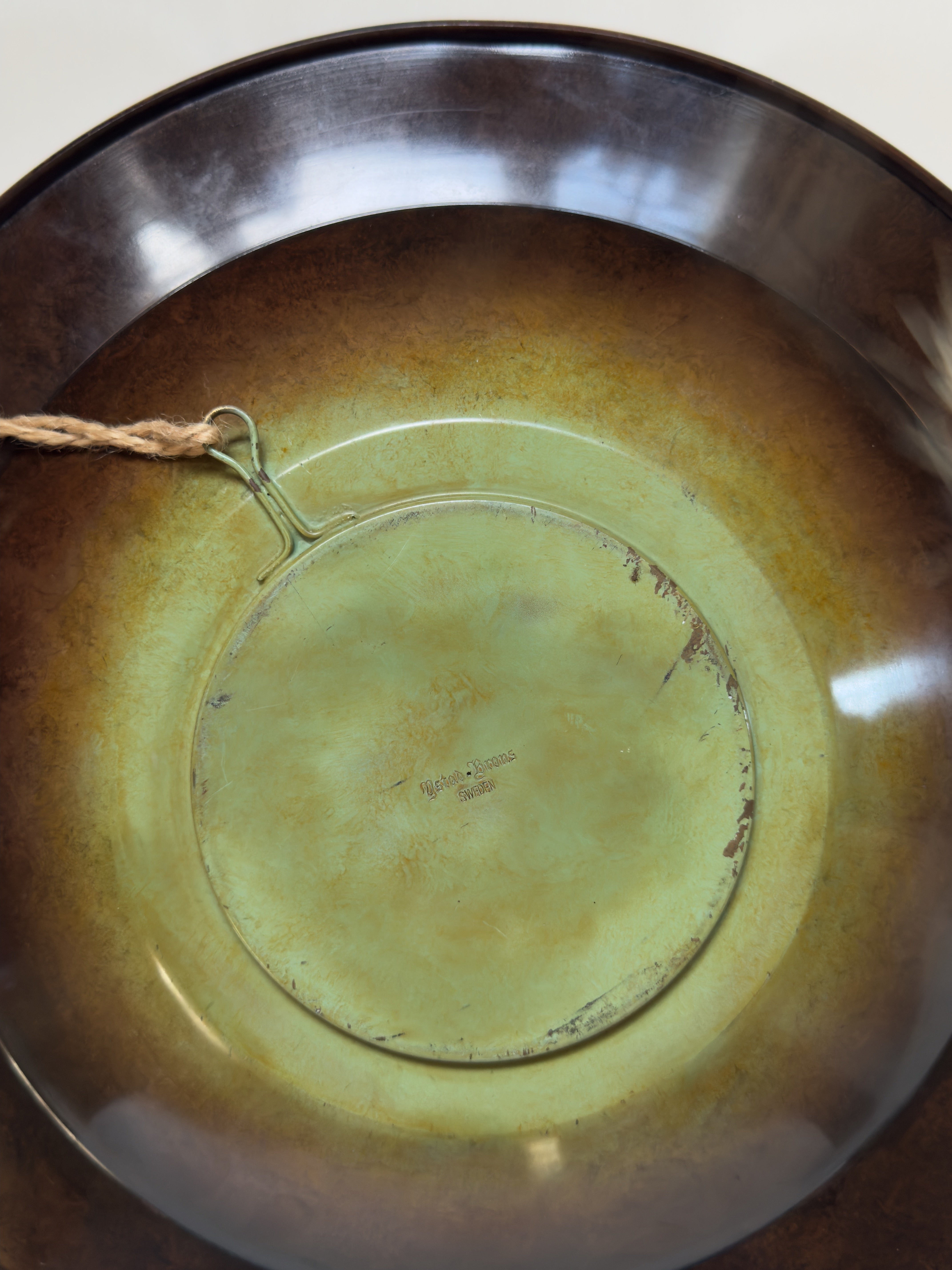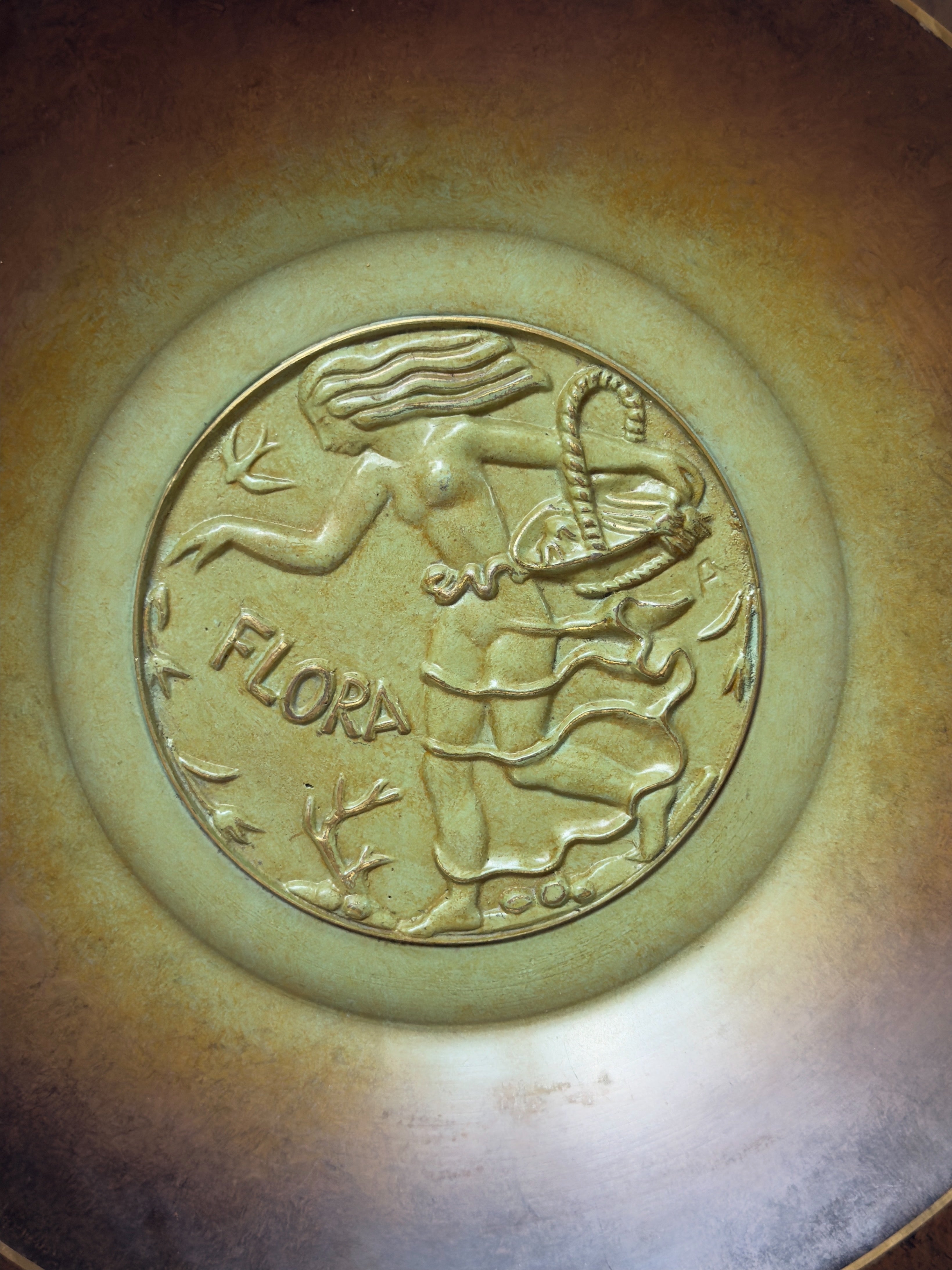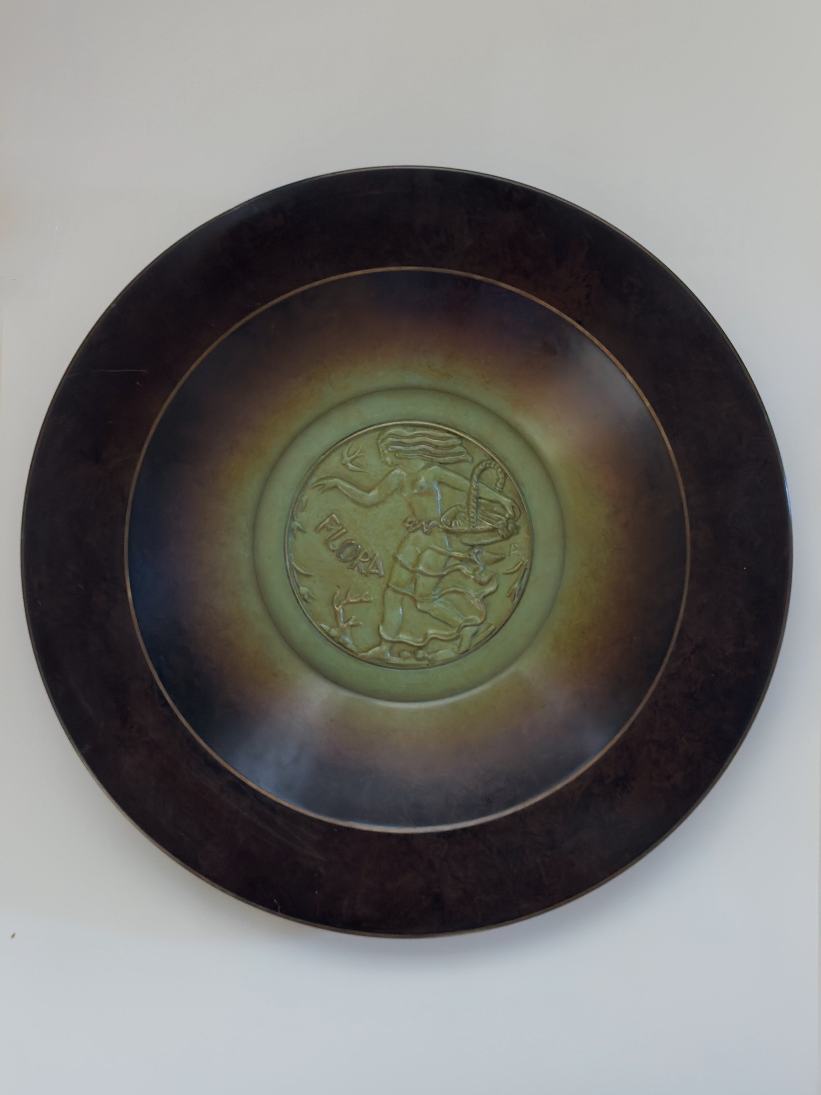 A large and striking Art Deco wall plate designed by Oskar Antonson for Ystad Brons. Measuring approximately 40 cm in diameter, the piece features a beautifully patinated surface with a central relief medallion depicting Flora, the Roman goddess of flowers and spring. The gradation of deep bronze and green tones gives the plate a sculptural depth, making it as much a decorative artwork as a functional object.