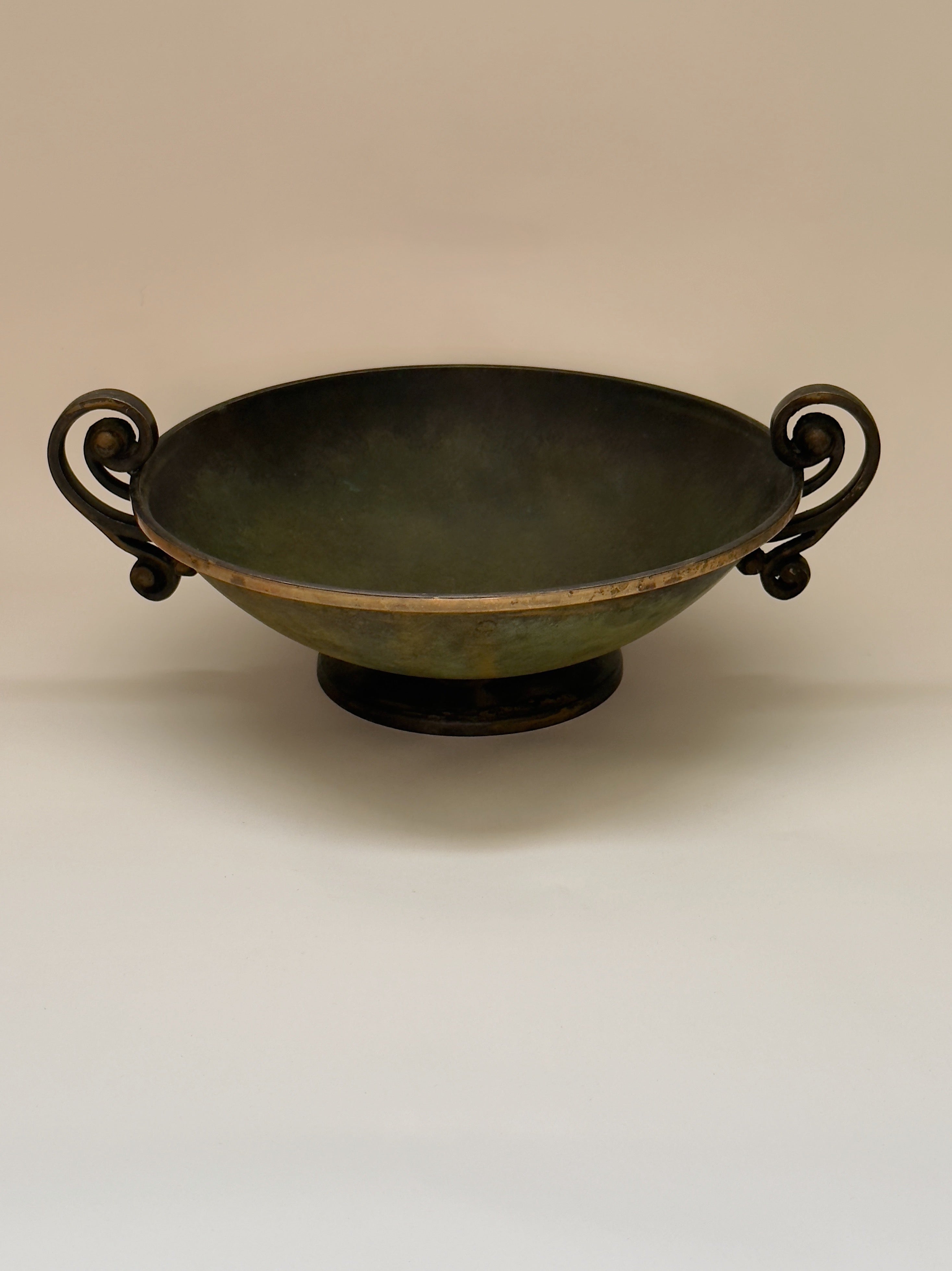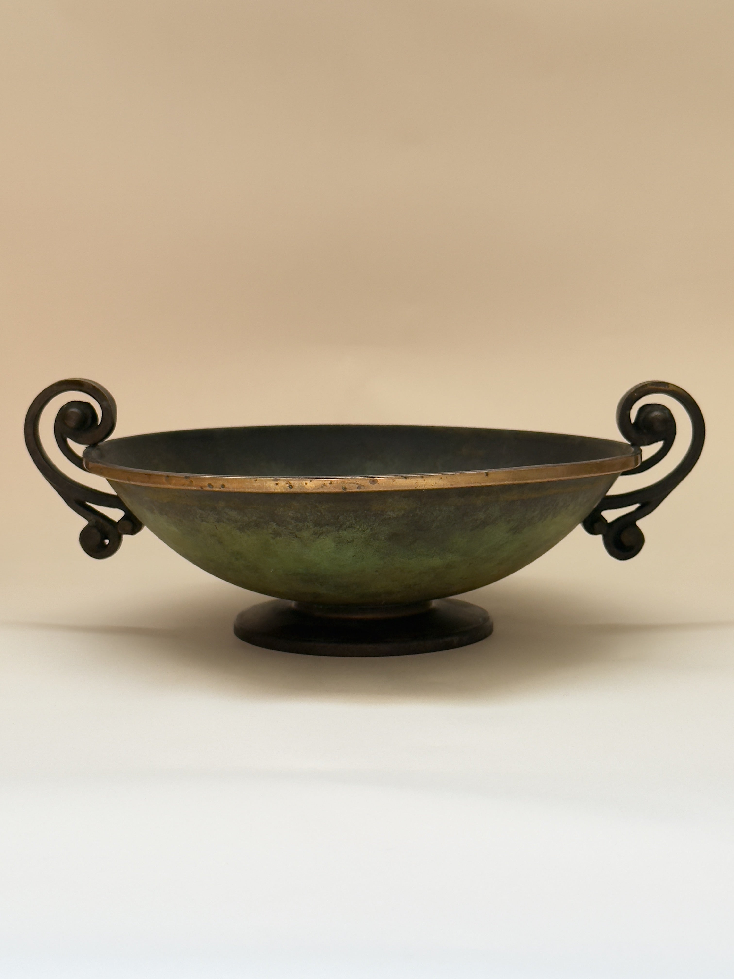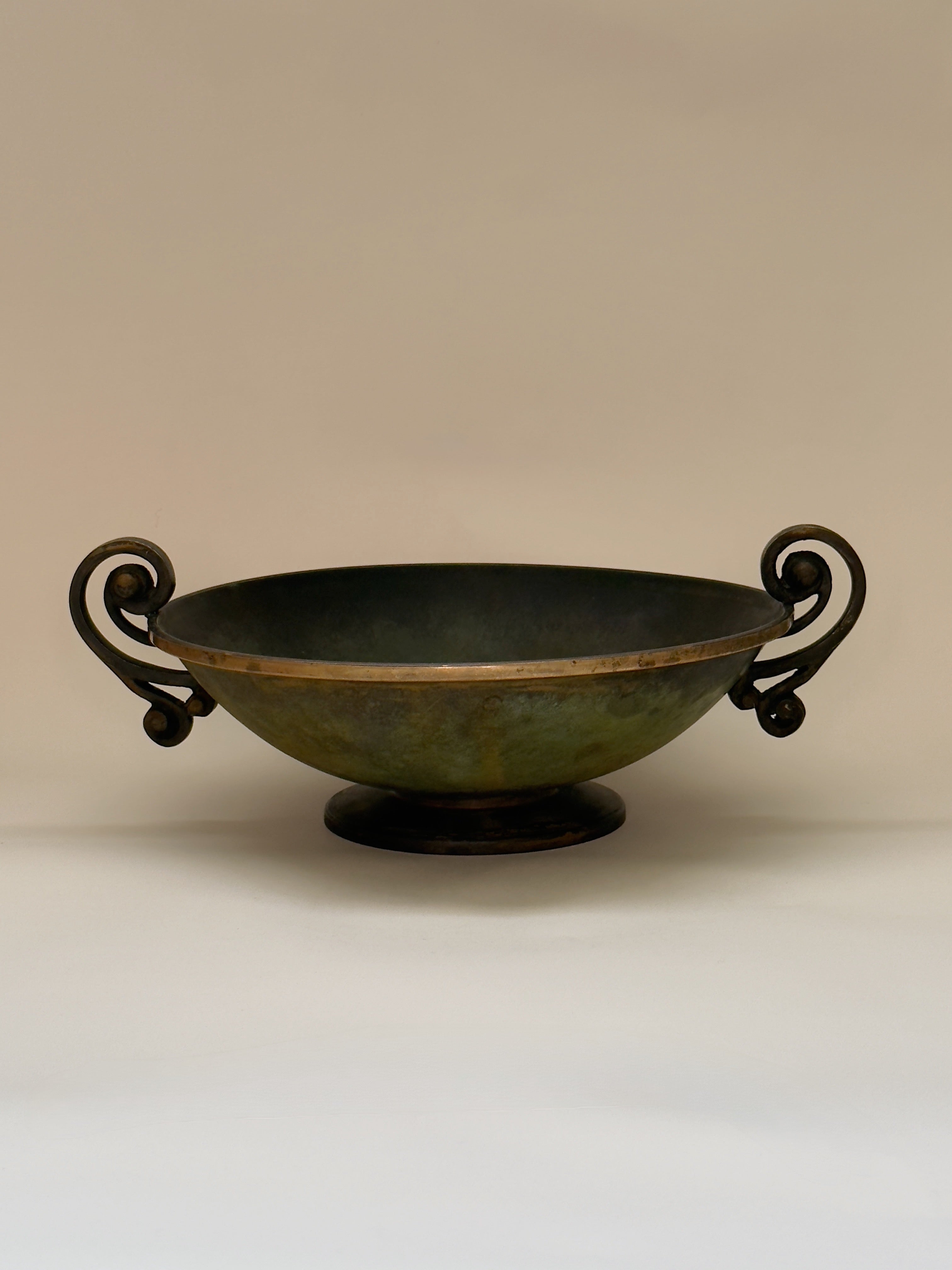 A striking decorative bronze bowl with elegantly scrolled handles, crafted by H.F. Agte Bronce Ildfast. Resting on a rounded foot, its sculptural form is enhanced by a rich, time-softened patina that brings depth and character. With a timeless design that bridges utility and ornament, it makes a refined centerpiece for any interior.