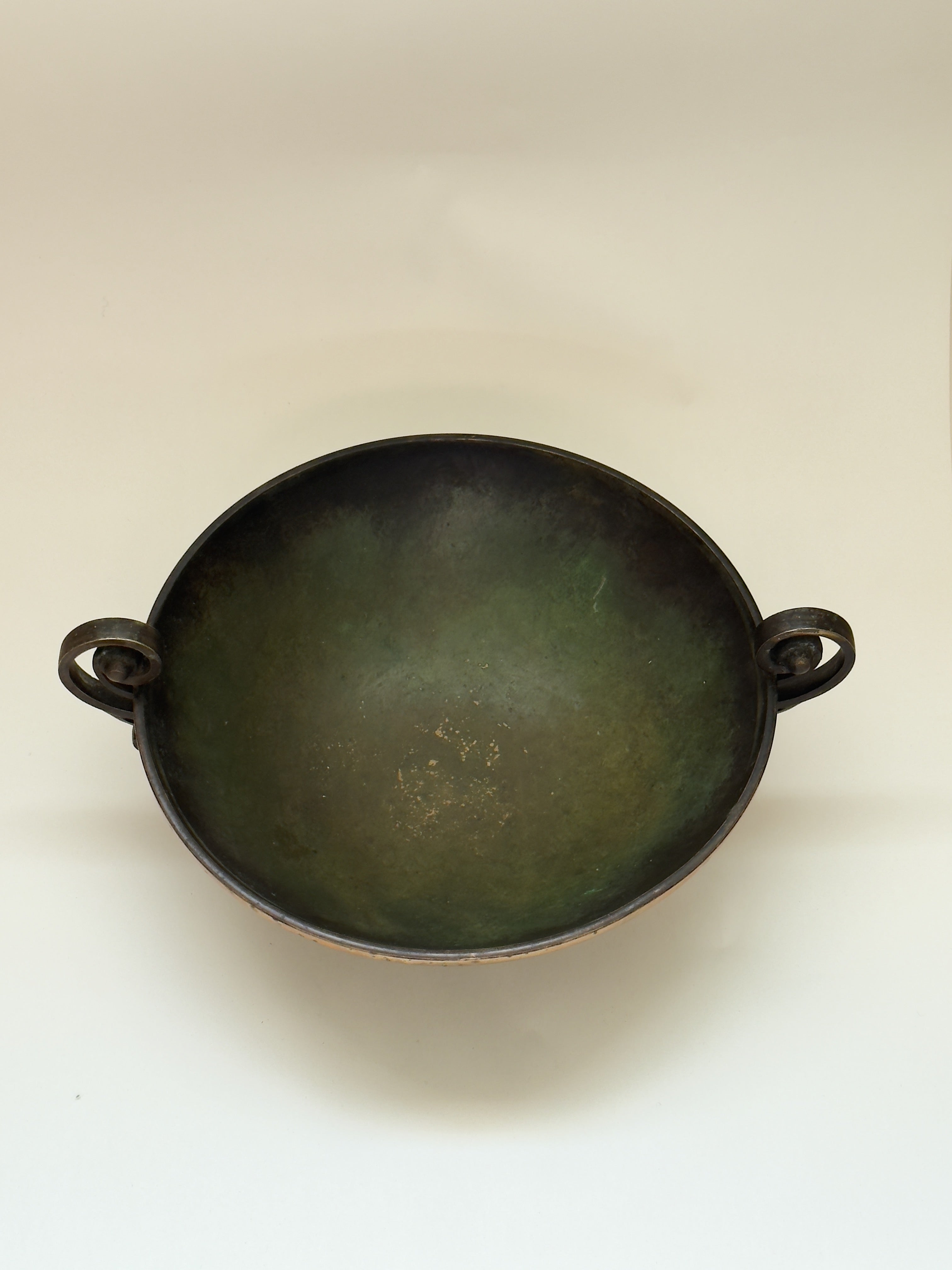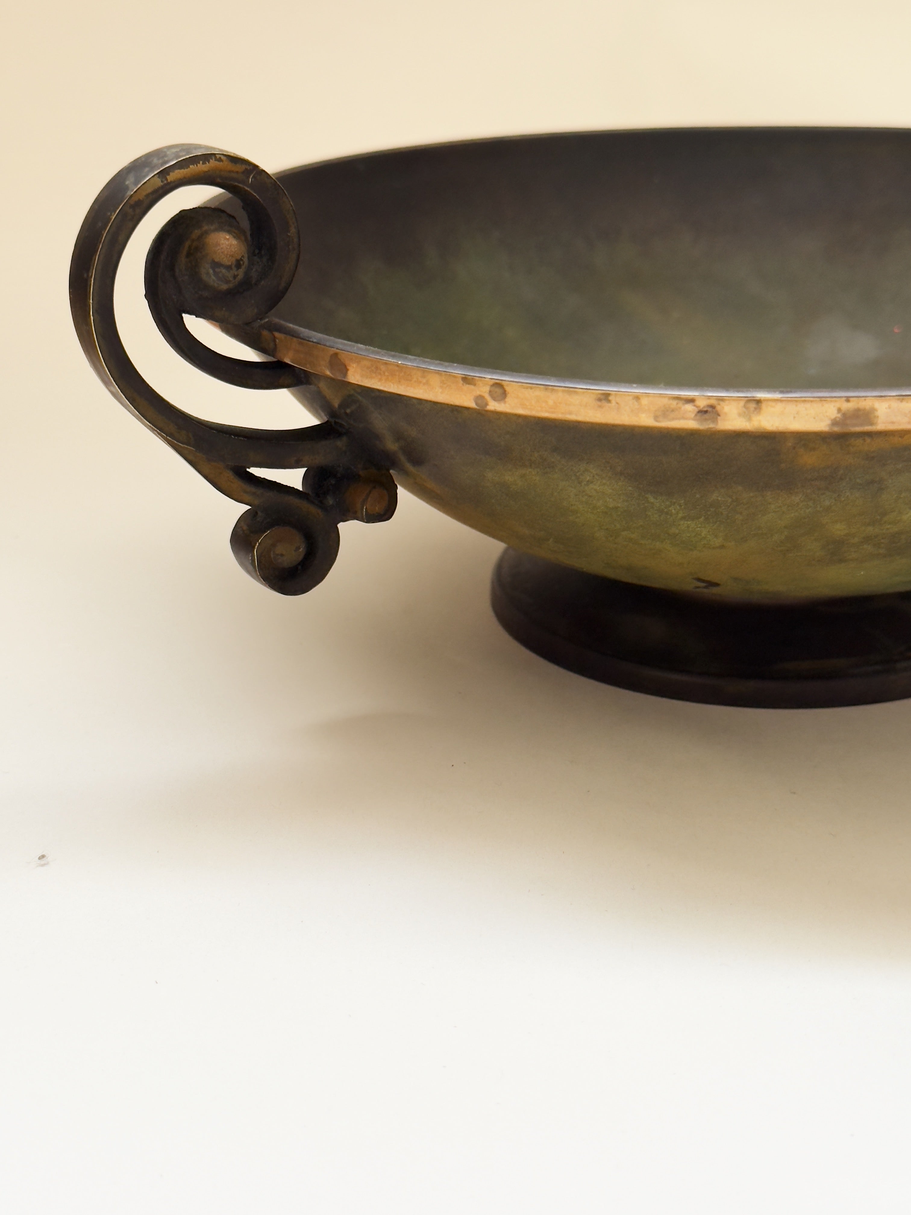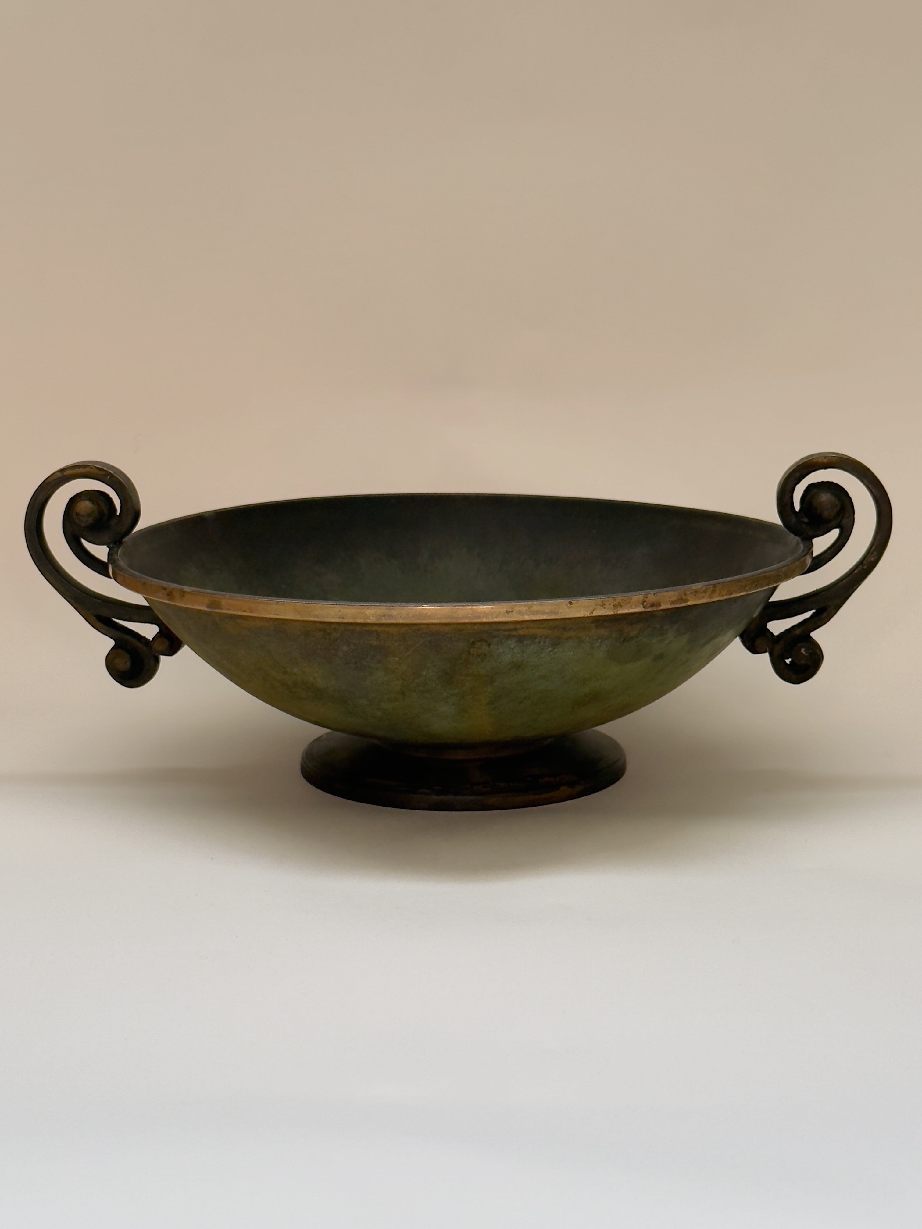 A striking decorative bronze bowl with elegantly scrolled handles, crafted by H.F. Agte Bronce Ildfast. Resting on a rounded foot, its sculptural form is enhanced by a rich, time-softened patina that brings depth and character. With a timeless design that bridges utility and ornament, it makes a refined centerpiece for any interior.