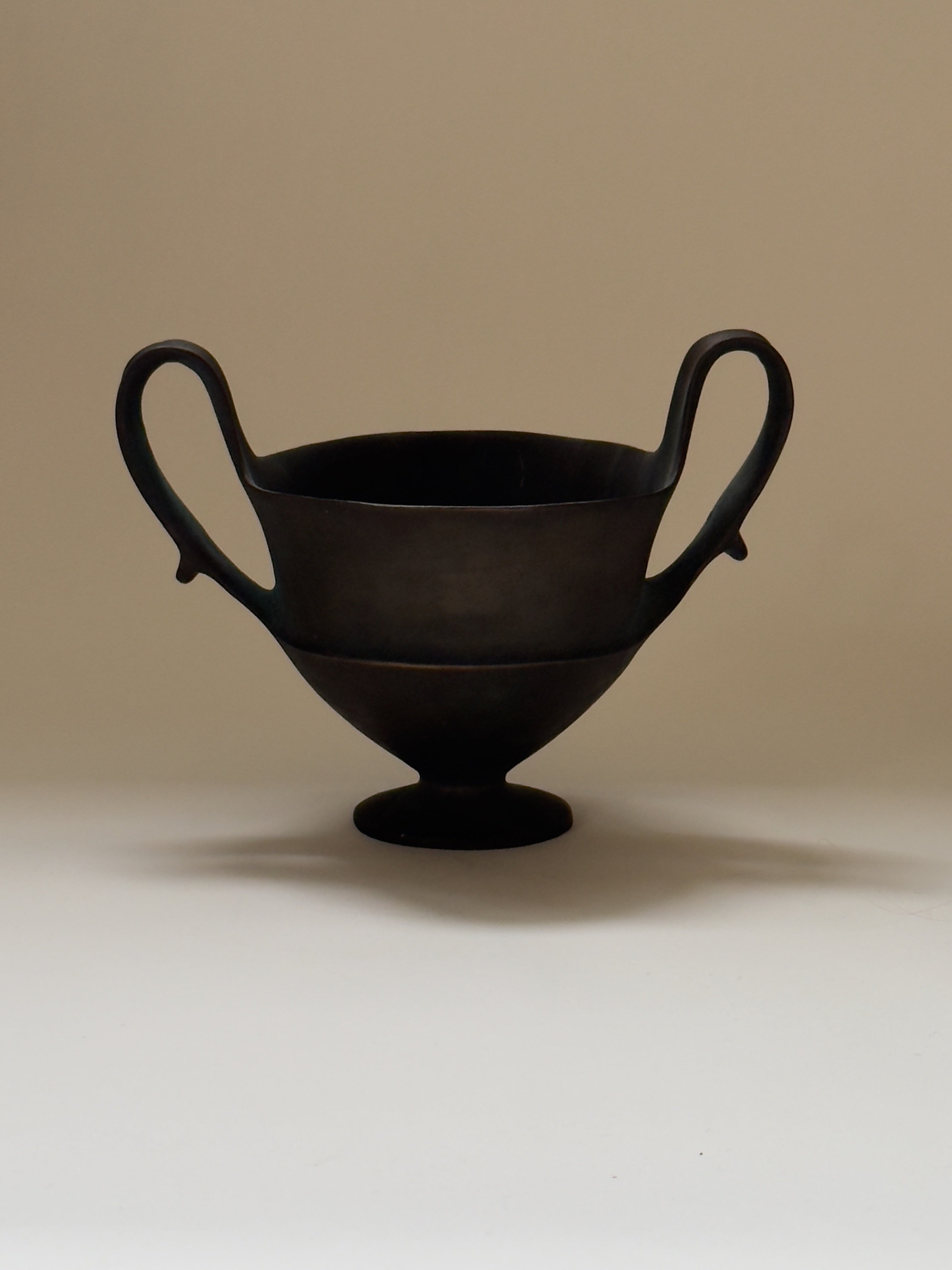 A sculptural interpretation of the ancient kantharos, this patinated bronze bowl draws inspiration from 6th-century Etruscan drinking vessels once used at symposia—ritual gatherings where wine, conversation, and philosophy flowed freely. With its sweeping high handles and flared form, the piece echoes classical iconography often associated with Dionysus, god of wine and revelry.