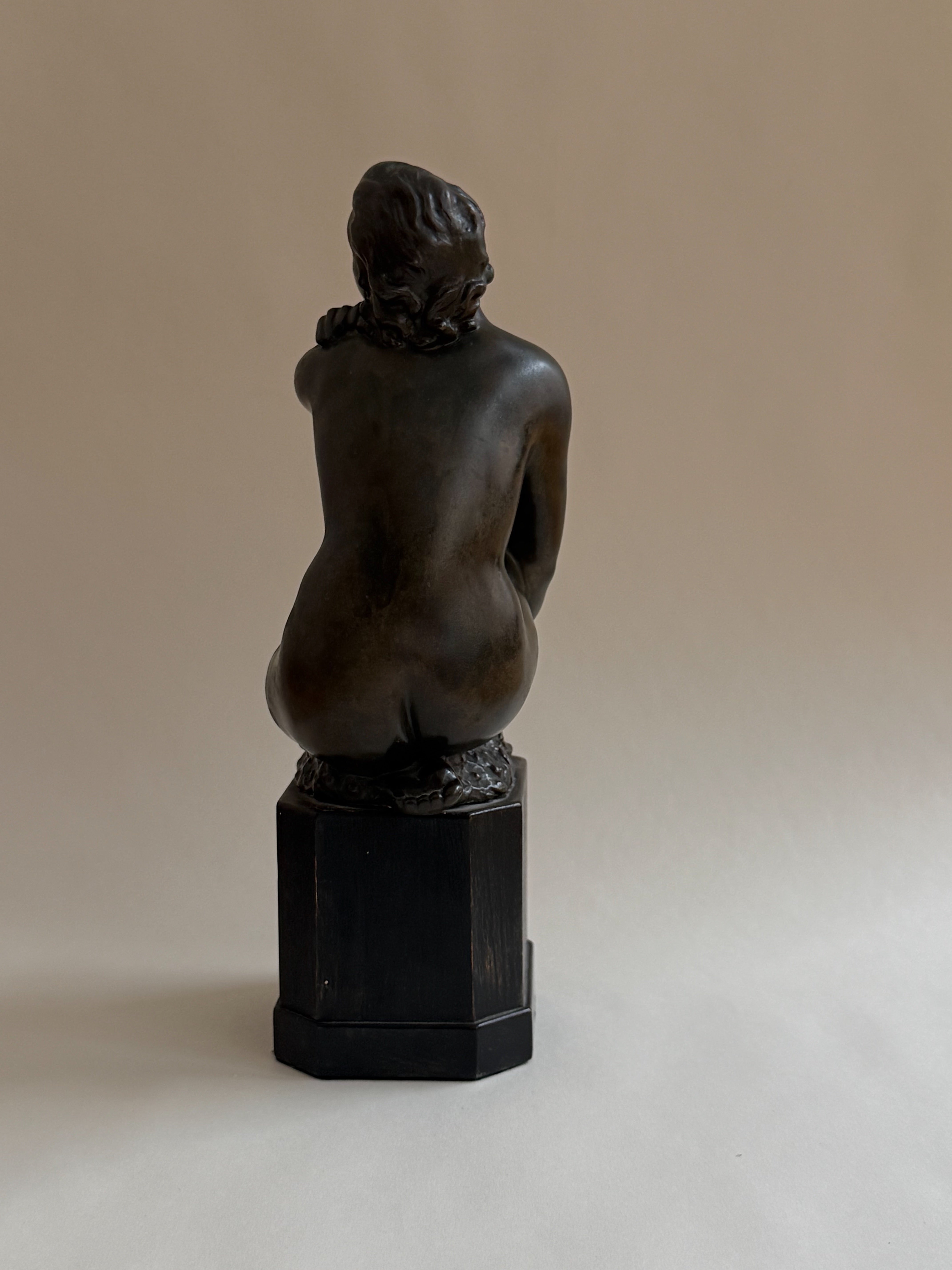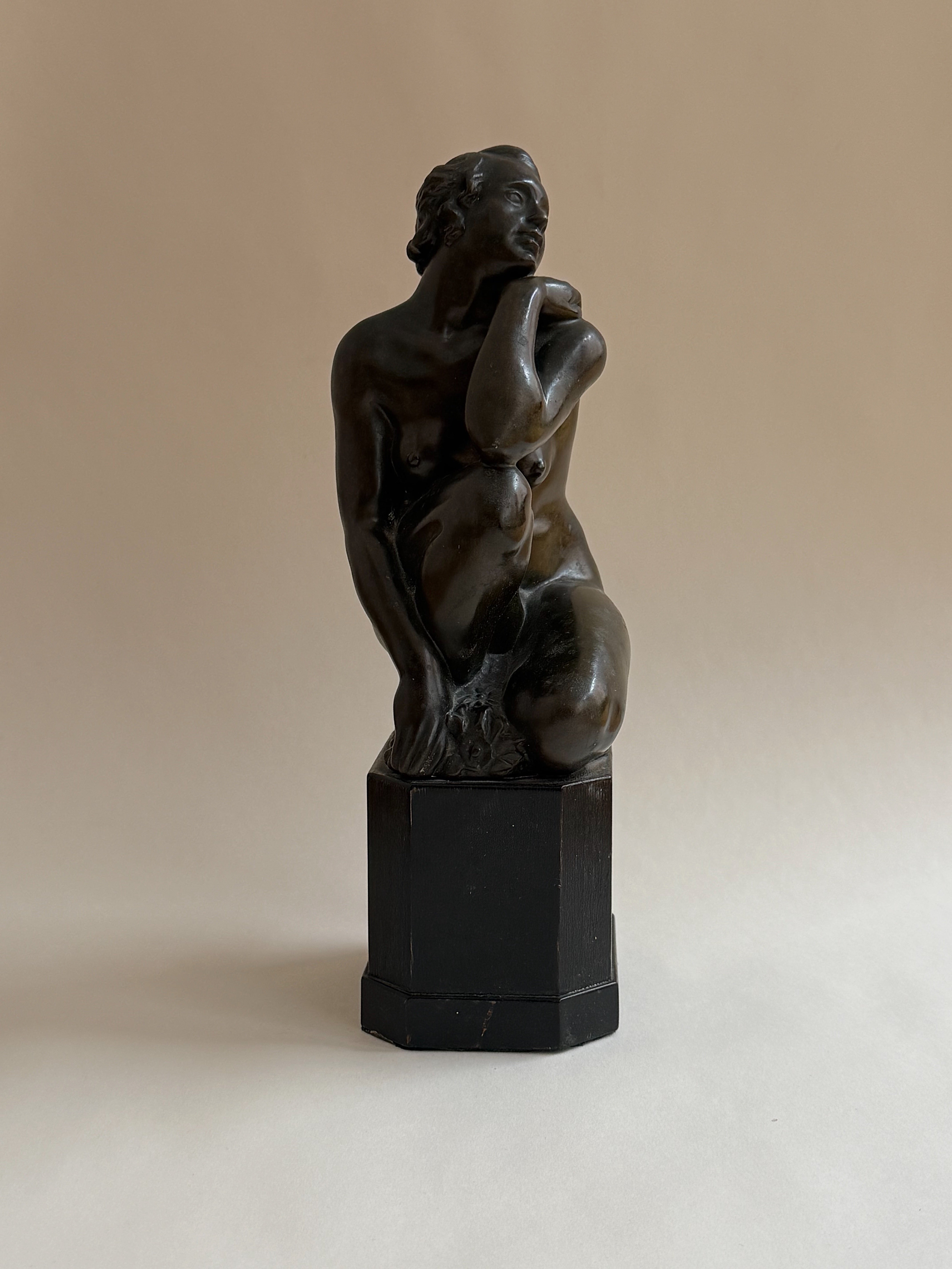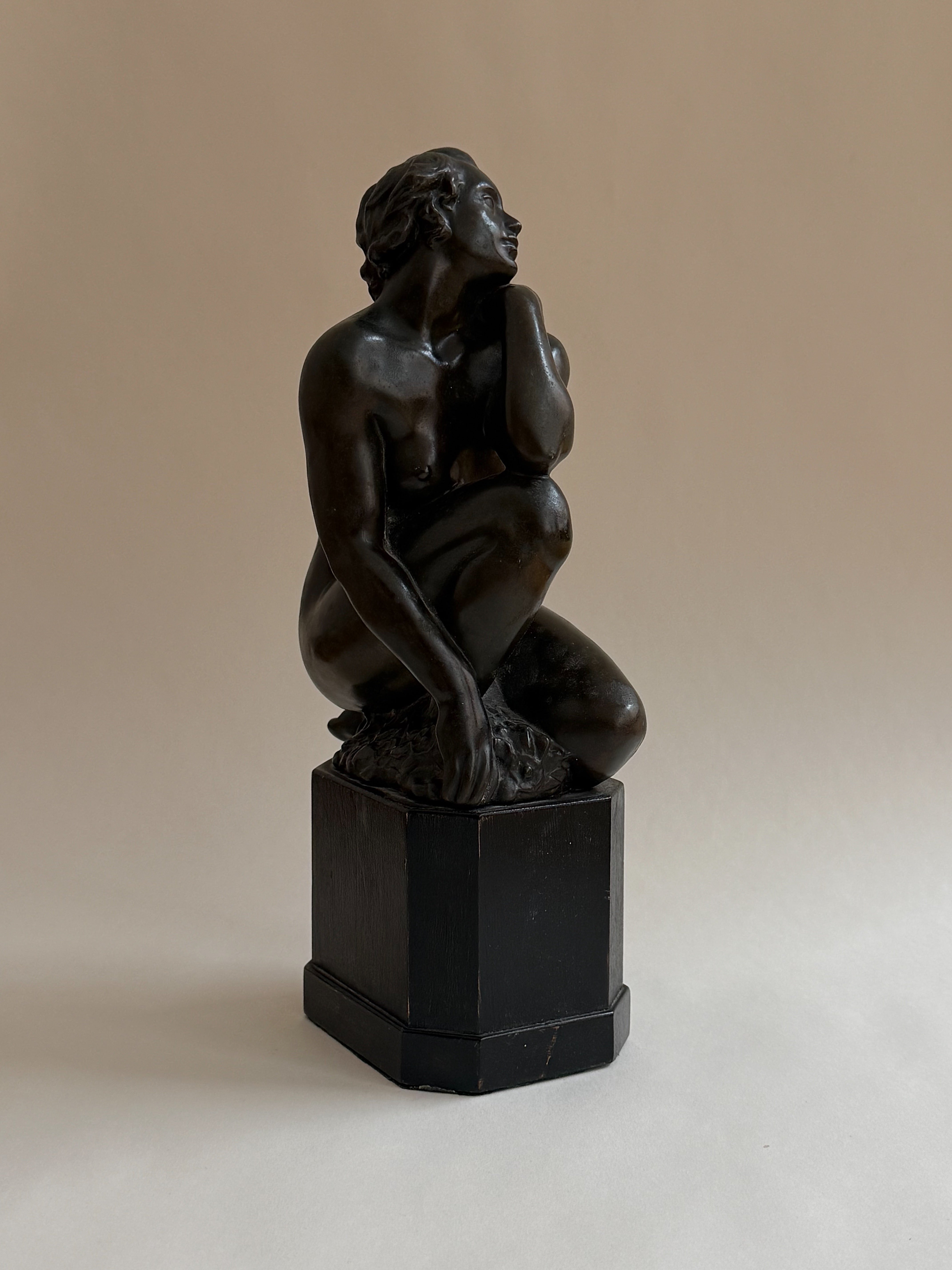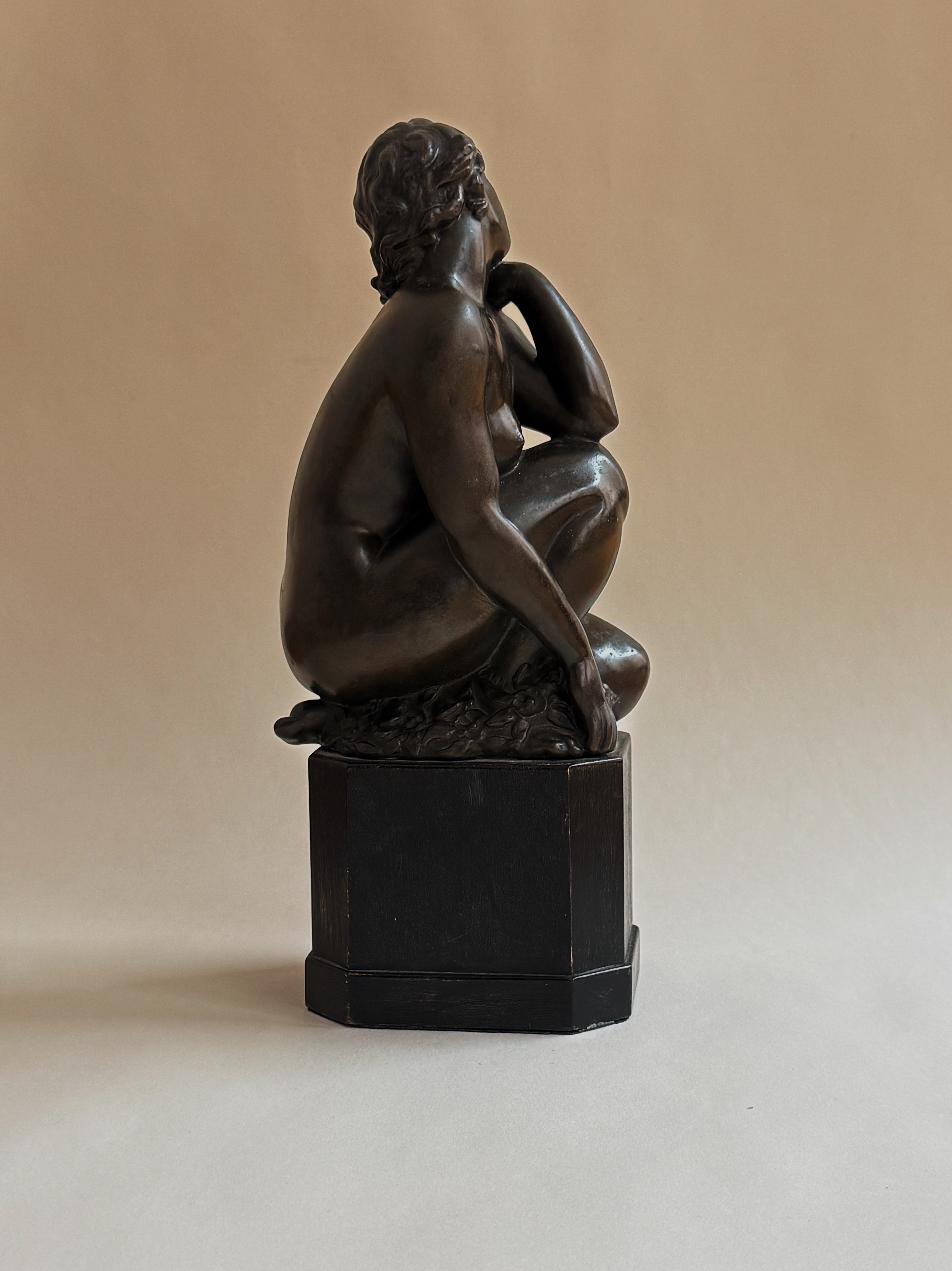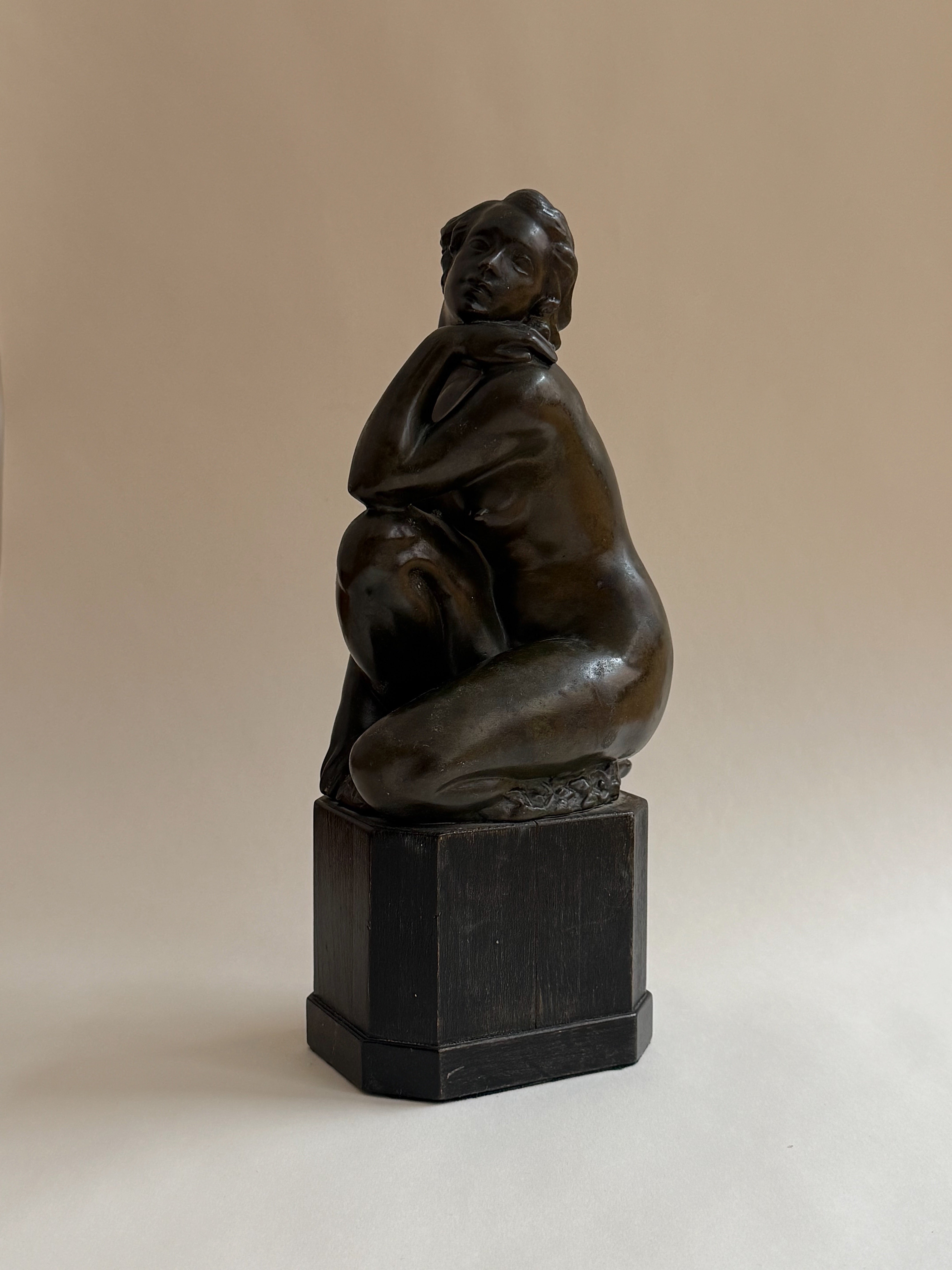 A finely modelled bronze sculpture by an unknown artist, depicting a seated woman, rendered with a quiet sense of intimacy and restraint. The figure’s pose is relaxed yet expressive, with softly articulated forms and a subtle play between tension and repose. The surface has developed a rich, dark patina that enhances the sculptural depth and sense of warmth. Mounted on a wooden plinth, the sculpture has a timeless, contemplative presence.