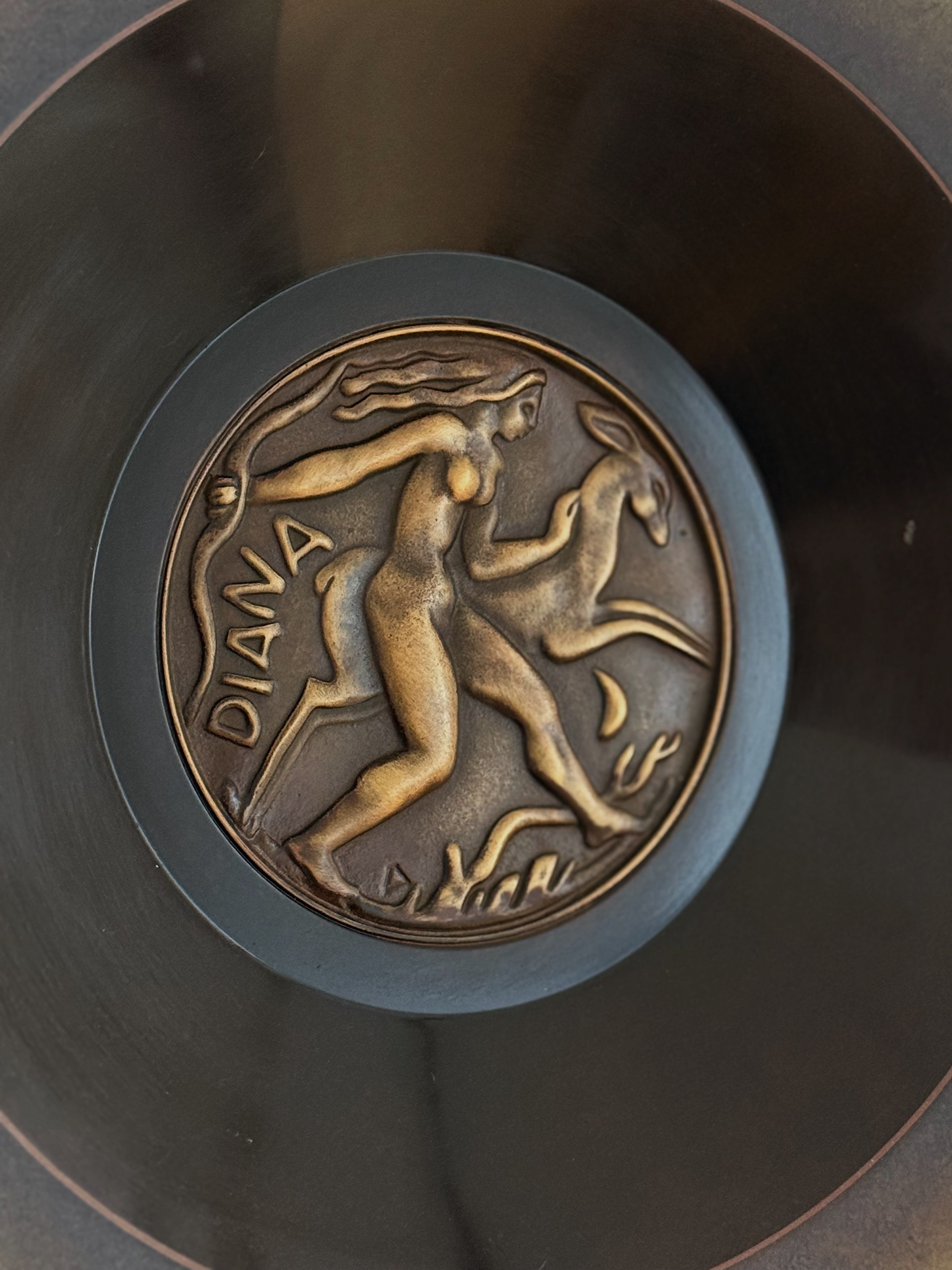 A large and striking Art Deco wall plate designed by Oskar Antonson for Ystad Brons. Measuring approximately 40 cm in diameter, the piece features a beautifully patinated surface with a central relief medallion depicting Diana, the Roman goddess of the wild animals and the hunt. The gradation of deep bronze and green tones gives the plate a sculptural depth, making it as much a decorative artwork as a functional object.