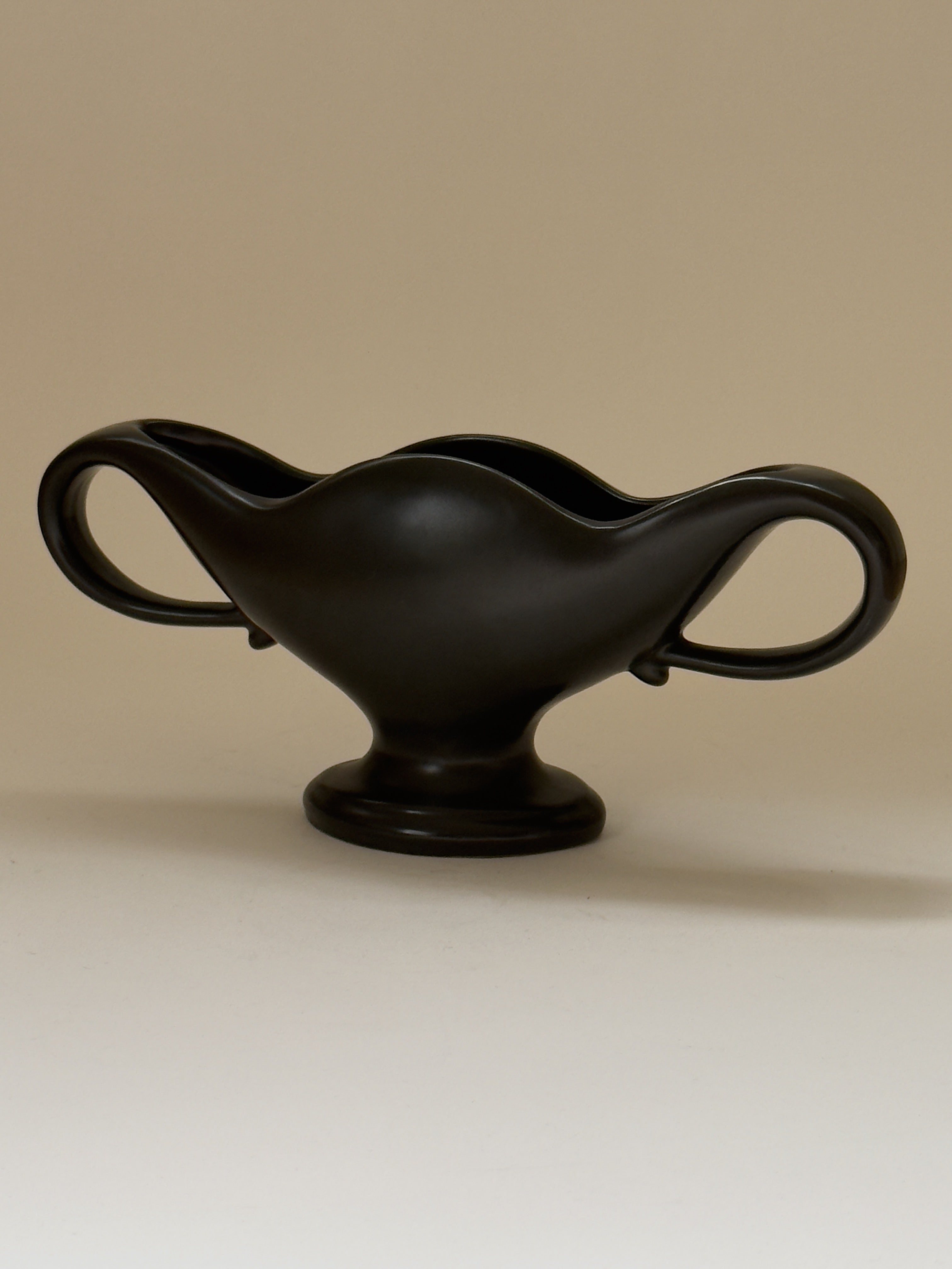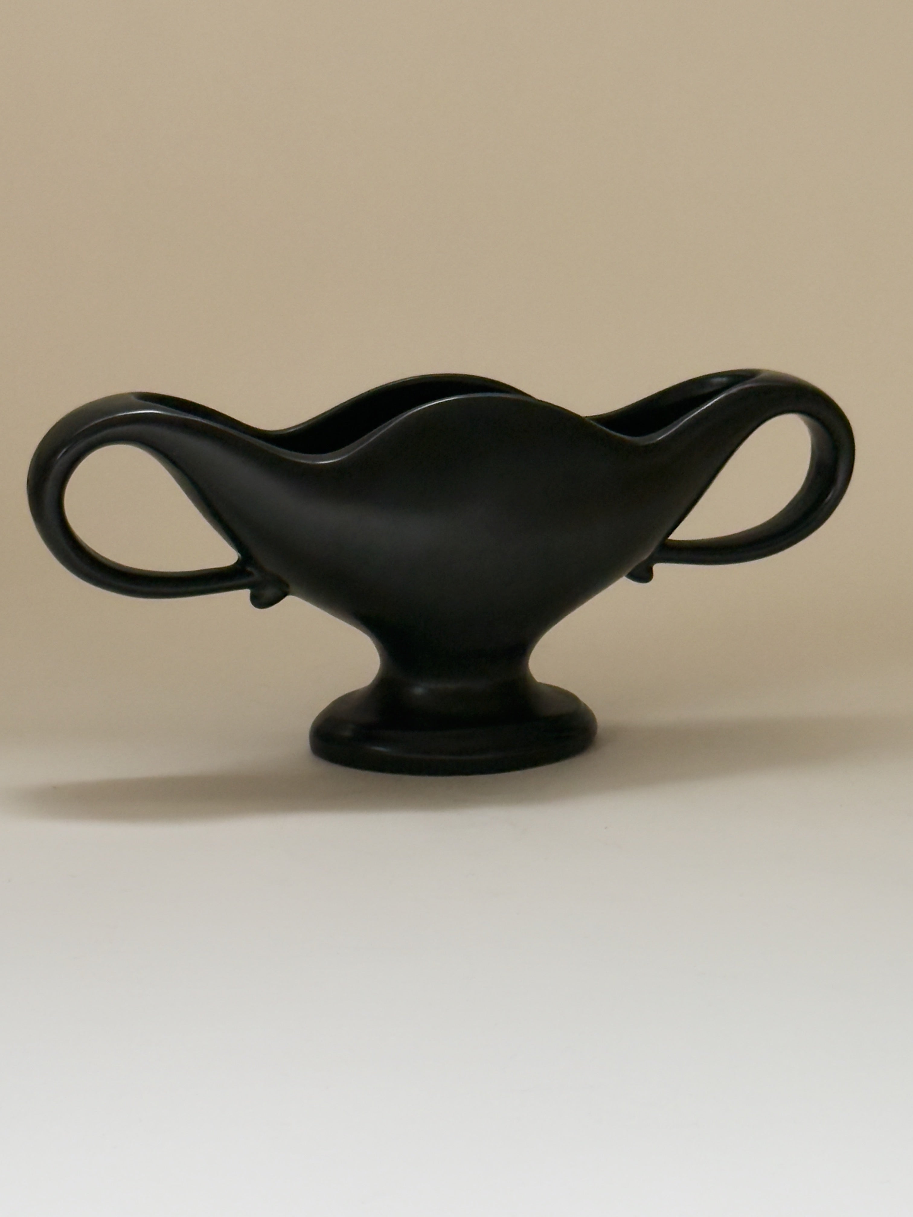A small vintage mantle vase by Fulham Pottery, England, circa 1930s. Executed in a deep black glaze, the vase rests on an oval footed base and is defined by its sweeping, sculptural side handles. The lustrous finish accentuates the vase’s elegant curves, lending it a striking presence while retaining the quiet sophistication characteristic of early 20th-century British ceramics. Stamped “Fulham Pottery, Made in England” on the underside.