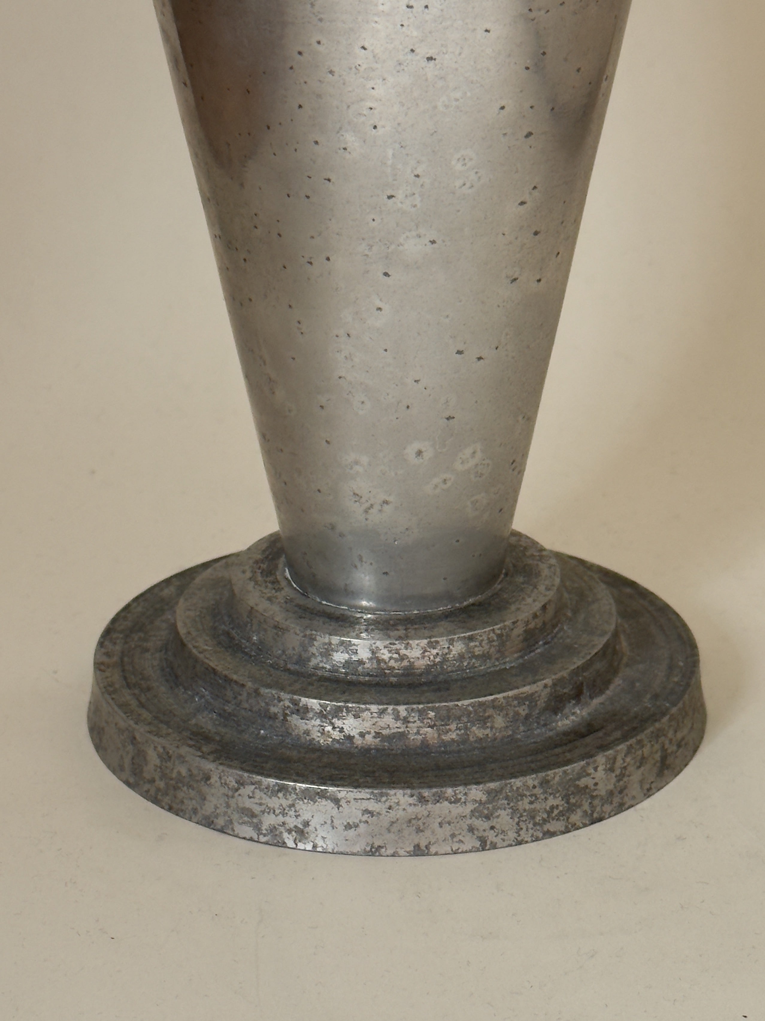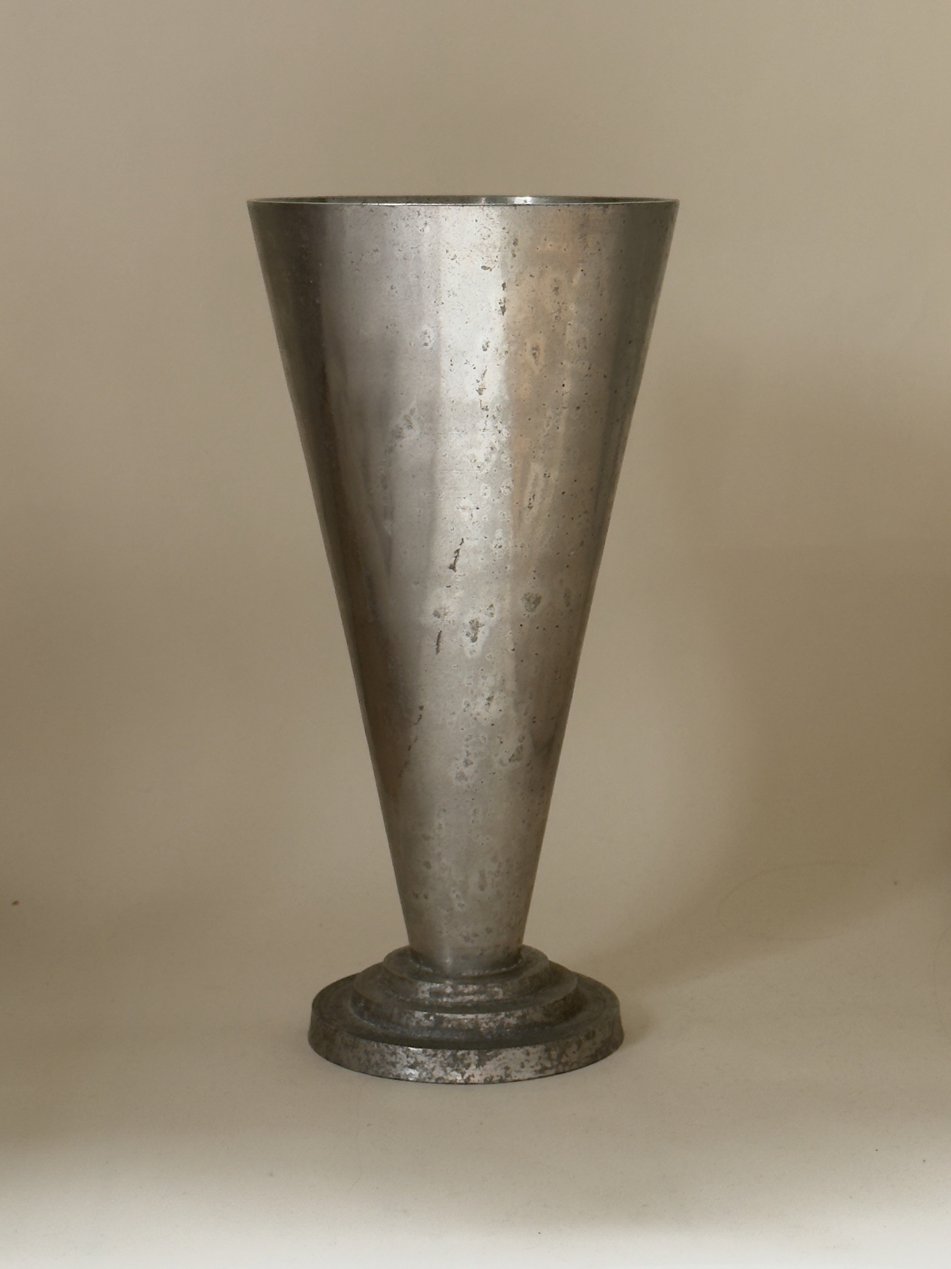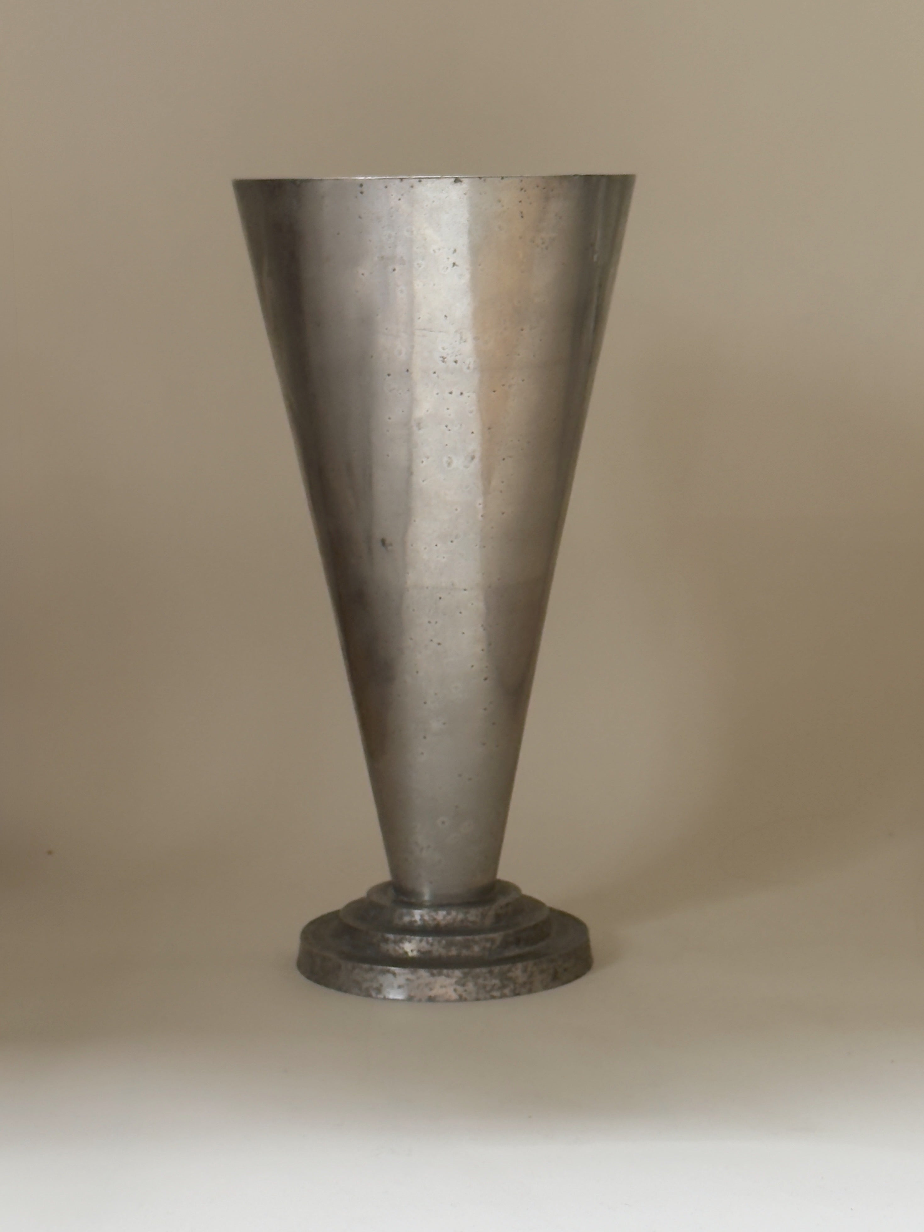 A striking and architectural vase, crafted in metal (likely aluminium) with a time-worn surface that lends it a compelling character. Its bold, conical form rises from a tiered circular base, creating a silhouette at once modernist and timeless. The natural patina softens the metallic sheen, adding depth and texture that speak to age and history.