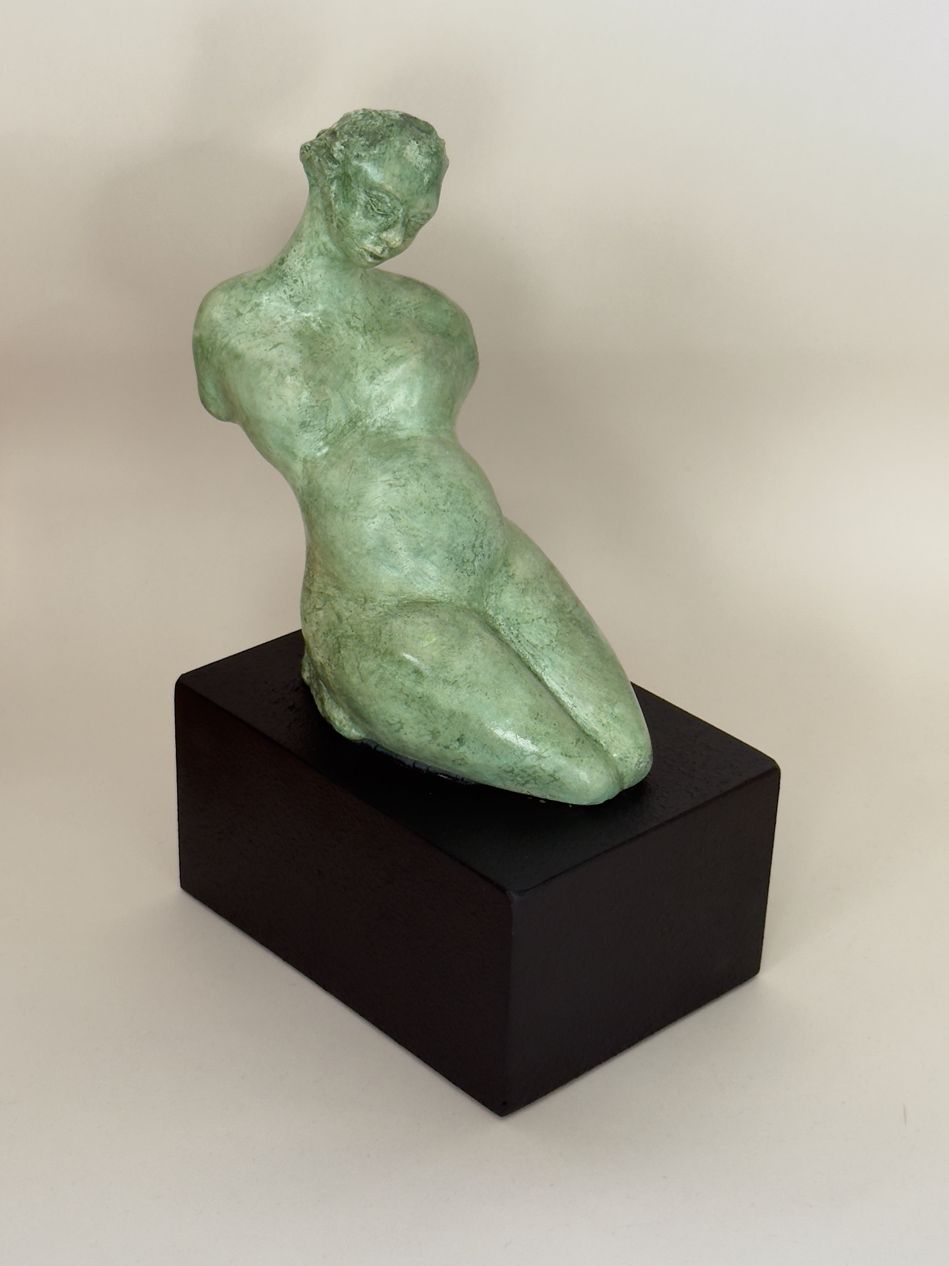 A sensitively modeled sculpture depicting a kneeling nude woman, her form imbued with quiet grace and introspection. Crafted in plaster with a mottled green patina, the figure’s fluid contours and poised geometry echo the refined sensuality of modernist and Art Deco sculpture — balancing softness with sculptural strength. Resting on a solid black granulated base, the piece radiates a serene, contemplative presence.