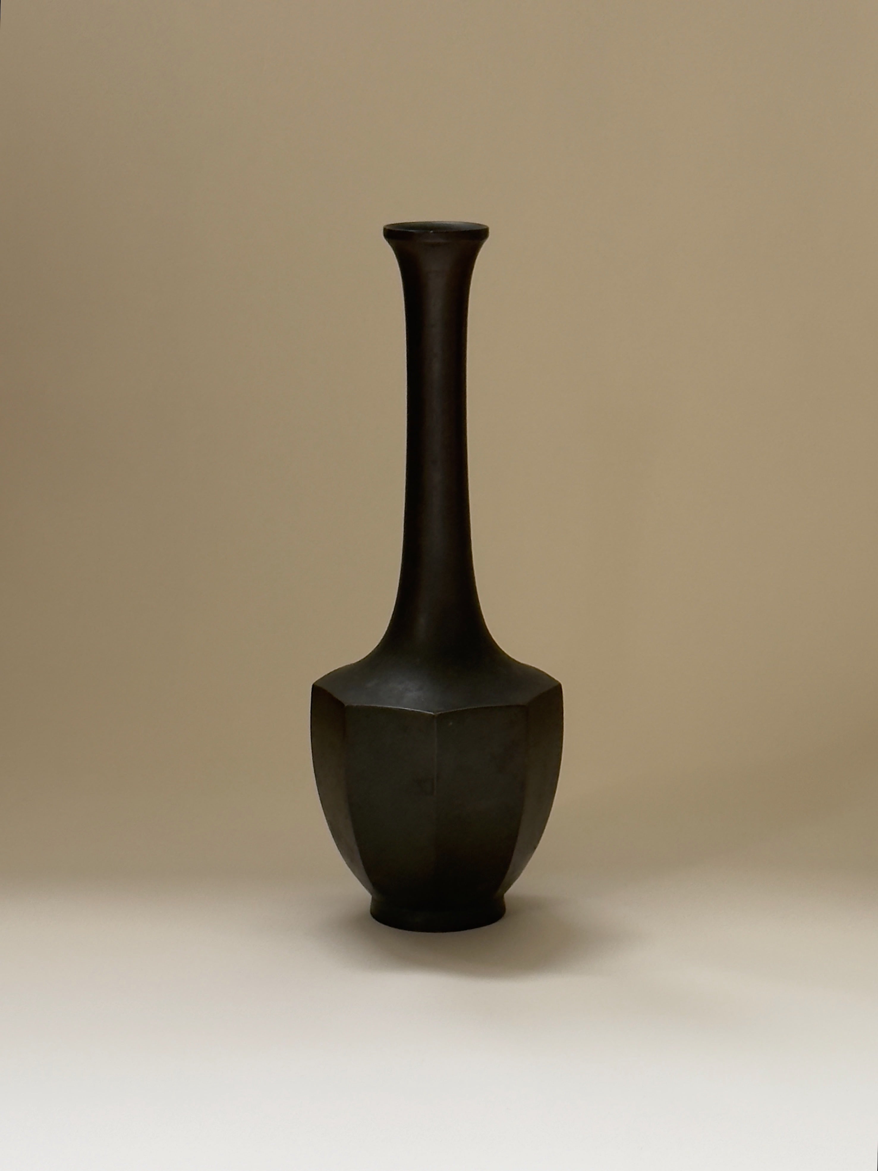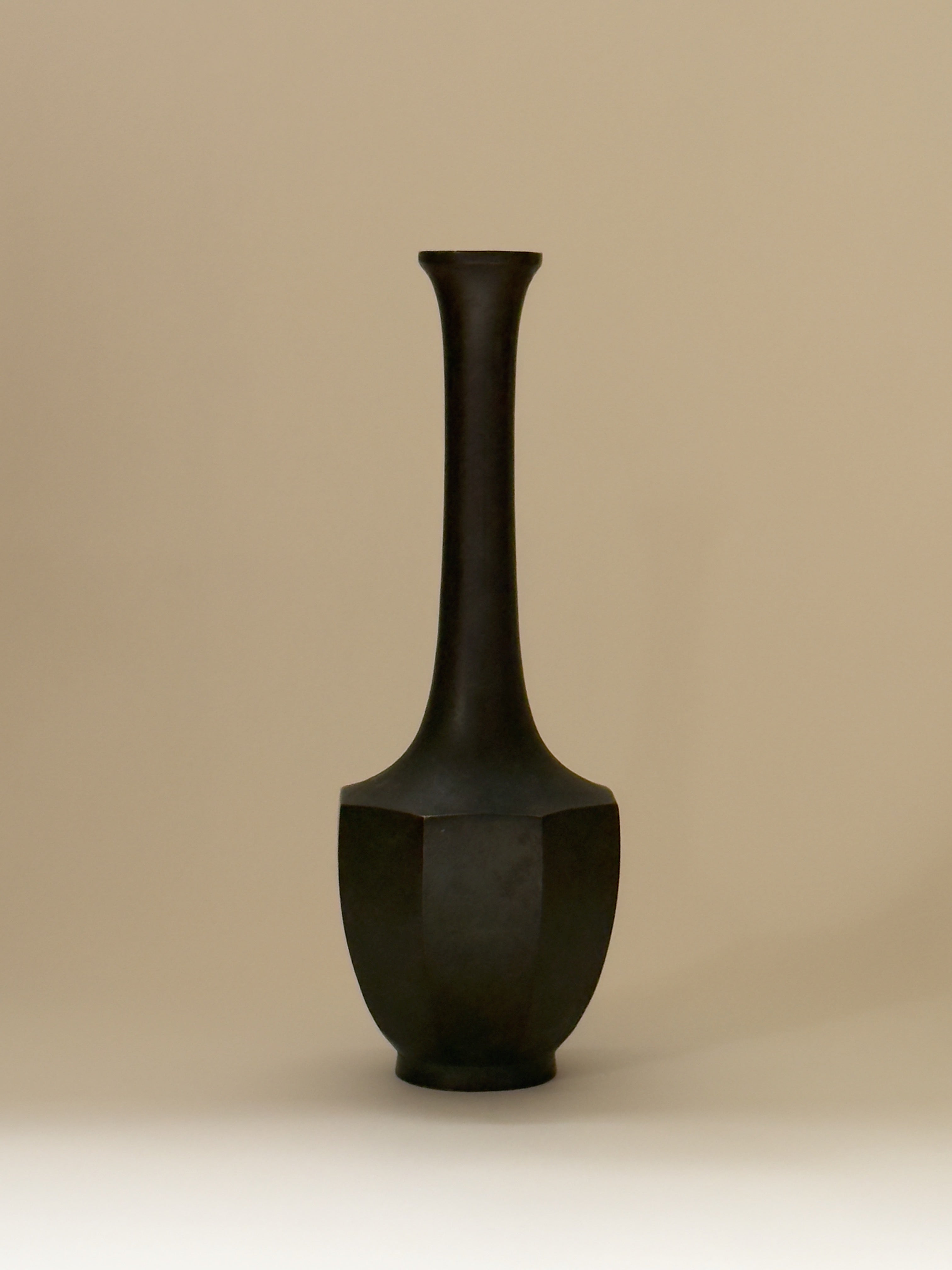 A refined Japanese bronze vase with an elegant octagonal body and a slender neck echoing the graceful curve of a crane. Crafted in a deep, green-toned bronze, the surface carries a subtle patina that enhances its quiet presence. Traditionally used in the context of the tea ceremony, the vase embodies a sense of ritual and reverence.