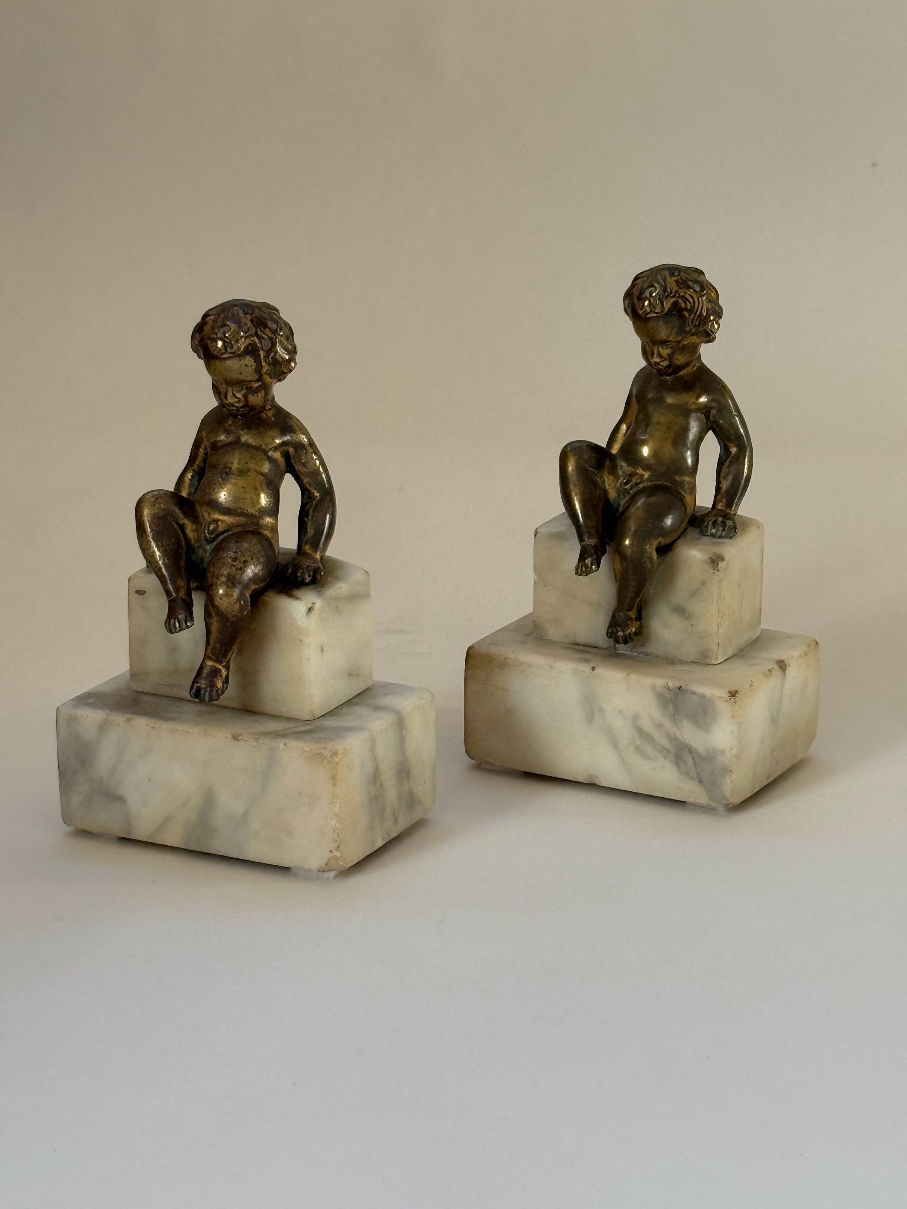A charming pair of antique bookends in bronze, each depicting a seated putto with softly modelled features and beautifully aged patina. The figures rest gracefully upon stepped stone plinths, creating an elegant contrast between the warm tones of the bronze and the cool solidity of the stone.