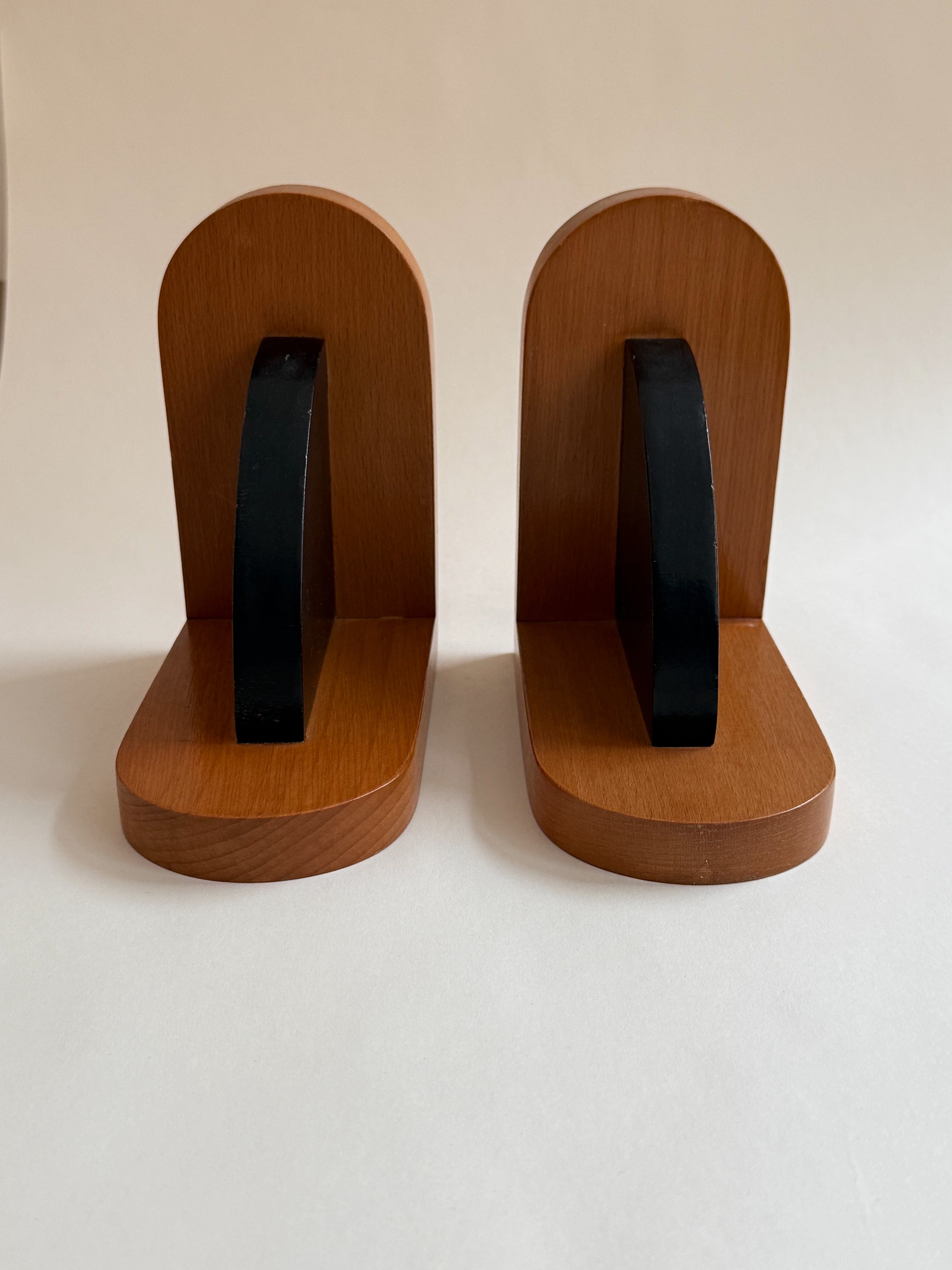 A sculptural pair of wooden Art Deco bookends, defined by their clean geometry and balanced proportions. Crafted entirely in wood, the design plays with contrast through form and finish, combining warm natural tones with darker, curved elements. The result is a restrained yet graphic composition, characteristic of the Art Deco period’s interest in symmetry, rhythm, and architectural clarity.