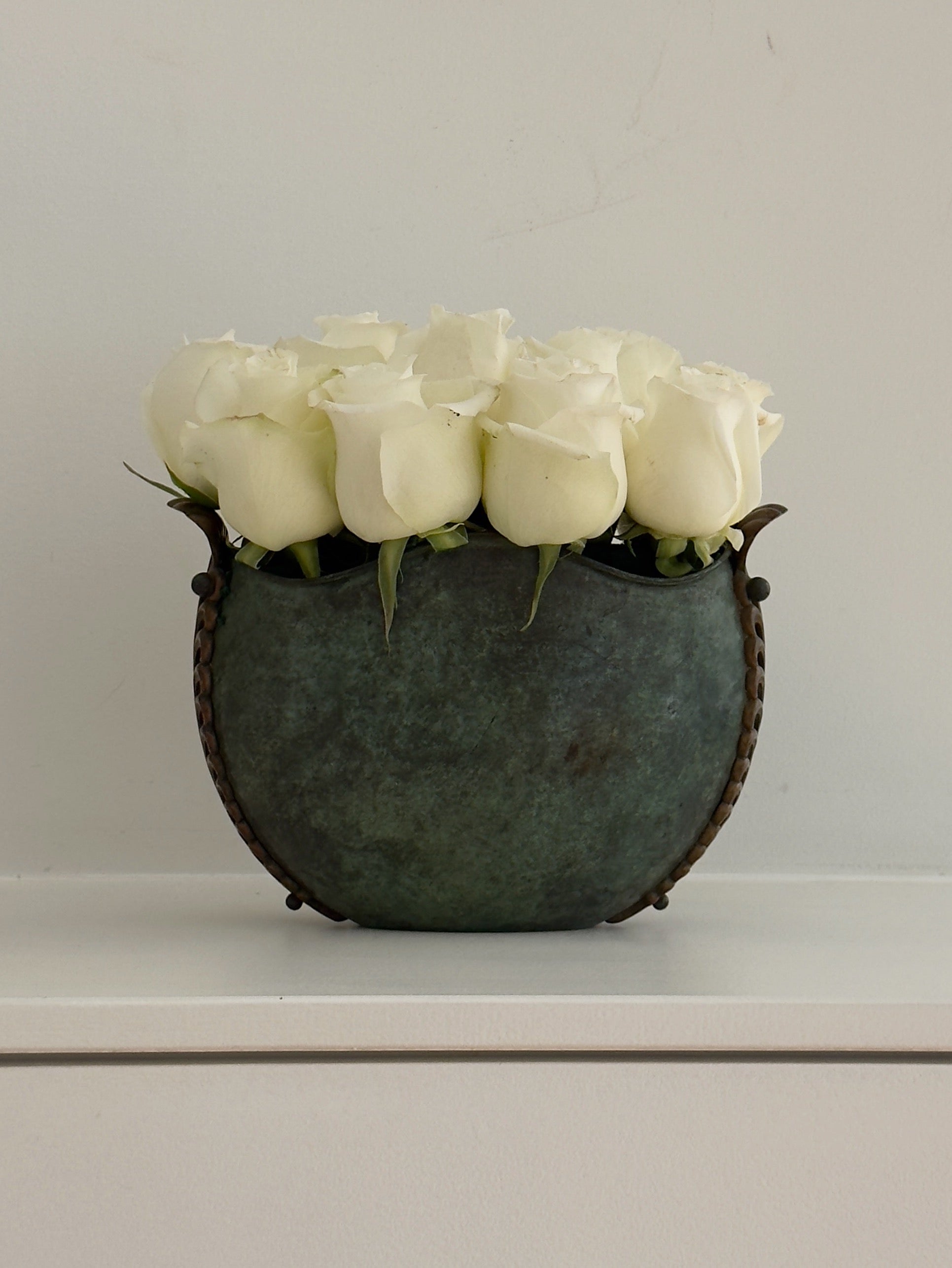A striking bronze vase from Italy, early 20th century, with a sculptural presence that balances weight and elegance. The vessel’s rounded form rests on a sturdy base, while the warm patina enhances its surface with depth and character. Its proportions make it equally suited as a decorative statement or as a vessel for flowers.