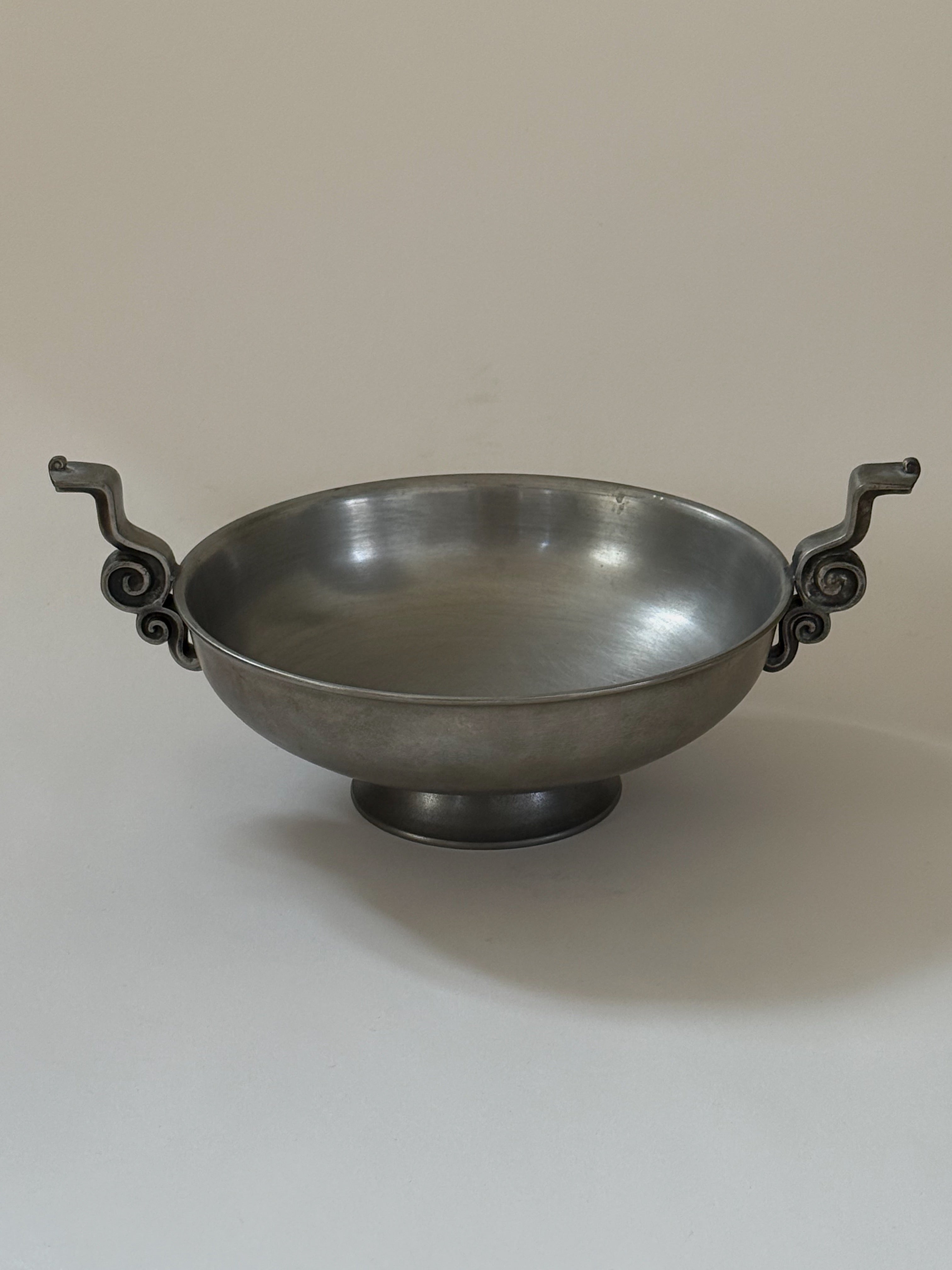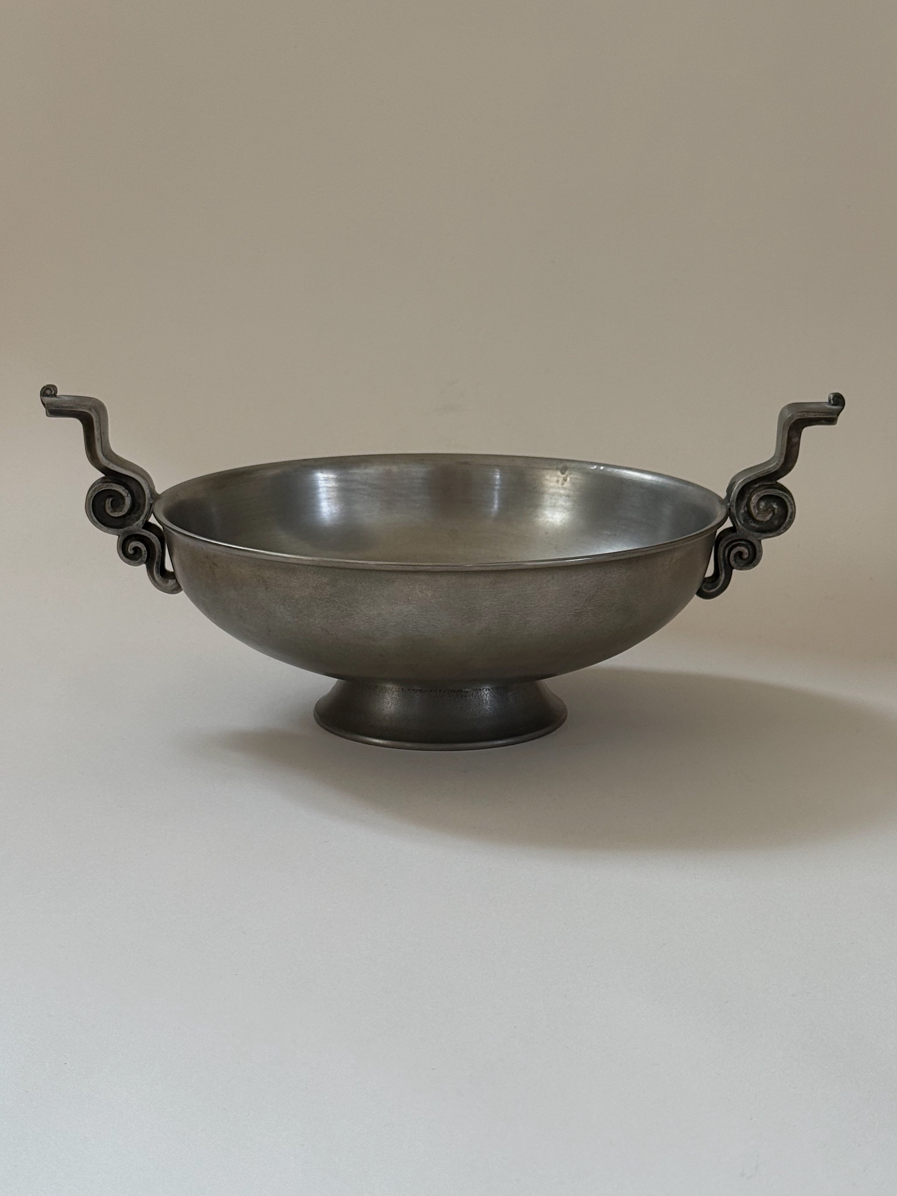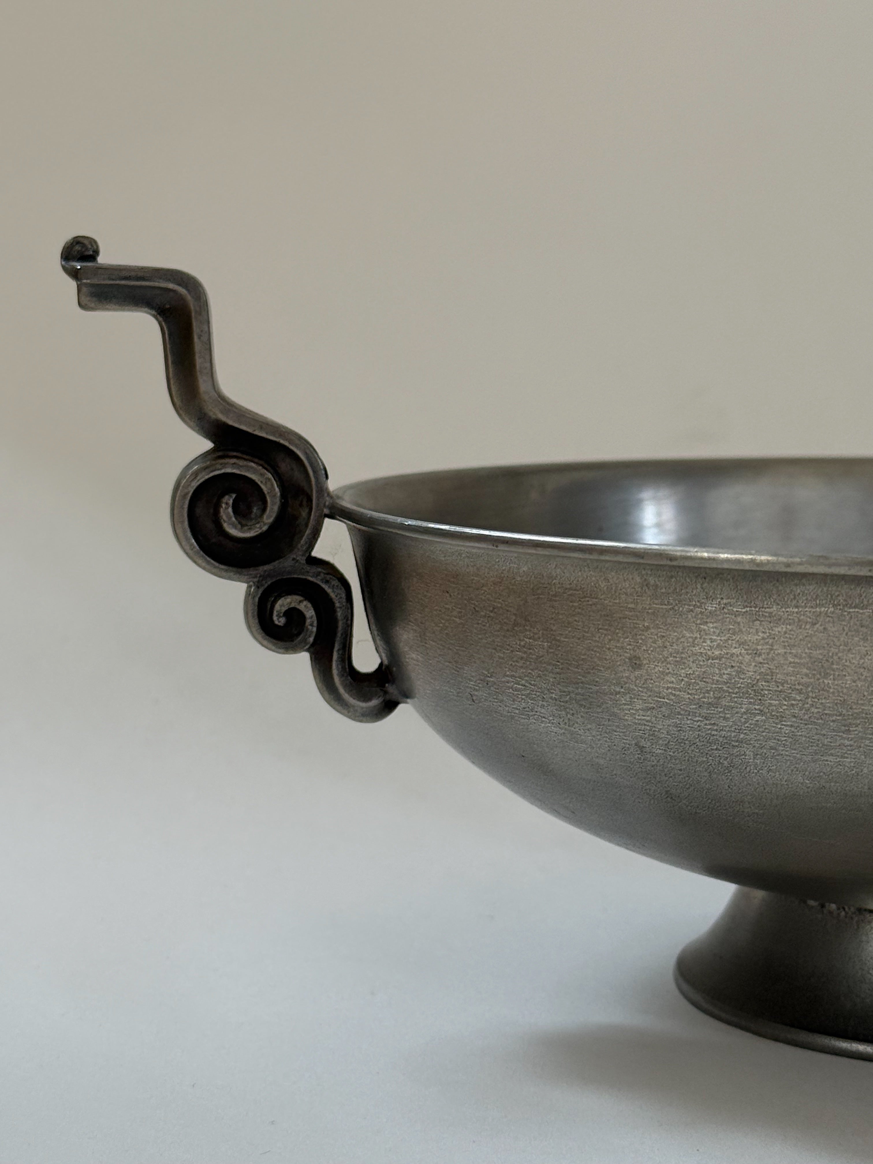 A beautifully proportioned pewter bowl elevated on a circular foot, flanked by sculptural scroll handles of distinctly classical character. The silhouette is both restrained and expressive, with the handles introducing a sense of movement that contrasts elegantly with the calm, rounded body of the vessel.