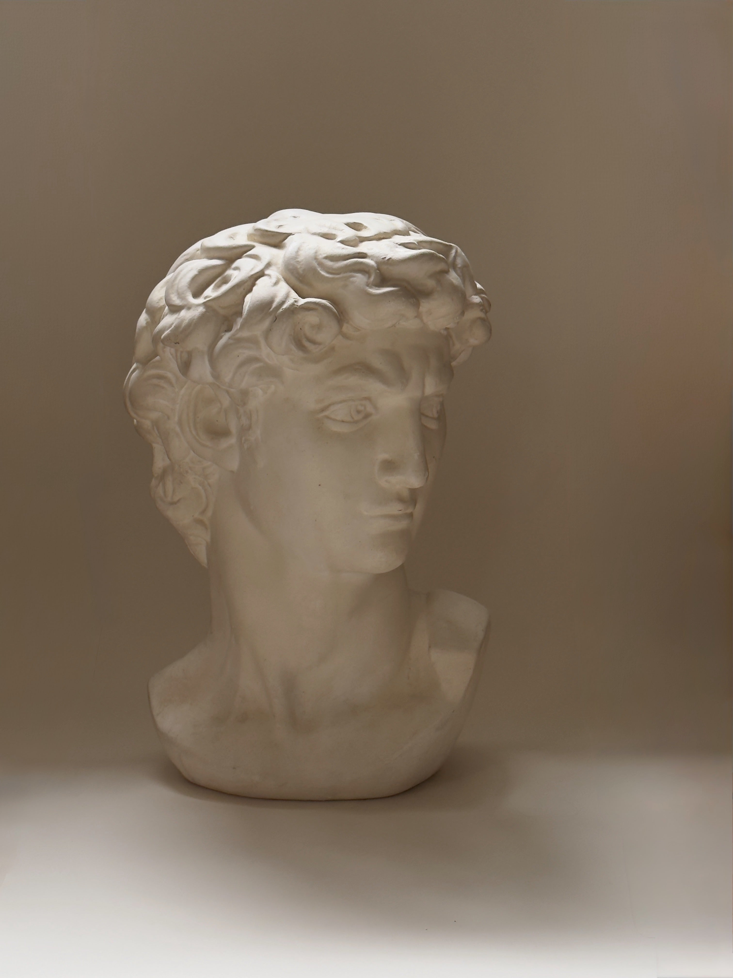 A timeless plaster bust depicting Michelangelo’s David, one of the most celebrated masterpieces of Renaissance art. This finely modelled study captures the noble profile and sculptural strength of the original, distilling its heroic presence into an intimate scale.