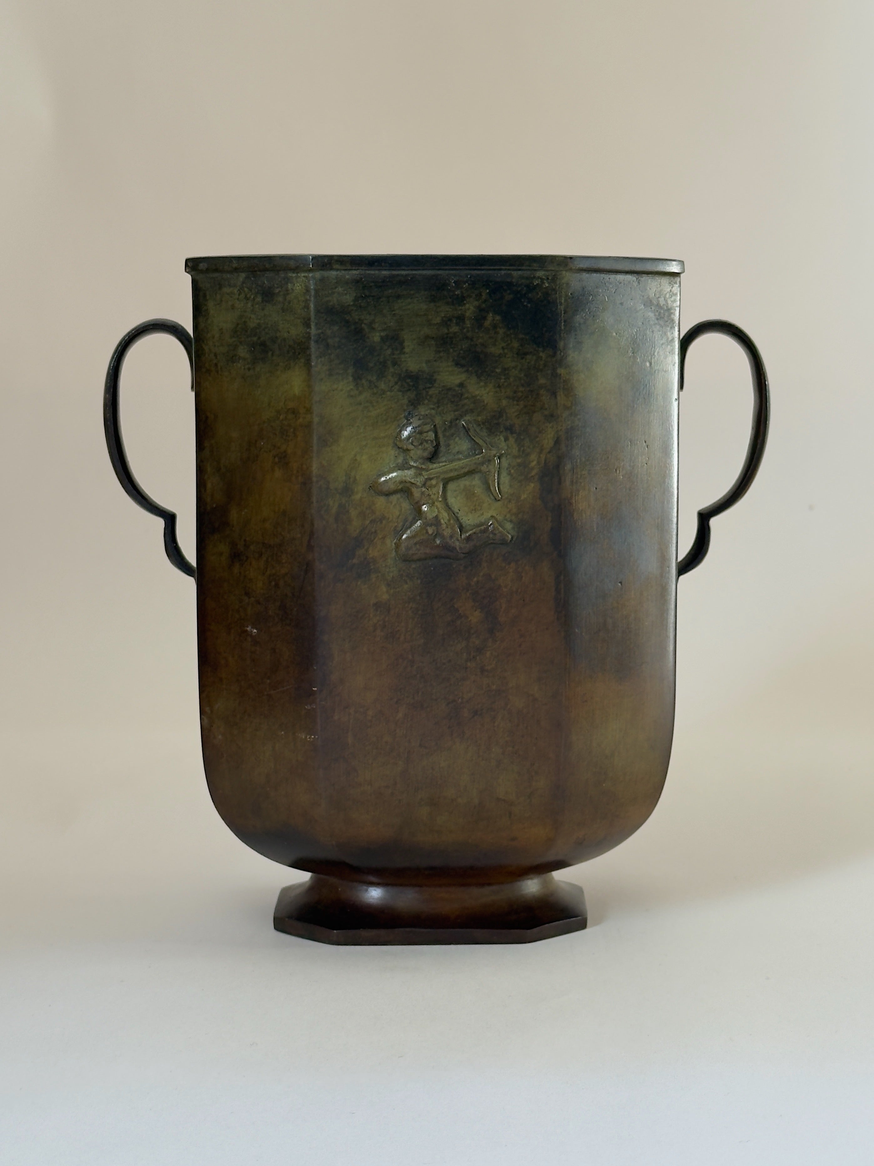 The vessel is defined by its balanced proportions and restrained elegance. A softly faceted body rises from a stepped foot, flanked by delicate curved handles that lend the piece a subtle architectural rhythm. At the centre, a small relief motif of a youthful archer adds a playful yet refined decorative element.