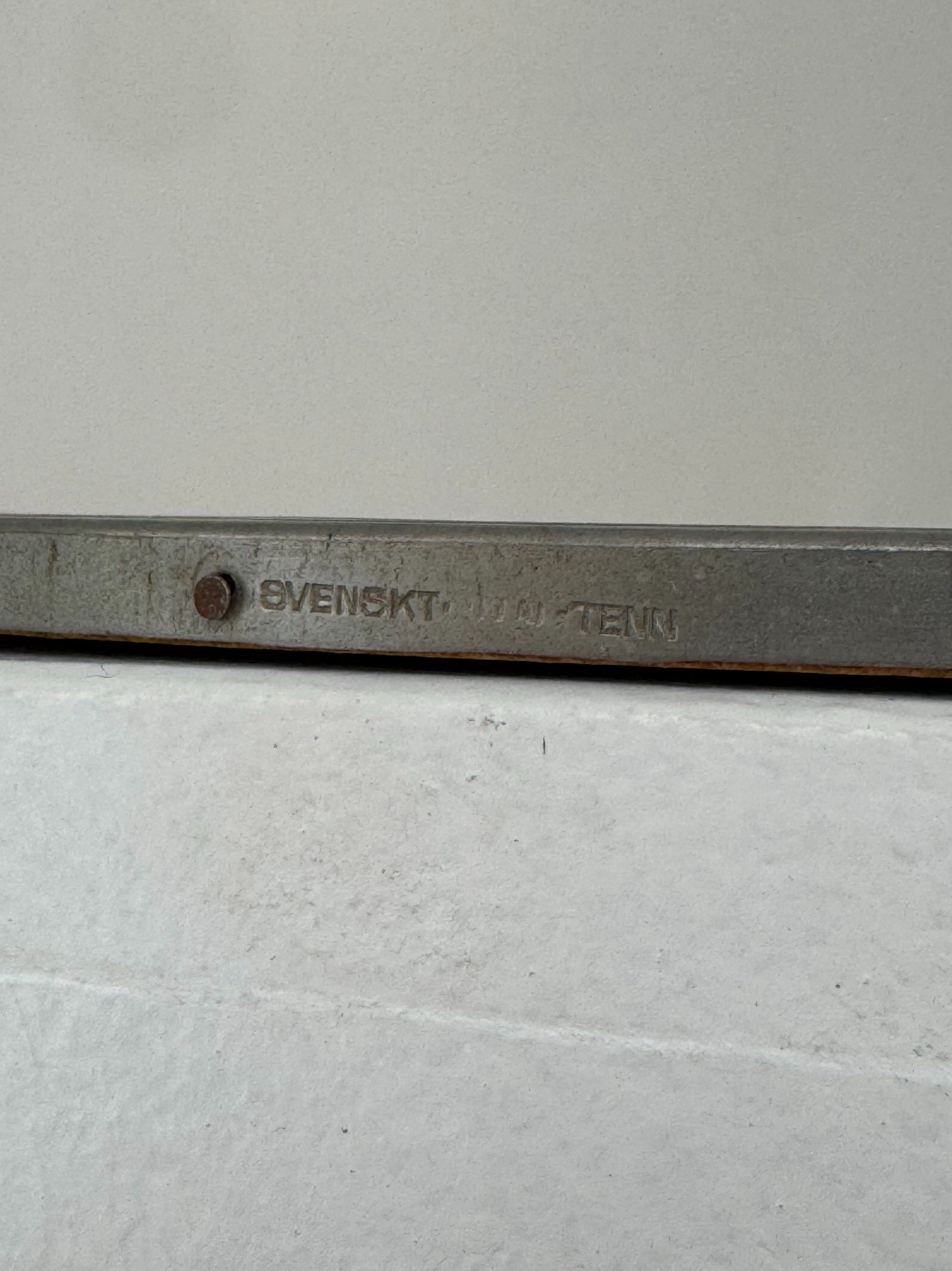 An exquisite Art Deco mirror from the 1930s/40s, crafted in pewter and crowned with a sculptural figure of an archer. Marked Svenskt Tenn. The elegant circular form is elevated by the poised silhouette above, a detail that adds both movement and symbolism to the piece.