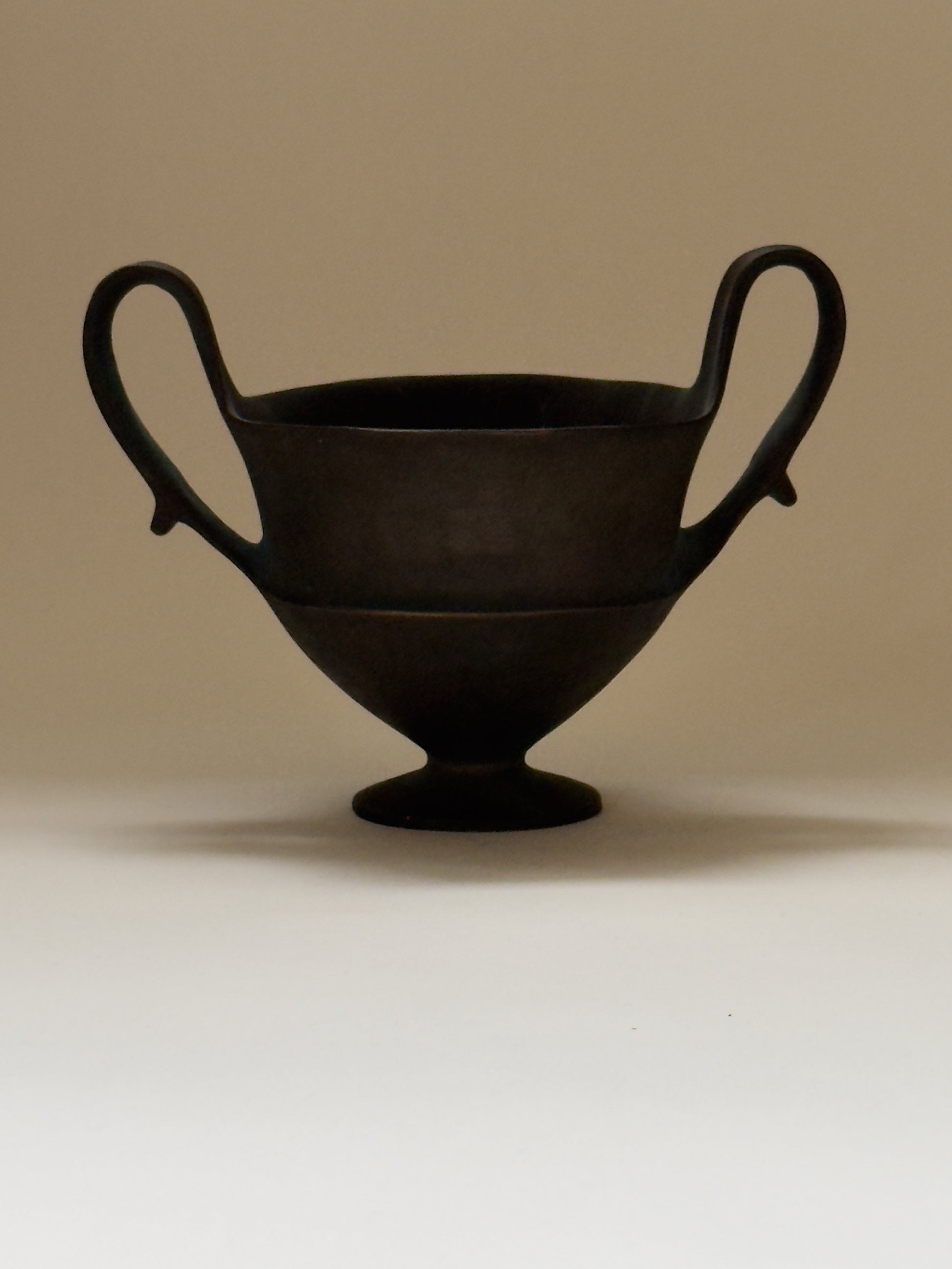 A sculptural interpretation of the ancient kantharos, this patinated bronze bowl draws inspiration from 6th-century Etruscan drinking vessels once used at symposia—ritual gatherings where wine, conversation, and philosophy flowed freely. With its sweeping high handles and flared form, the piece echoes classical iconography often associated with Dionysus, god of wine and revelry.