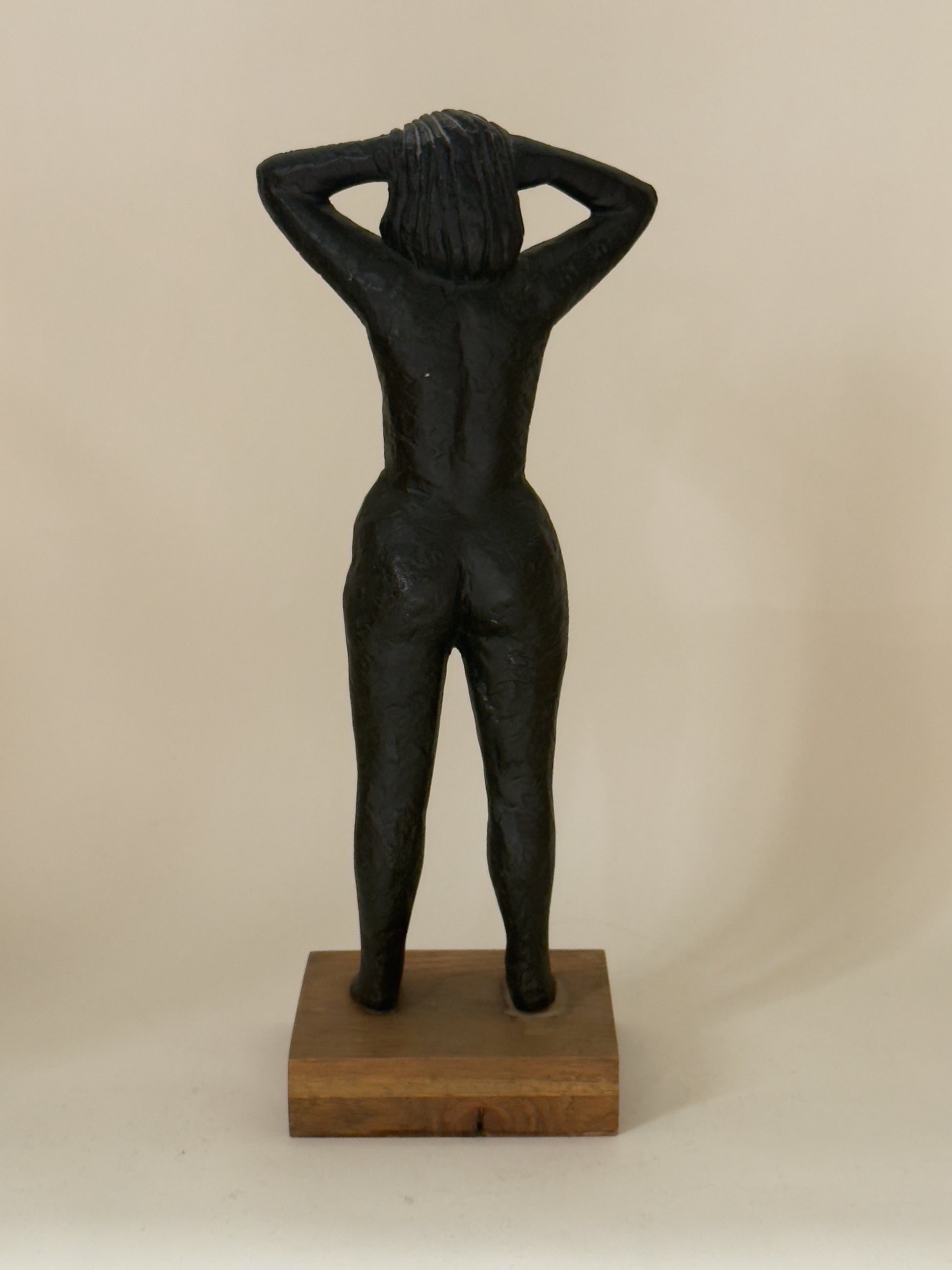 A striking sculpture in cast iron by Swedish artist Eric Elfvén (1921–2008), mounted on its original wooden plinth. Signed and dated 1957, the work captures a poised female figure, her form distilled into a timeless, modernist silhouette. The weight and texture of the iron lend the piece a sense of quiet gravity, while the vertical stance conveys elegance and strength.