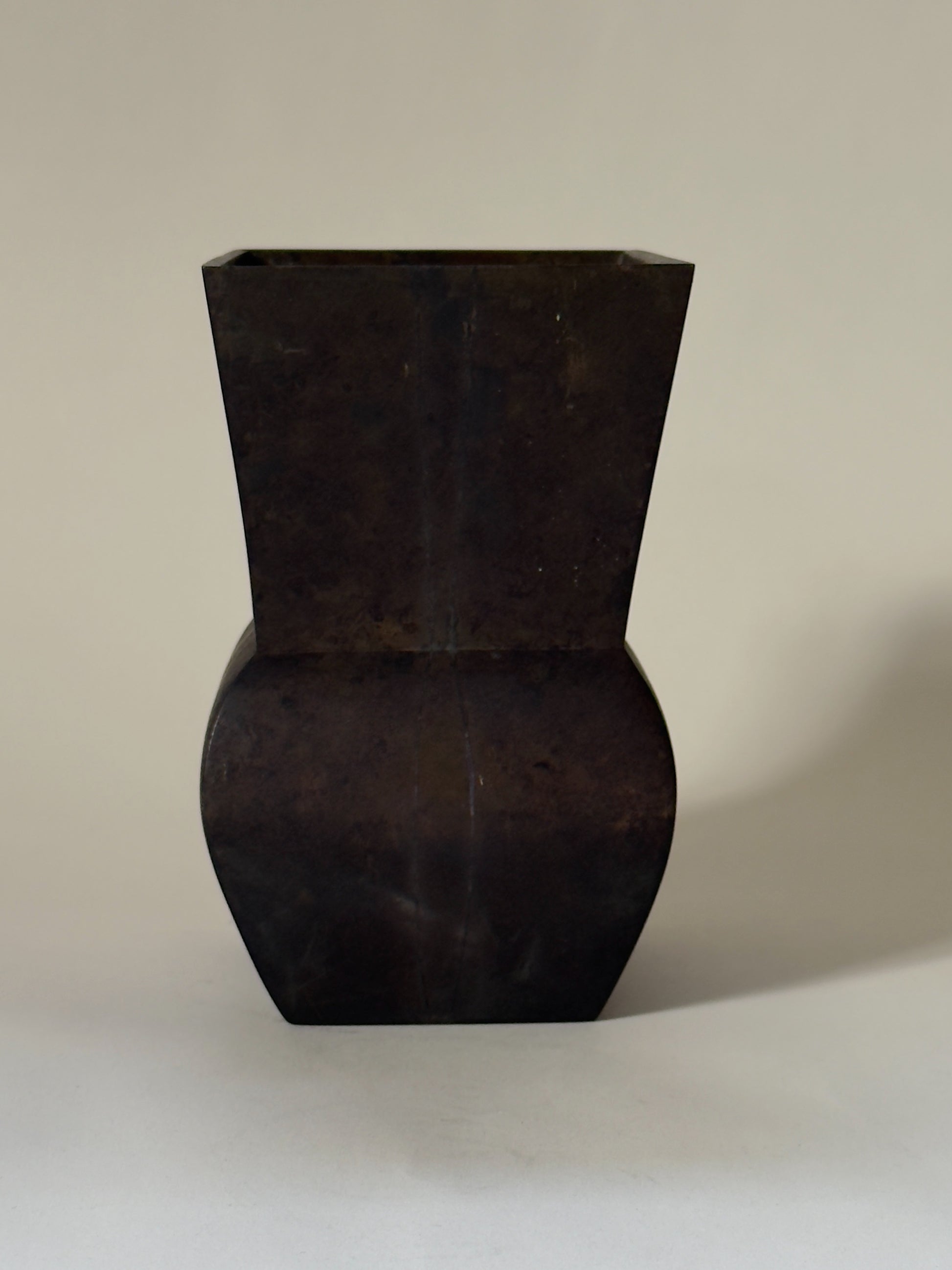 A striking Japanese bronze vase from the 1950s, defined by its bold geometric silhouette and rich, time-worn patina. The hand-crafted form combines sharp architectural lines with a sculptural fullness, accentuated by subtle variations in surface tone—from deep bronze to warm copper hues. The base is inscribed with Chinese characters, adding a further layer of history and significance to the piece. Both a vessel and a sculptural object, it embodies the refined artistry of mid-century Japanese metalwork.