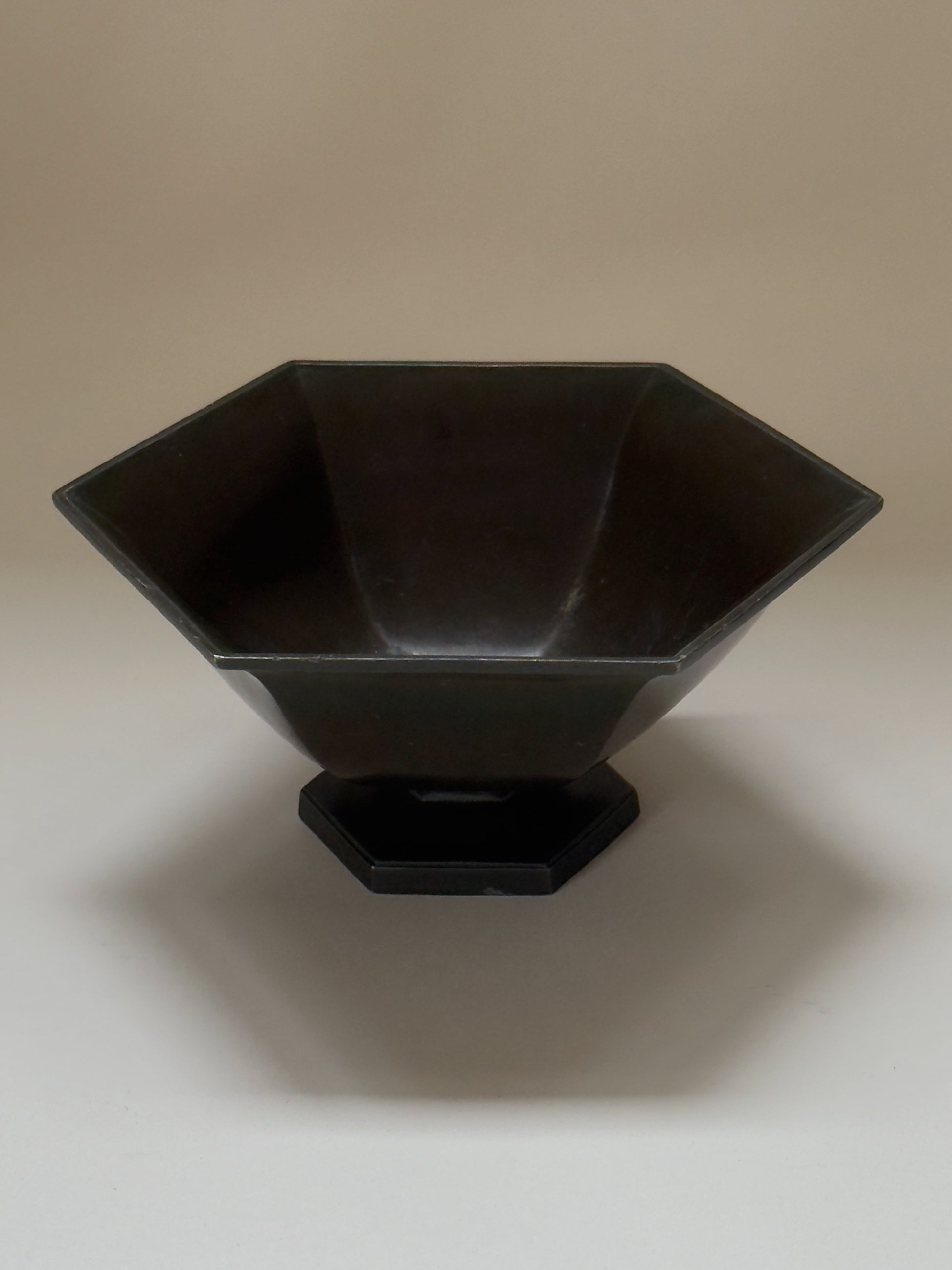 A stunning and highly sought-after hexagonal bowl on foot by the esteemed Danish designer Just Andersen (1884–1943). Crafted in his signature Disko metal, an alloy he invented, this piece exemplifies Andersen’s mastery of material and form.