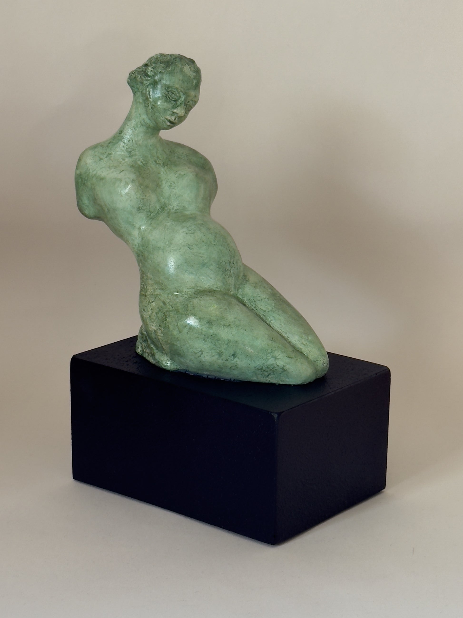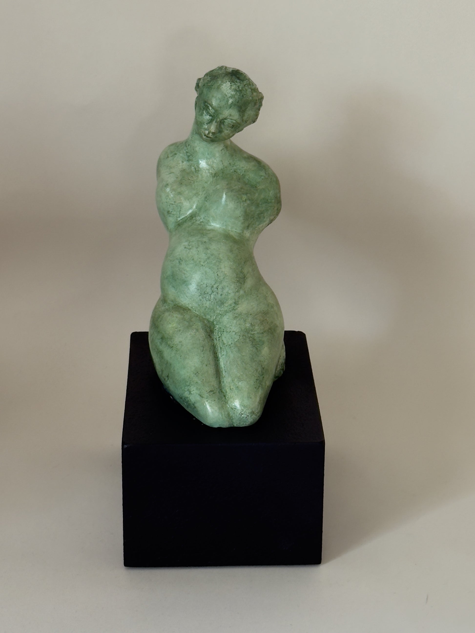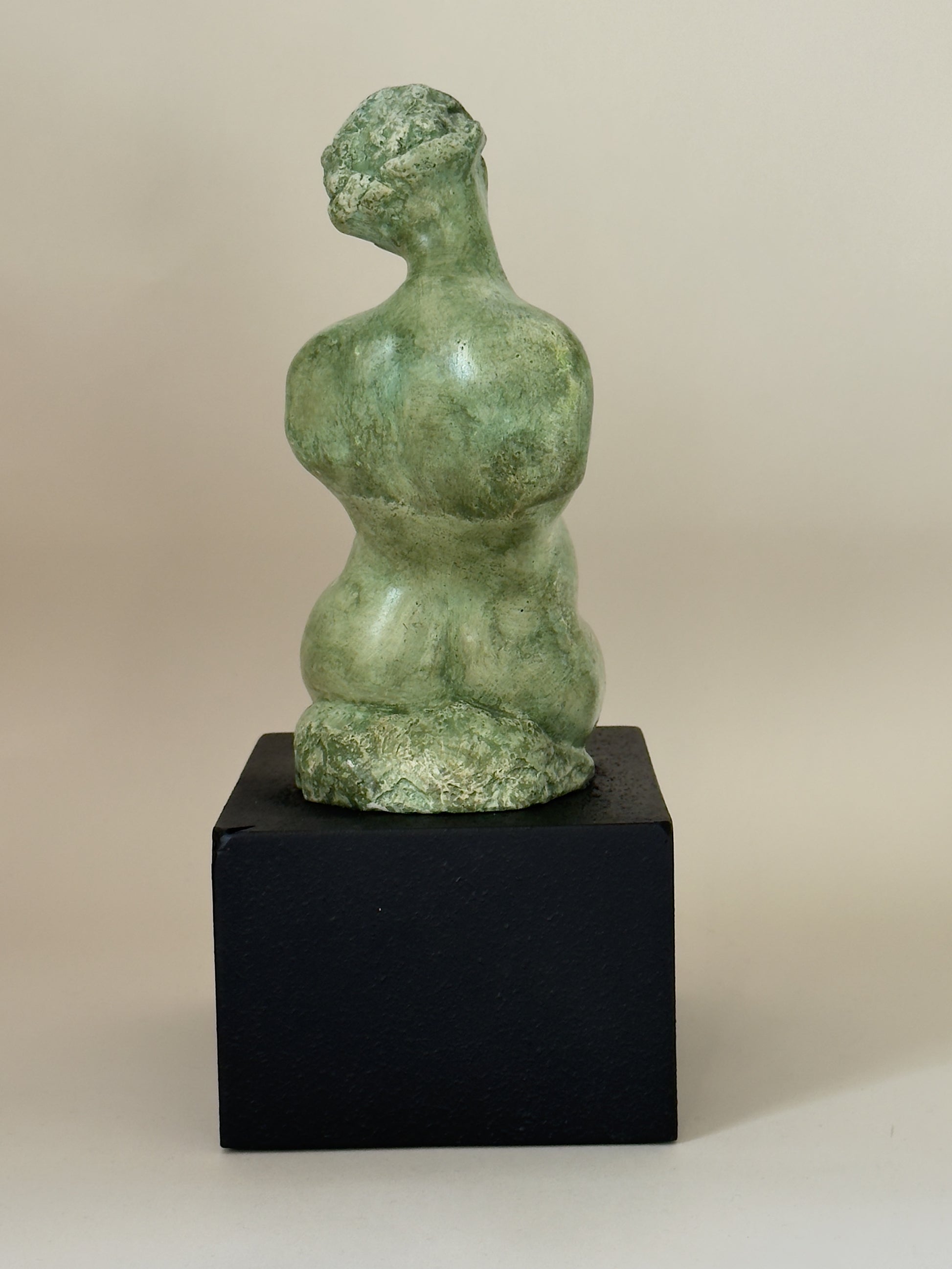 A sensitively modeled sculpture depicting a kneeling nude woman, her form imbued with quiet grace and introspection. Crafted in plaster with a mottled green patina, the figure’s fluid contours and poised geometry echo the refined sensuality of modernist and Art Deco sculpture — balancing softness with sculptural strength. Resting on a solid black granulated base, the piece radiates a serene, contemplative presence.