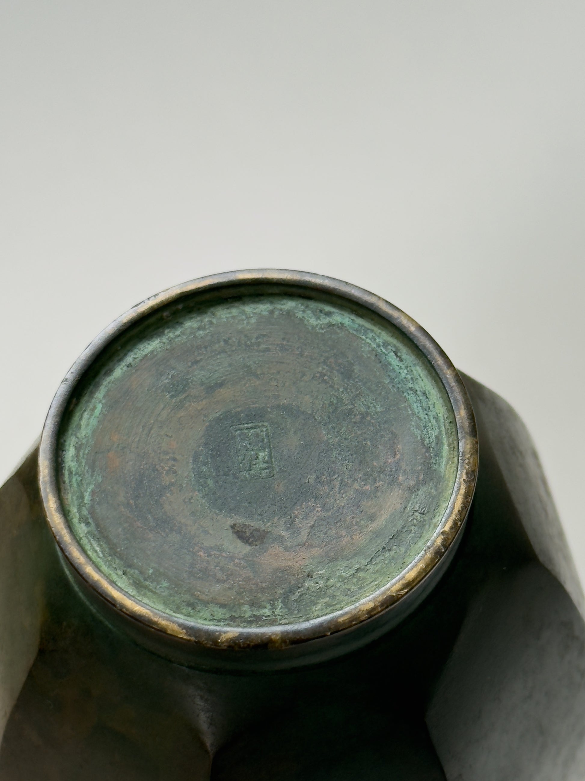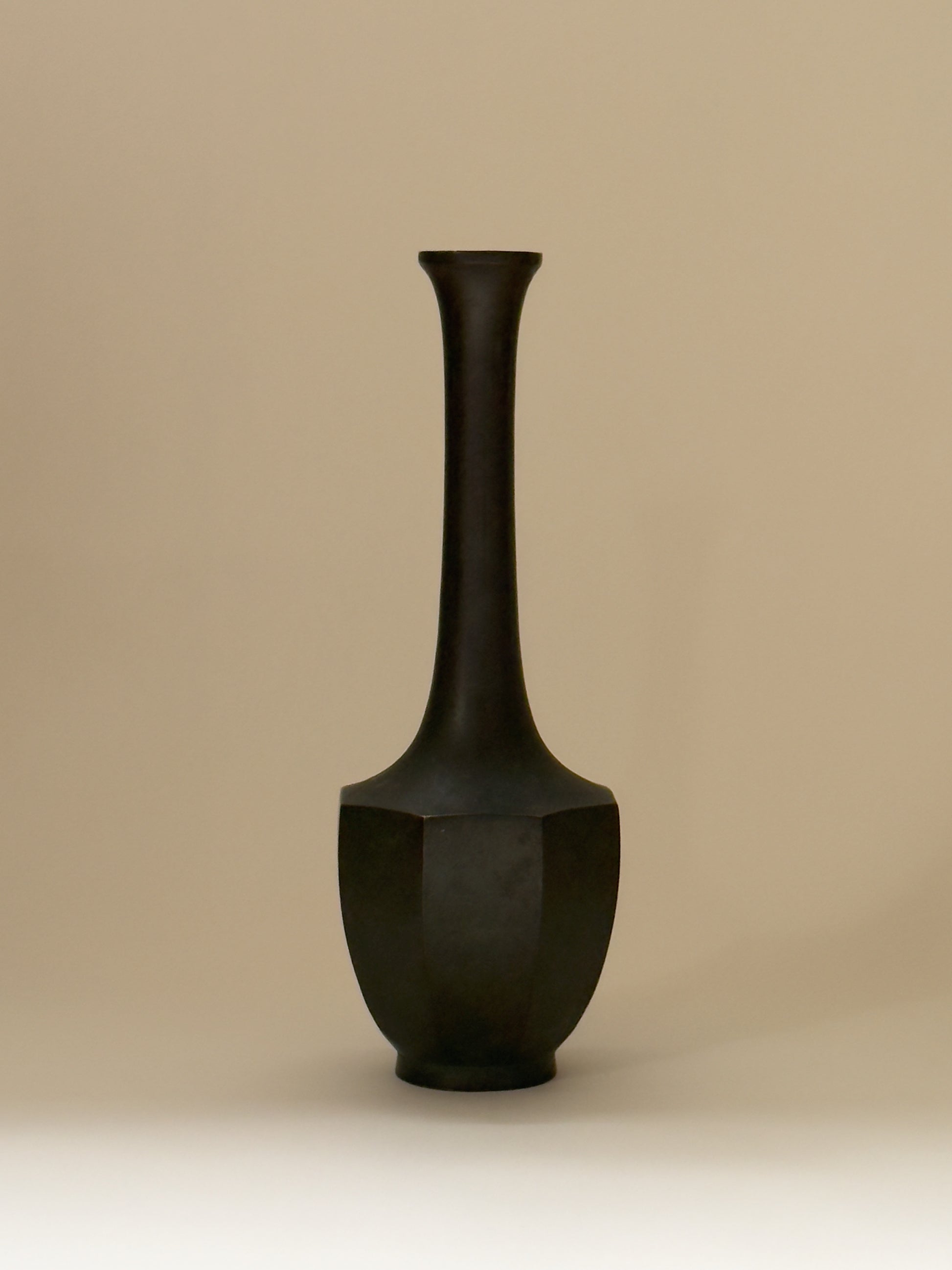 A refined Japanese bronze vase with an elegant octagonal body and a slender neck echoing the graceful curve of a crane. Crafted in a deep, green-toned bronze, the surface carries a subtle patina that enhances its quiet presence. Traditionally used in the context of the tea ceremony, the vase embodies a sense of ritual and reverence.