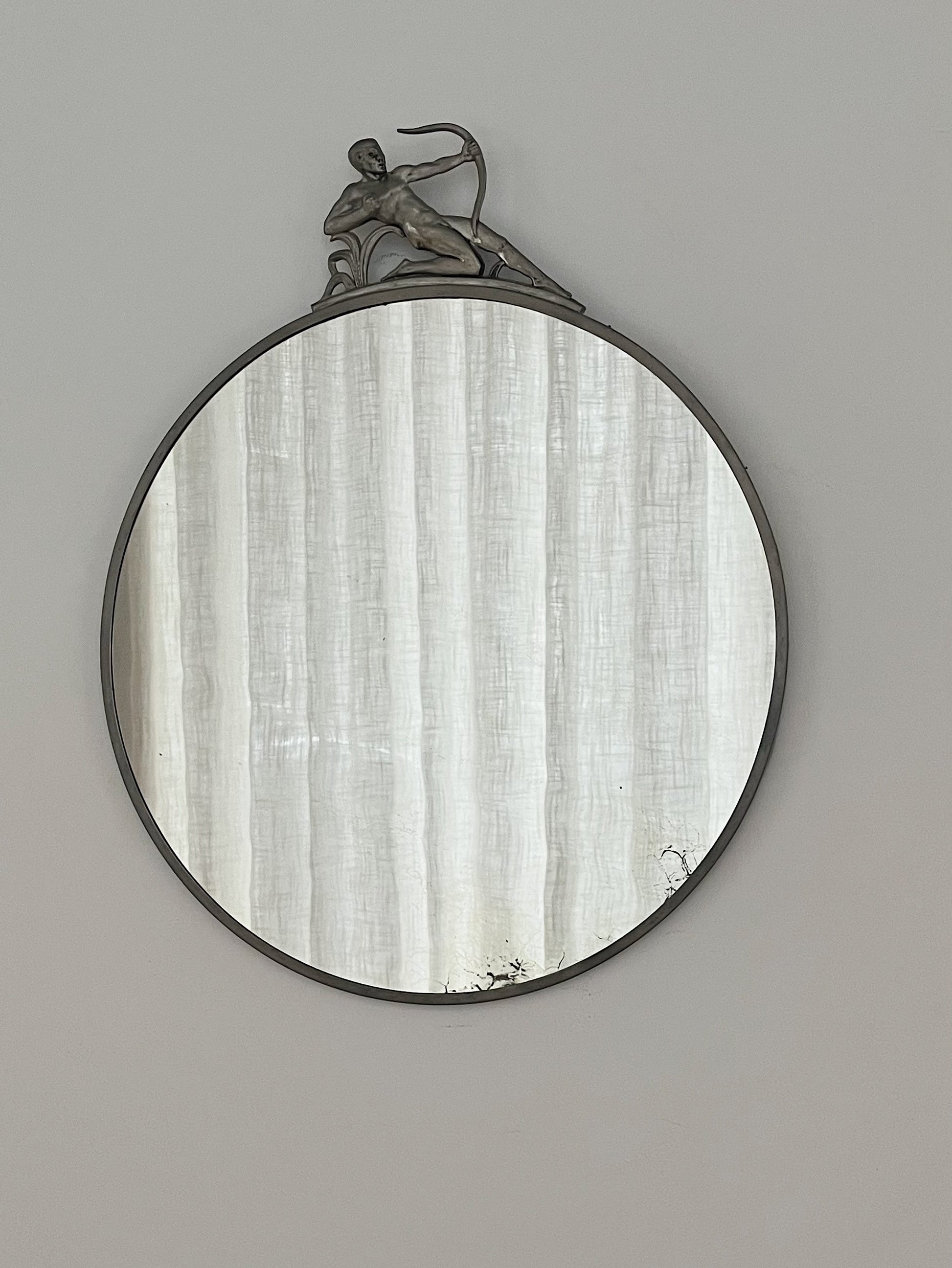 An elegant pewter mirror attributed to CG Hallberg, model 5412, dating from the Swedish Grace era of the 1930s. Circular in form, it is crowned with a striking sculptural figure of an archer, poised in dynamic motion and lending the piece a sense of strength and elegance. The mirror itself retains a soft, time-worn patina, beautifully complementing the refined simplicity of its frame. A true expression of Swedish Grace design, where classical influence meets modernist restraint, this piece embodies both artistry and function.