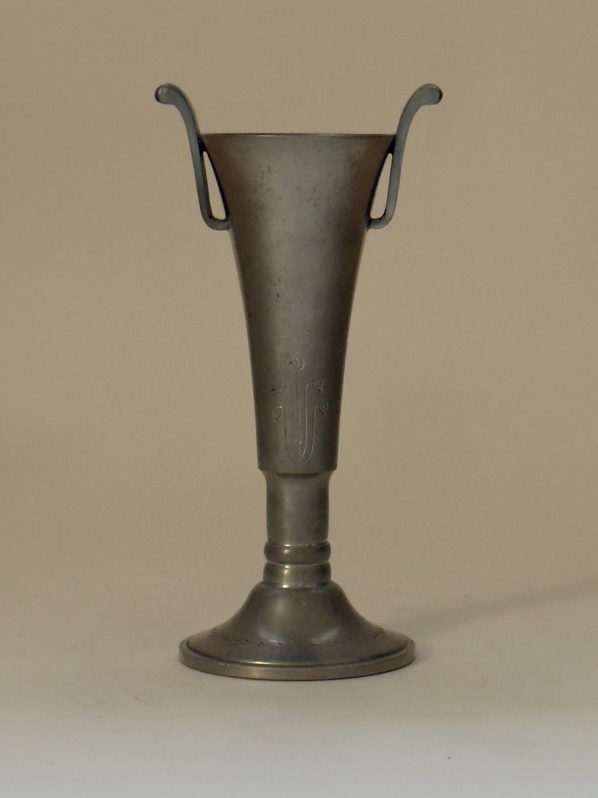 A delicate pewter vase in classic Swedish Grace style, crafted circa 1930 and marked Svenskt Tenn. This finely balanced piece rests on a slender foot and features twin ornamental handles with a stylised etched motif of Dicentra (Bleeding Heart) and foliage—an elegant nod to Nordic flora.